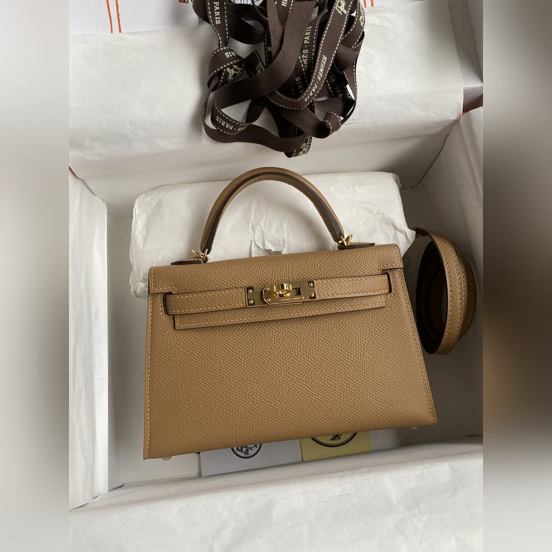 Kézzel varrott Mini Kelly II 19cm Epsom bőr keksz színű arany hardver