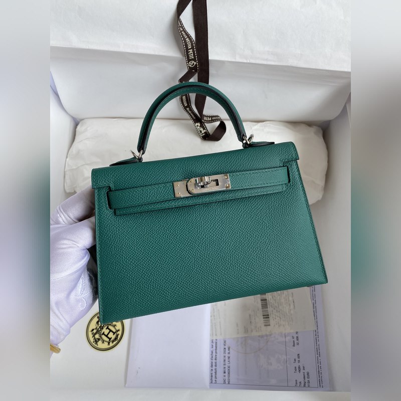 Hermès Mini Kelly 19 cm Epsom bőr páva zöld, ezüst hardverrel