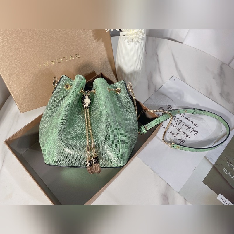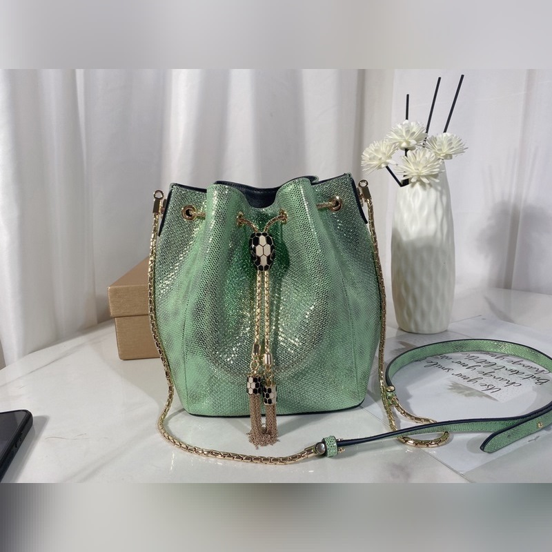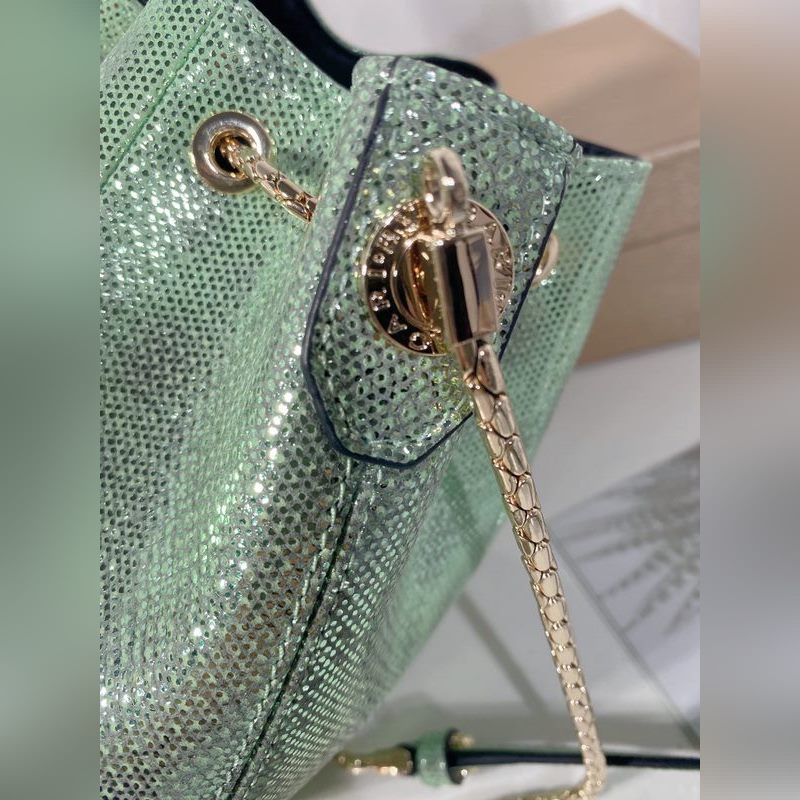 A “Serpenti Forever” család új remekművét köszönti: a divatos vödörtáskát. Ez a vödörtáska értékes sötétzöld fémes puha marhabőrből készült, praktikus húzózsinórral, kígyó léptékű témalánc dizájnnal és klasszikus zománcozott kígyófej csattal, valamint fekete ónix szemekkel díszítve, mely káprázatos és megindító megjelenést mutat. A levehető fogantyú és a kígyólánc könnyű aranyozott sárgarézből készült, így kényelmes viselet és sokoldalú. Kis méret, egyetlen tárolóréteg, belső fém névtábla, gravírozott BVLGARI Bulgari márka logóval.