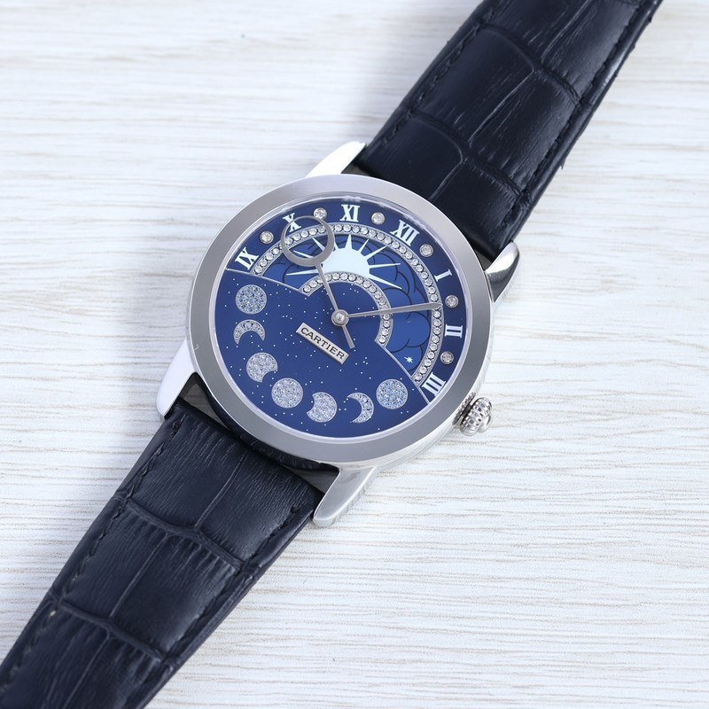 A nap, a hold és a csillagok luxus Loski valódi gyémántokkal, zafírüveg tükörrel, 316-os rozsdamentes acéllal polírozva, olasz bőr és rozsdamentes acél összecsukható csat, átmérő 42 mm, vastagság 10 mm, teljesen automatikus mechanikus mozdulattal és 28p pontossággal28p.