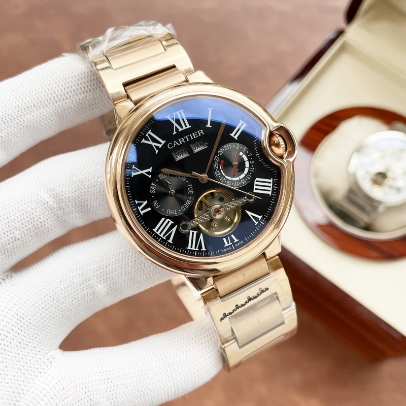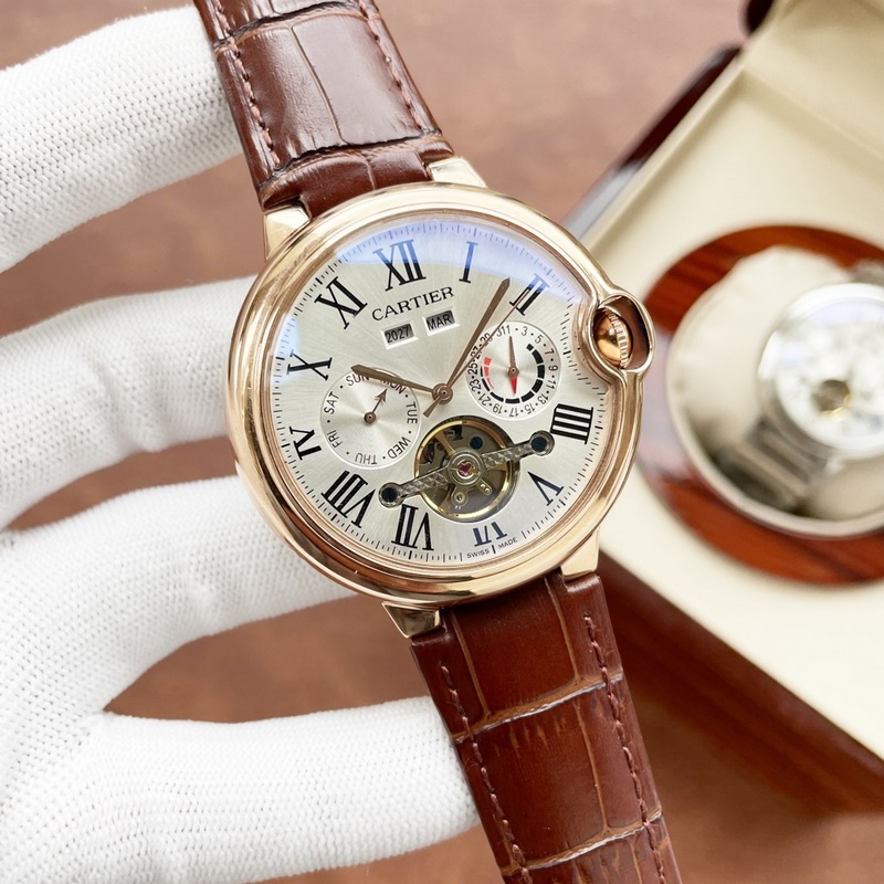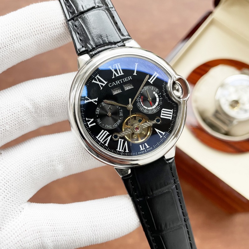 Cartier férfi karóra, multifunkcionális dizájn, igényes kivitelezés, eredetiség, nemes hangulat, úri stílus. Teljesen automatikus mechanikus mozgást alkalmaz, felső 316 rozsdamentes acél ház, importált borjúbőr szíj, ásványi szupertükör, 46 * 13 méret
