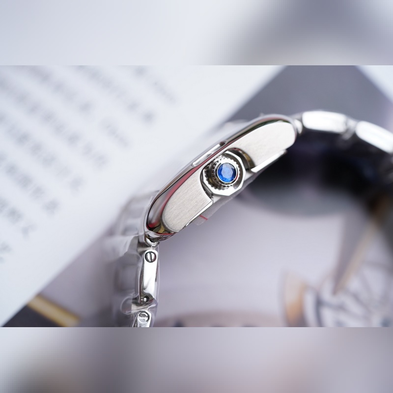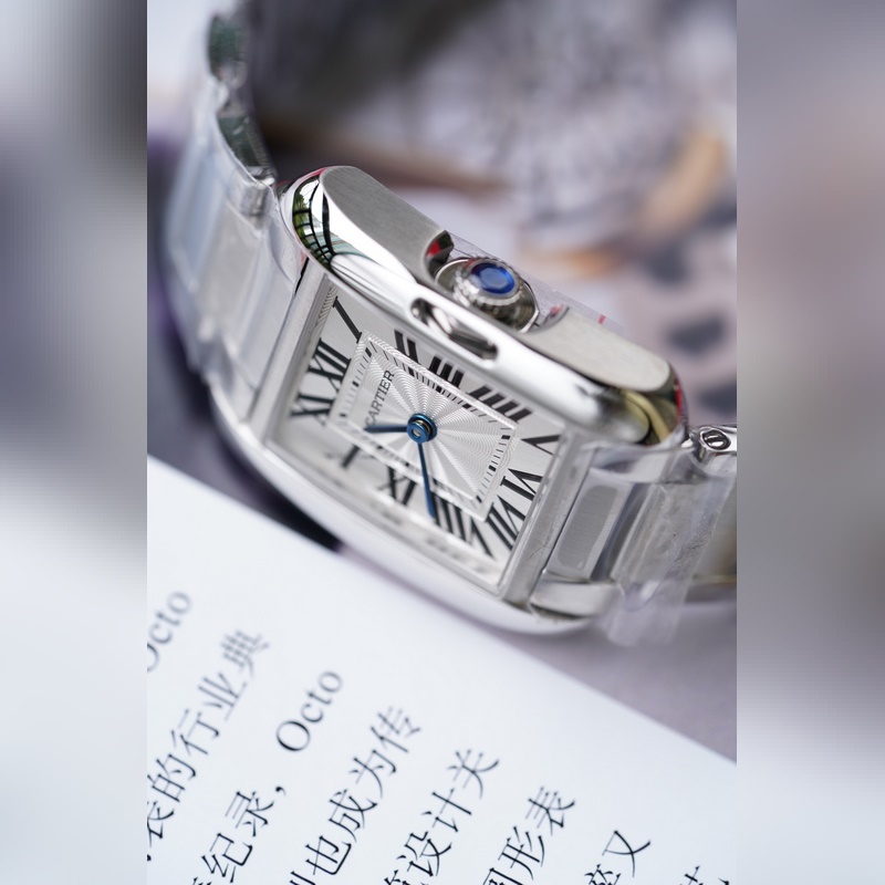 1: Tok/eredeti 3D szkennelés és másolás. A részletes adatok többszöri módosítása után biztosítják, hogy az eset teljes összhangban legyen a hiteles adatokkal. A klasszikus Tank tok kialakítása nagyban javítja a megjelenés textúráját. A vonalak harmonikusak és egyszerűek, az általános forma szélei pedig lekerekítettek és puhábbak. 2. ábra: Korona/Az ikonikus kilencsarkú korona háromdimenziós és átlátszó, ami kényelmes az idő beállításához. Kizárólag importált eredeti ércet használ (az eredeti sokoldalú spinell átlátszó és orchidea). A tiszta kézzel készített ára rendkívül magas, ami hatékonyan biztosítja, hogy minden termék megjelenése összhangban legyen az eredetivel.