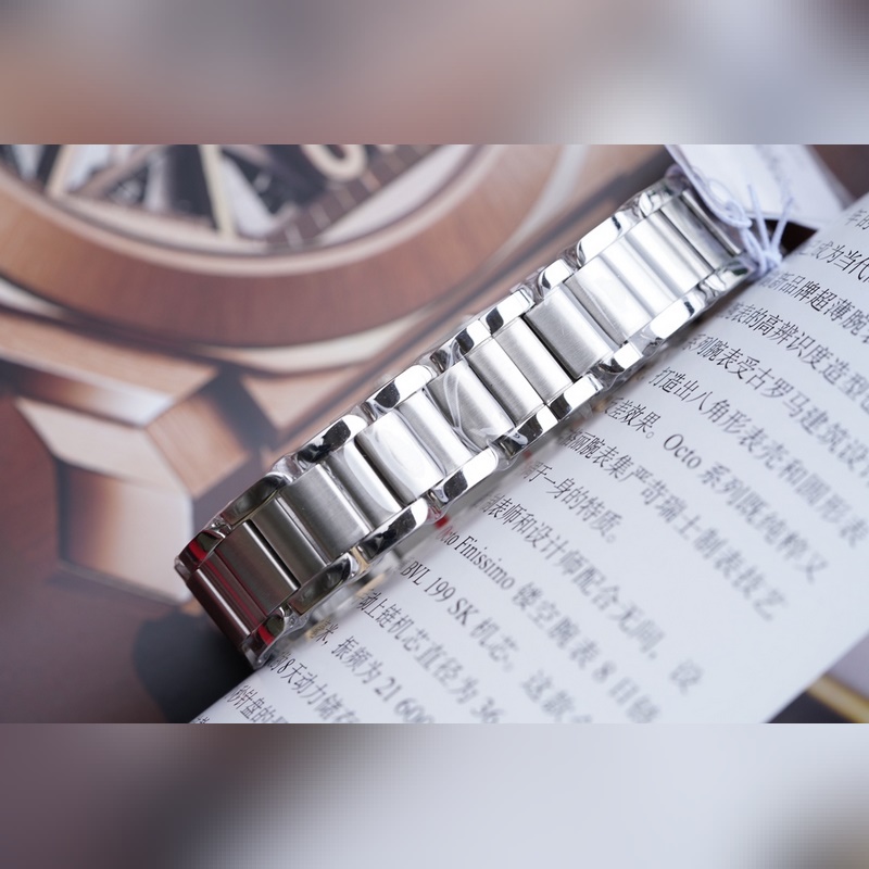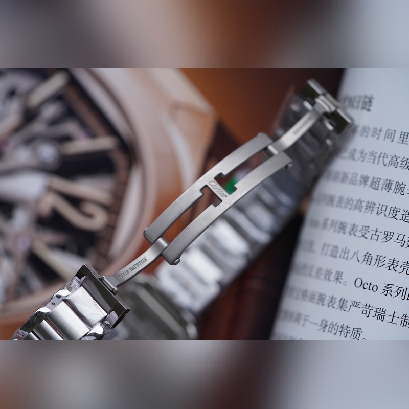 Importált amerikai aligátort használnak, és több szín választható. Mindegyik ellenőrizhető és ellenőrizhető online. Az eredeti, 1:1 arányú összecsukható csat könnyen viselhető, jól illeszkedik és kényelmes. Az acélszalag minden része az eredeti mozgatható rázócsavaros technológiát alkalmazza, amely hatékonyan elkerüli a viselés közbeni leesés kínos helyzetét. Az általános polírozás kitűnő, a csillogás pedig hullámzó. A szerkezet kompakt, rugalmas és nyomás nélkül cserélhető.