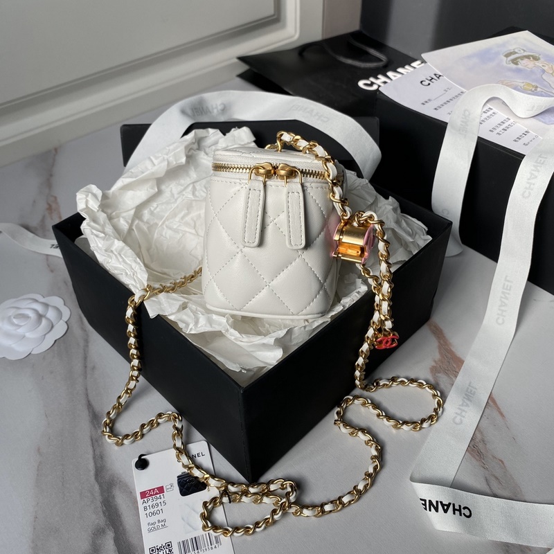 A Chanel 24A új kozmetikai táska, A 3941 kicsi és igazán remek. A nagy értékű zománc logó és a dupla C-beállító csat a kiemelés. Egyre jobban szeretem ezt a kozmetikai táskát. Nagyon szép magával vinni. Bármilyen ruhával teljesen széppé tud tenni. Mérete 11×8,5×7 cm