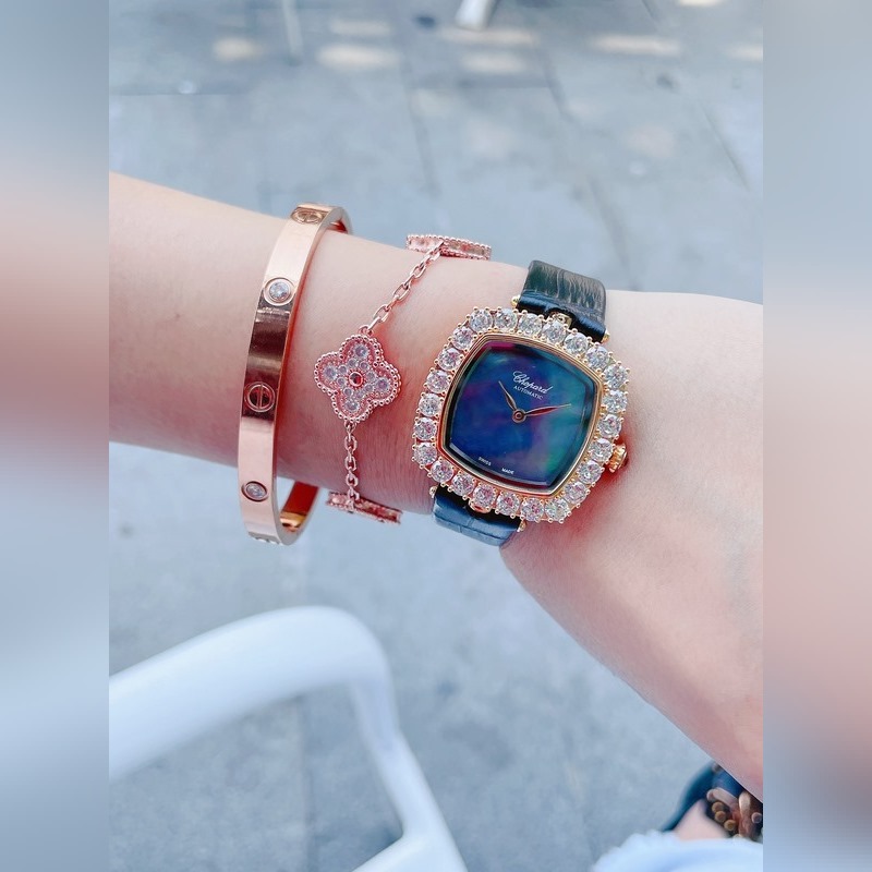 18 karátos fehérarany és rózsaarany, 24 marquise-csiszolású gyémánttal (körülbelül 3,84 karátos) kirakva, komoly kihívást jelent a csúcskategóriás ékszerkészítésben; a gyémántok által kibocsátott vakító fény és az öv puha szatén anyaga elegáns kontrasztot alkot a gyémánt formával.