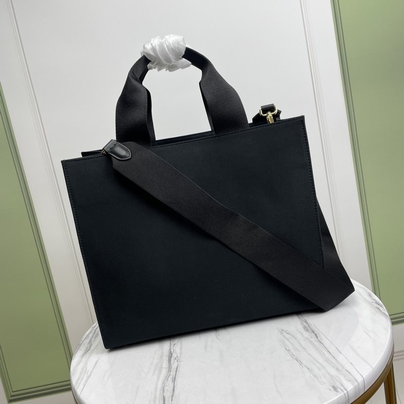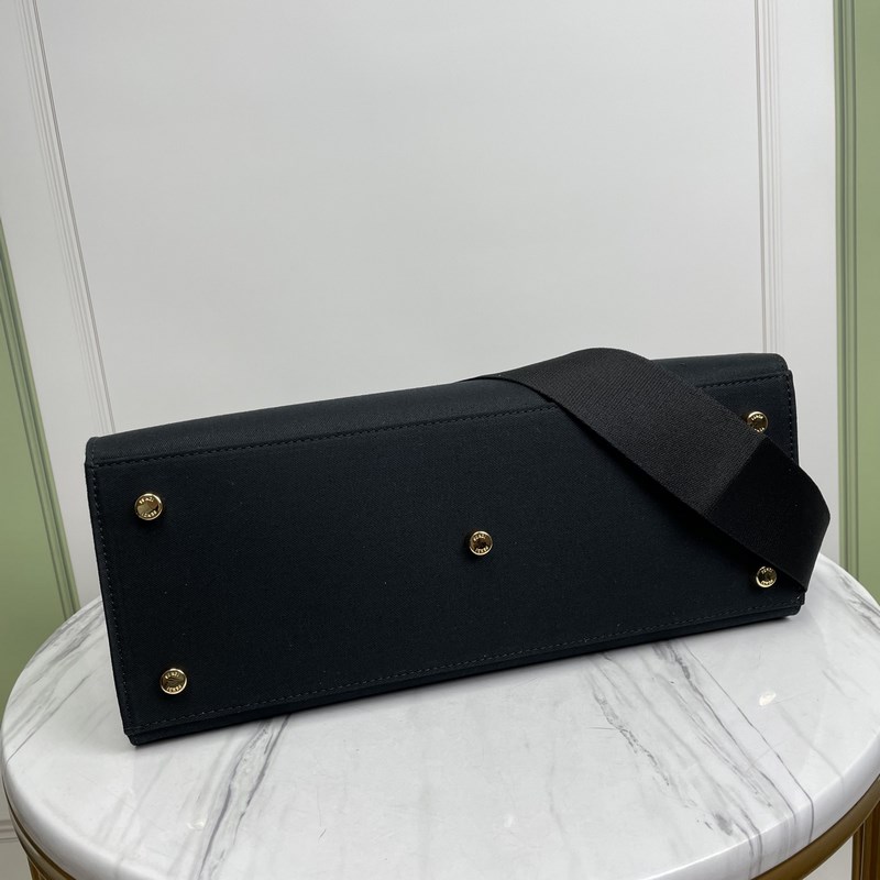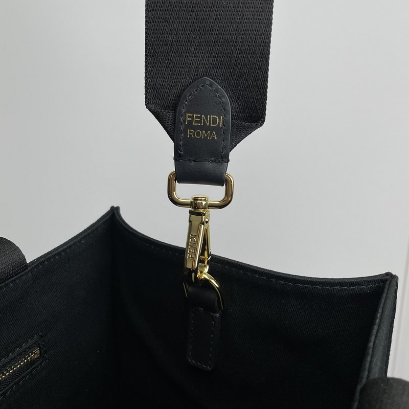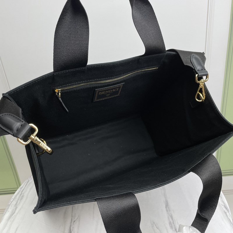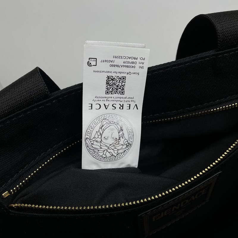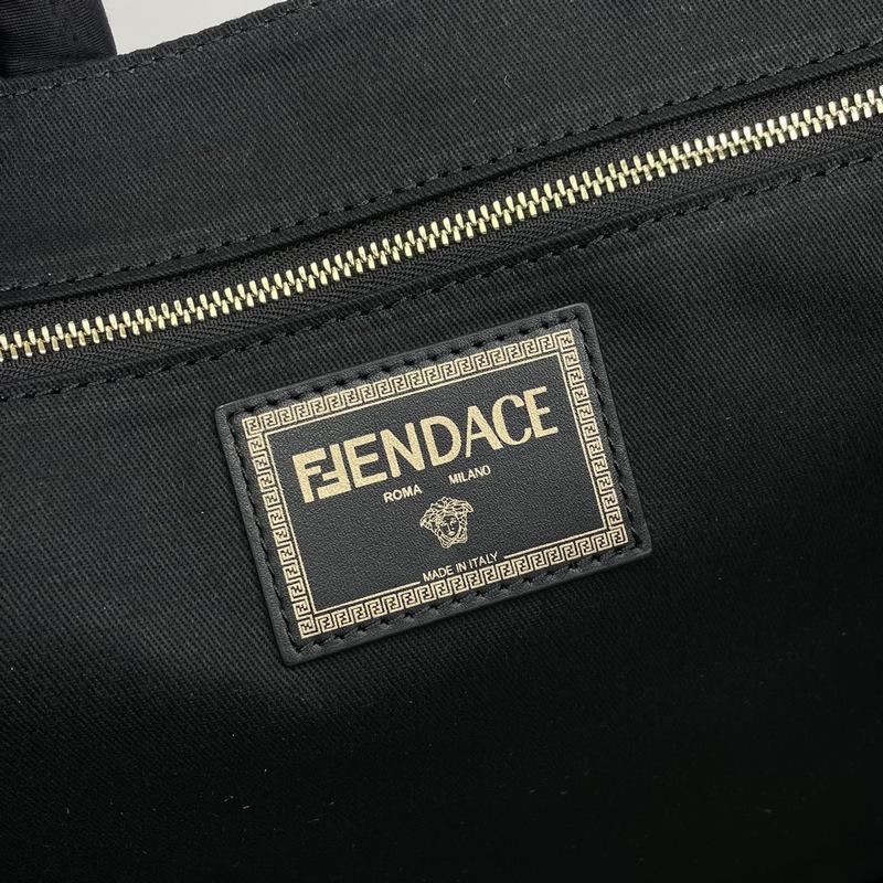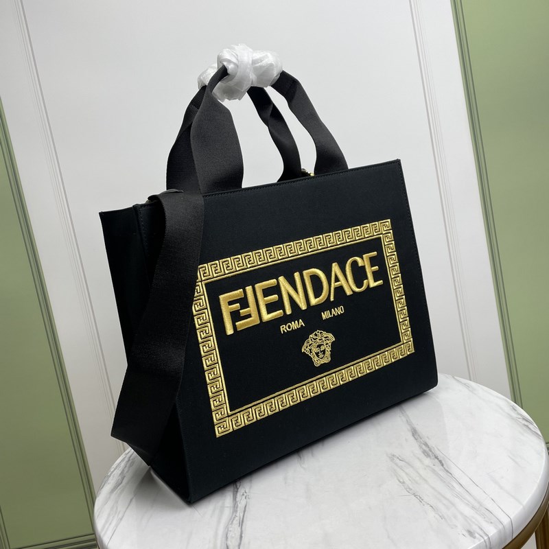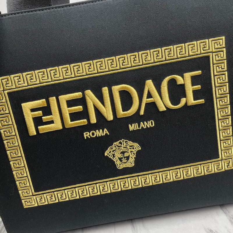 Kis kézitáska, fekete vászon anyagból. Az aranyszálas hímzés a Fendace logót mutatja be, amely a Fendi és a Versace kreatív együttműködési sorozatának szimbóluma. Fekete bőr részletek, belső cipzáras zseb és arany fém alkatrészek. Fogantyúkkal és levehető vállpánttal felszerelve, kézben vagy vállon hordható.