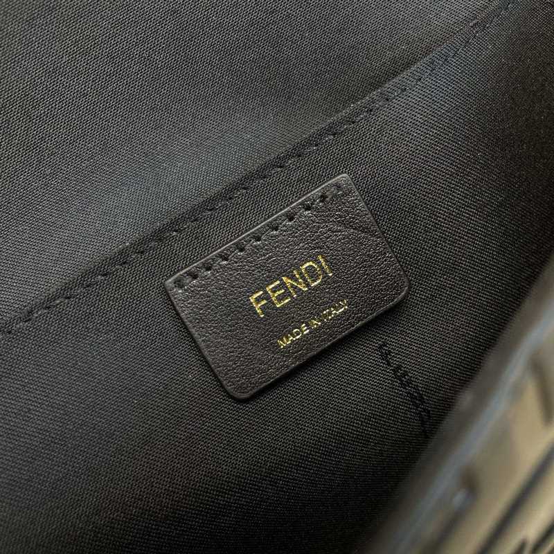 A FENDI Fendi legújabb, 2024-es geometrikus füles mini kézitáska, hardver kiegészítők Fendi logóval. Pattintható gombos záródás, két levehető belső zsebbel – az egyik cipzáras és a másik 8 kártyanyílással. Levehető láncos vállpánt. Lapos zsebekkel bélelve. Barna bőr anyag, fekete, kézzel festett dombornyomott FF nyomat. Az egyik zseb ugyanabból az anyagból, a másik fekete bőr. Arany fém alkatrészek