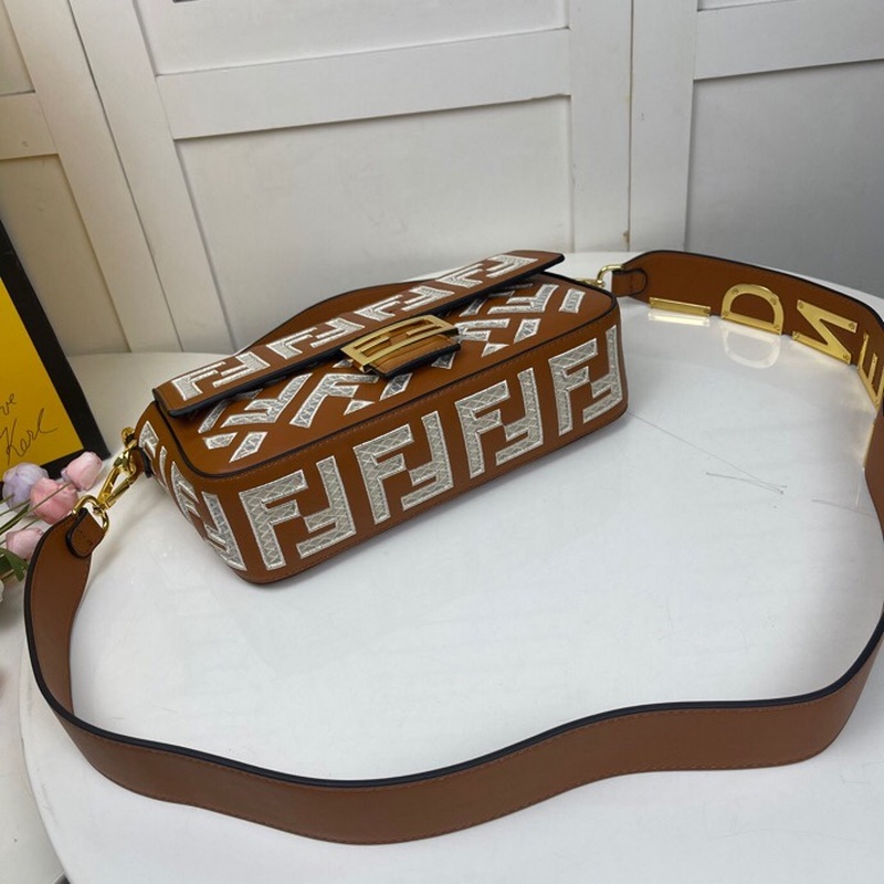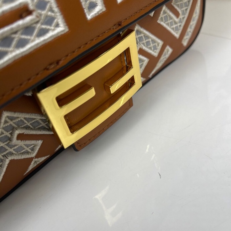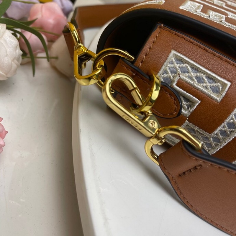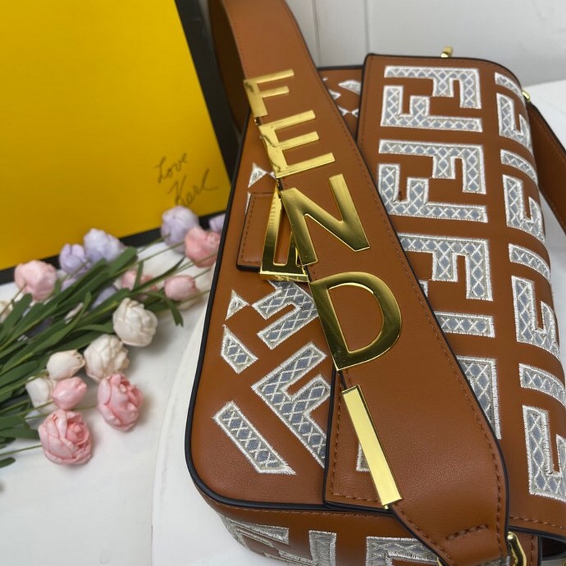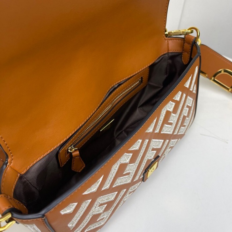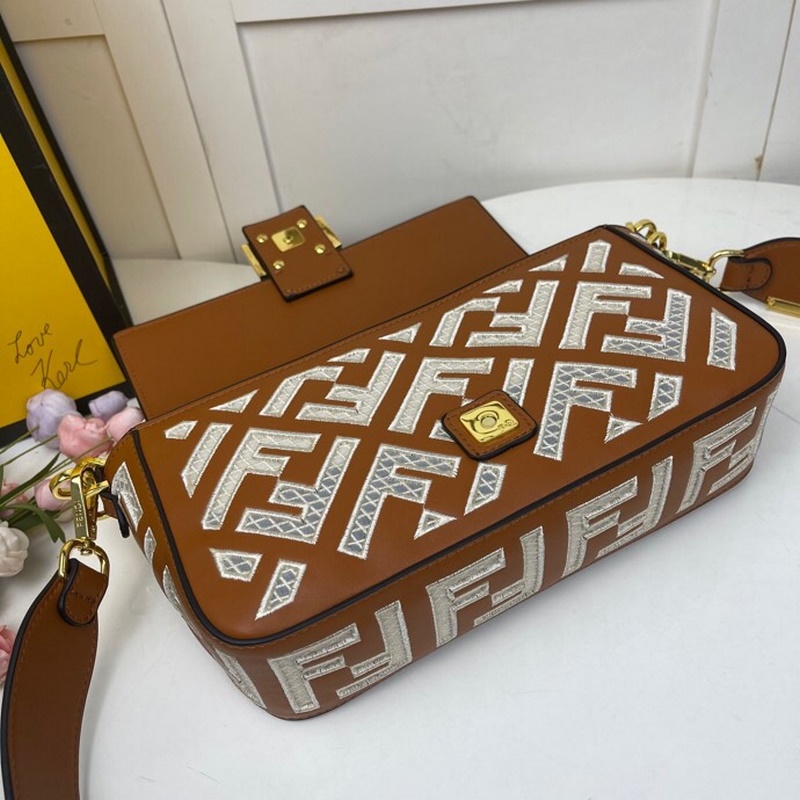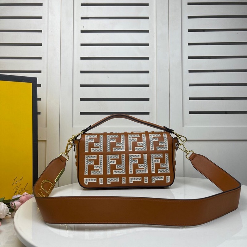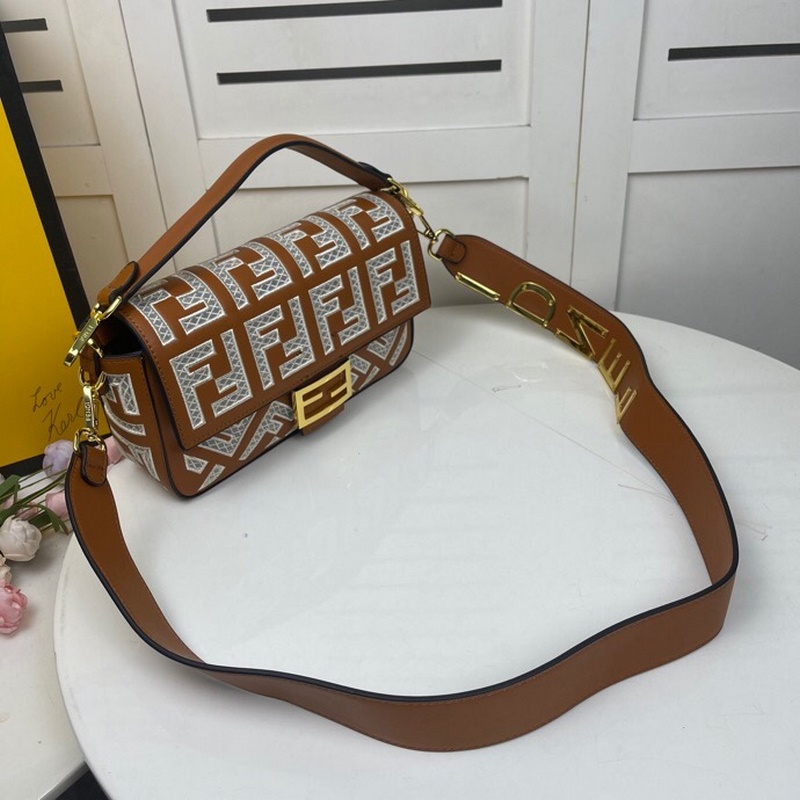 A FENDI Baguette kézitáska marhabőrből készült, FF hímzett üreges mintával és FF csattal díszítve. Mágneses csattal ellátott elülső füllel, cipzáras zsebbel ellátott belső rekesszel, bőr szegéllyel és részletekkel, valamint arany fém részekkel rendelkezik. A kézitáska levehető fogantyúval és betűs hardvermintás vállpánttal rendelkezik, mely kézben, vállon vagy keresztben is hordható. Méret 26*6*15 sz.: PZ9618870
