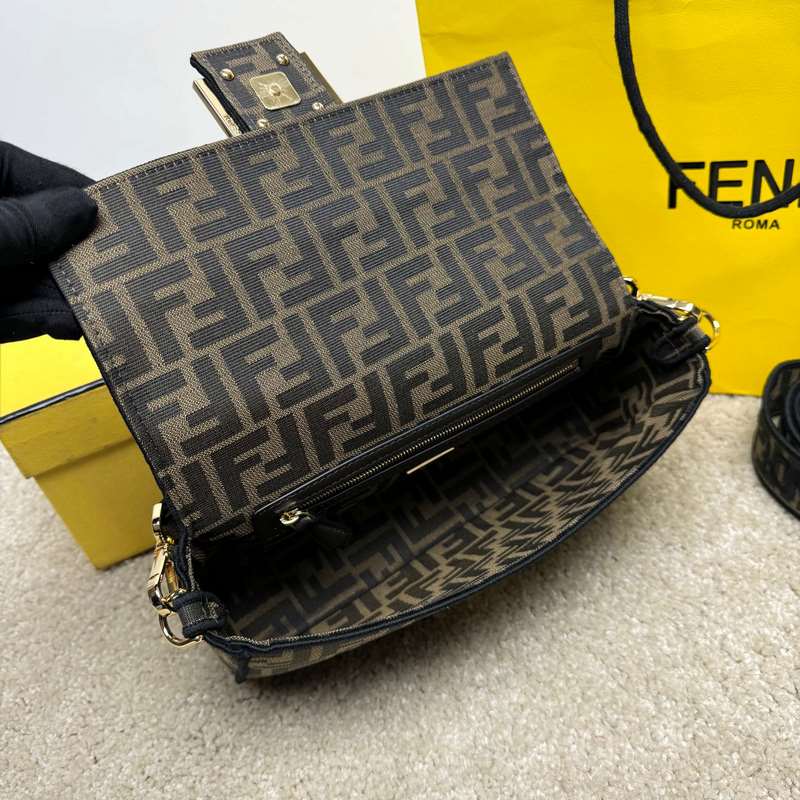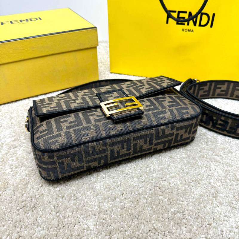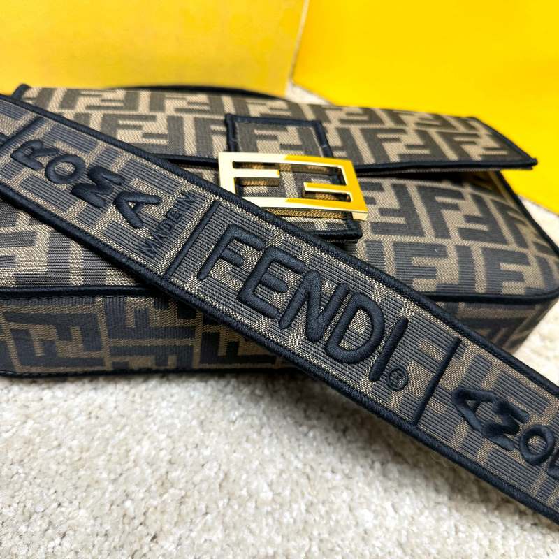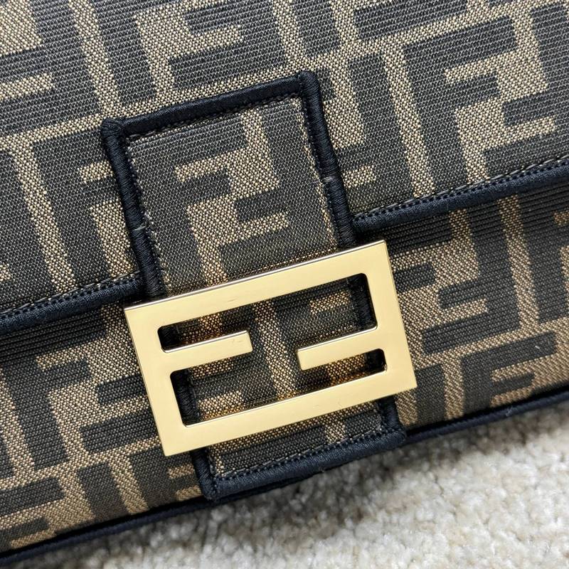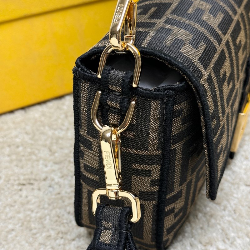 A Fend1 ikonikus Baguette közepes kézitáskája füles kialakítású, FF mágneses csattal és cipzáras béléssel. Levehető vállpánttal ellátott, kézben vagy keresztben hordható. Anyagból készült, FF logóval díszített és rózsaszín szatén öltéssel hímzett élekkel díszítve. Az egyedi vállpántok rózsaszín Fend1 Label logóval díszítettek.