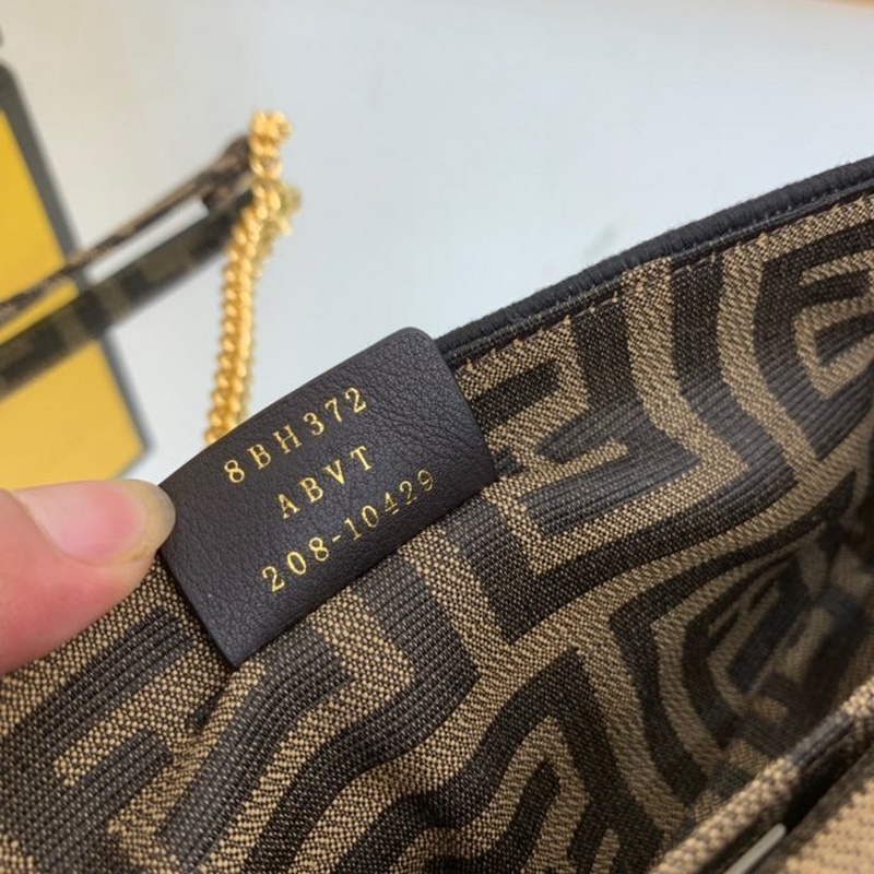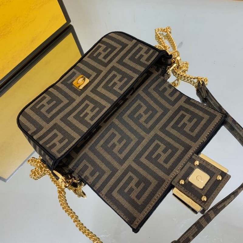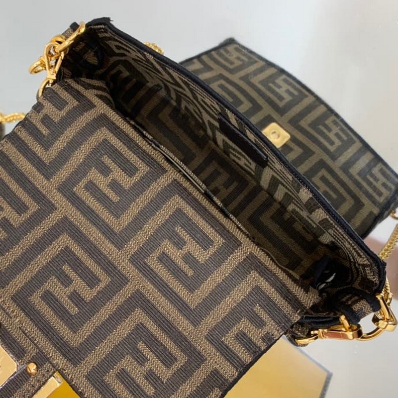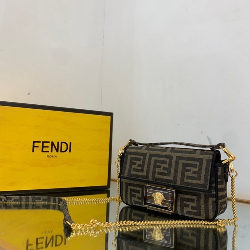 Teljes hosszúságú FF mintás FF záródás fekete plexivel, és a részletek közé tartozik az elülső füles mágneses csat, az arany laminált bőr bélés, a belső rekesz, a belső zseb és az arany bevonatú fém alkatrészek. Hosszú fogantyúval és levehető vállpánttal felszerelve, hordható a hónalj alatt vagy a testen. Méret 18,5*4,5*12,cmcm Stílusszám 8BR017 Baguette sz.: BD96181000