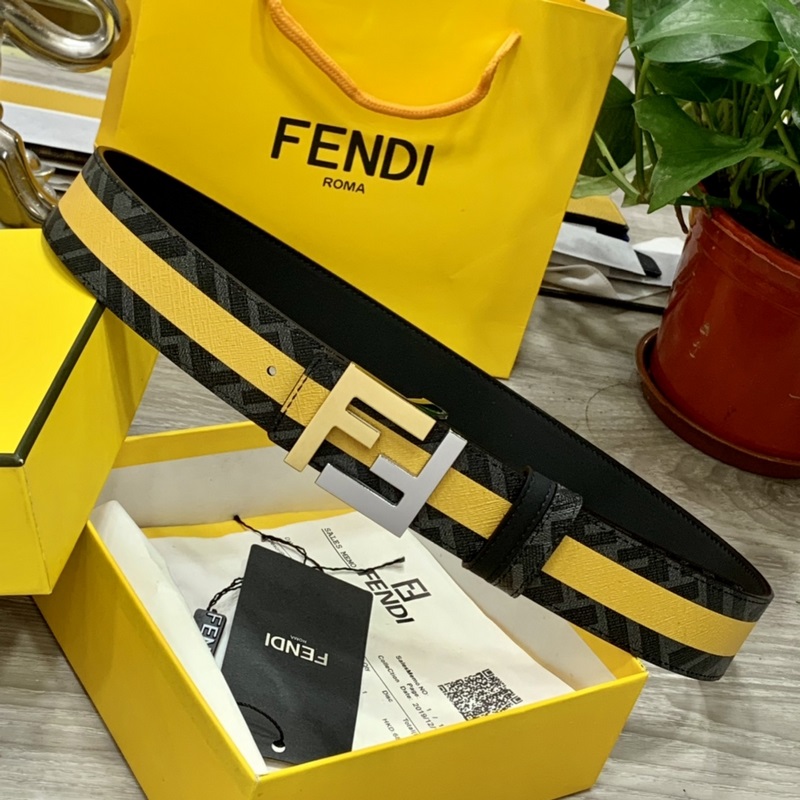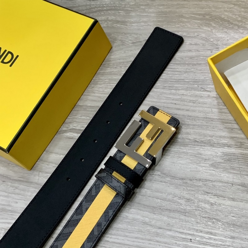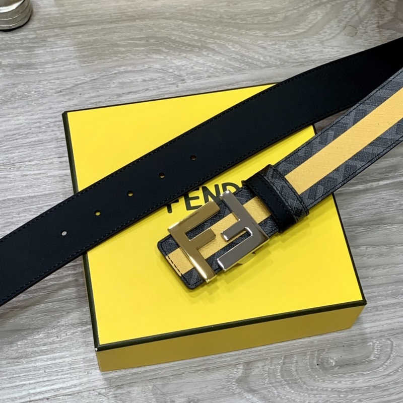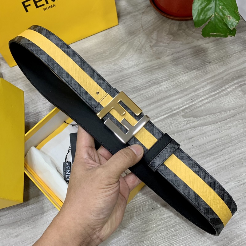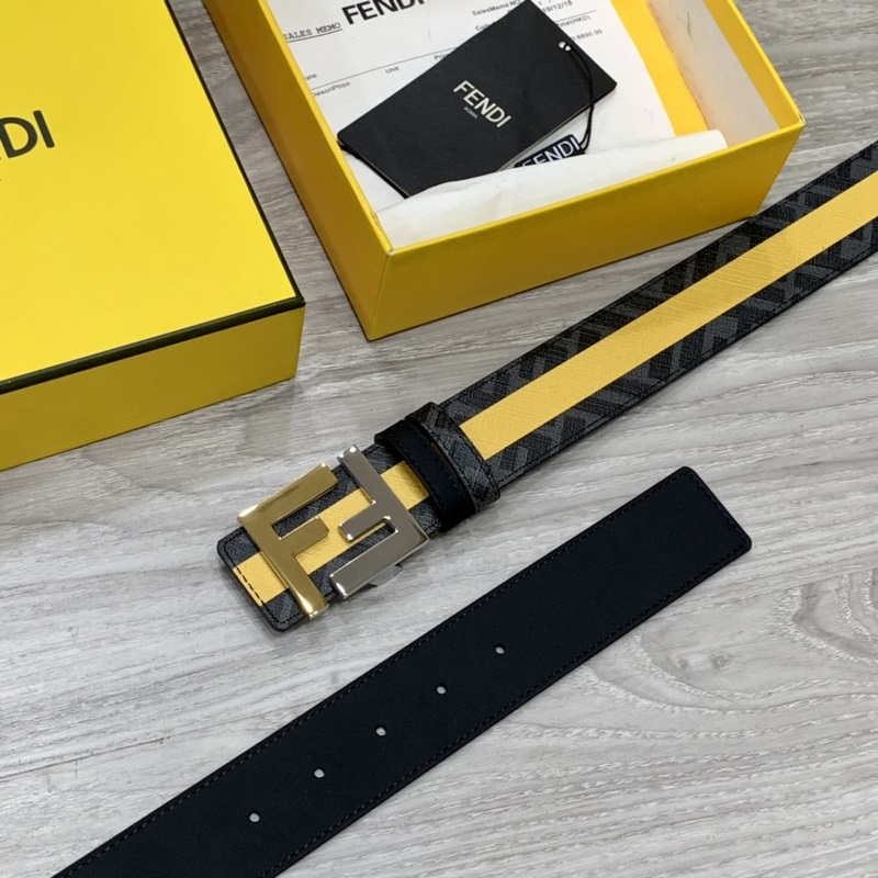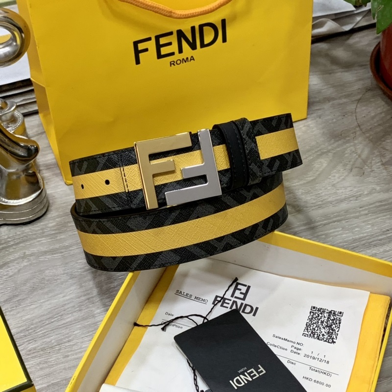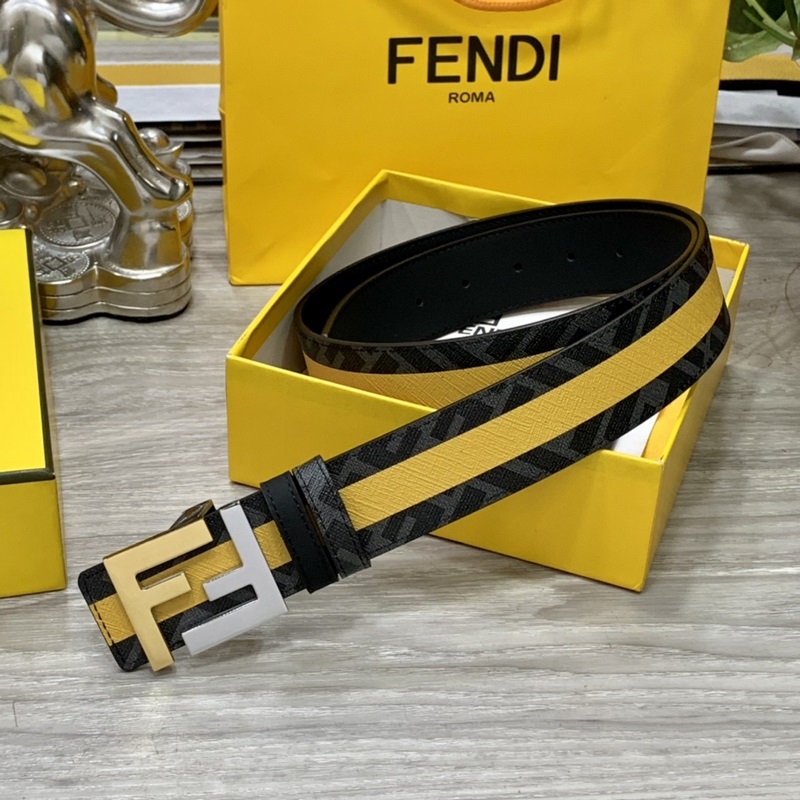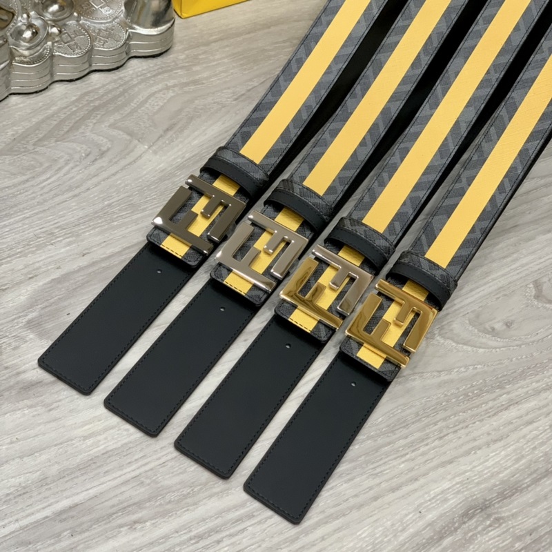 FENDI pult stílusú 4,0 cm széles dupla hurkos megfordítható öv FF pattintható csat Fekete Cuoio Romano bőr anyag Dohány sárga és fekete FF minta a hátoldalon Négyzet alakú gyémánt fém kivitel Divatos és klasszikus All-match stílus