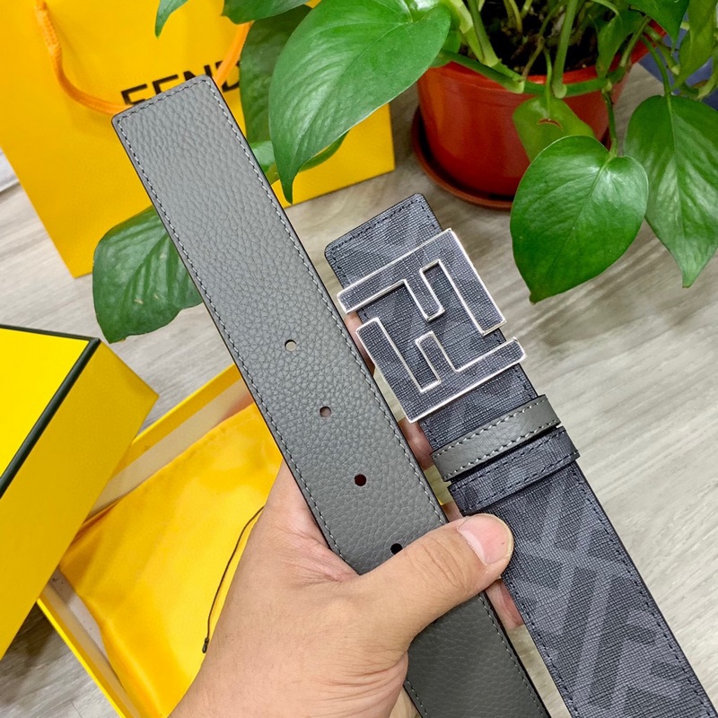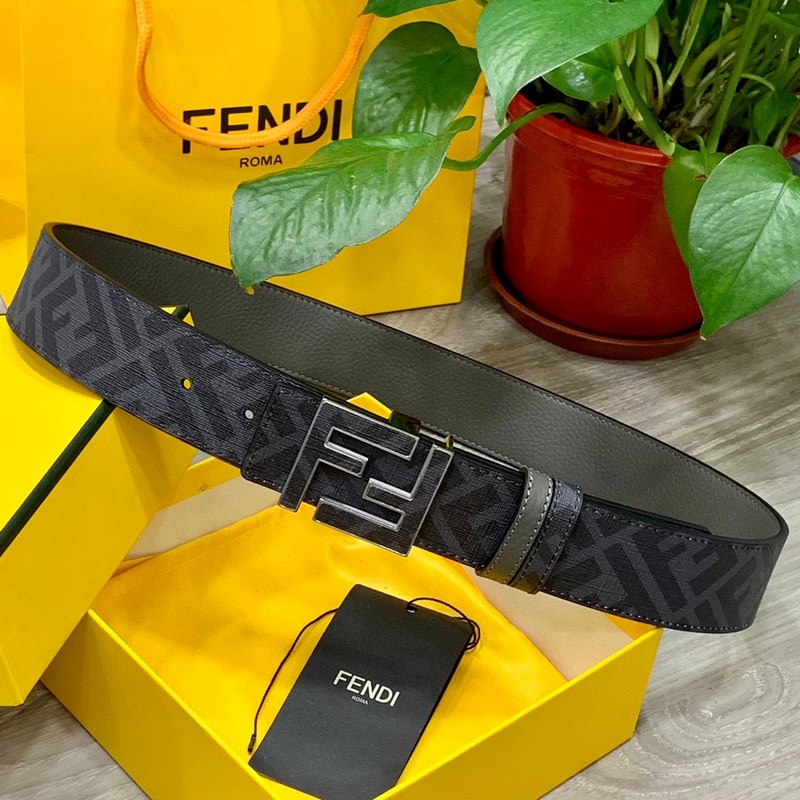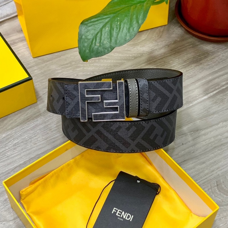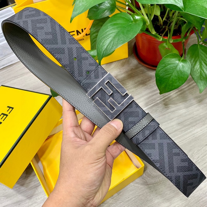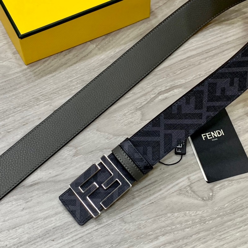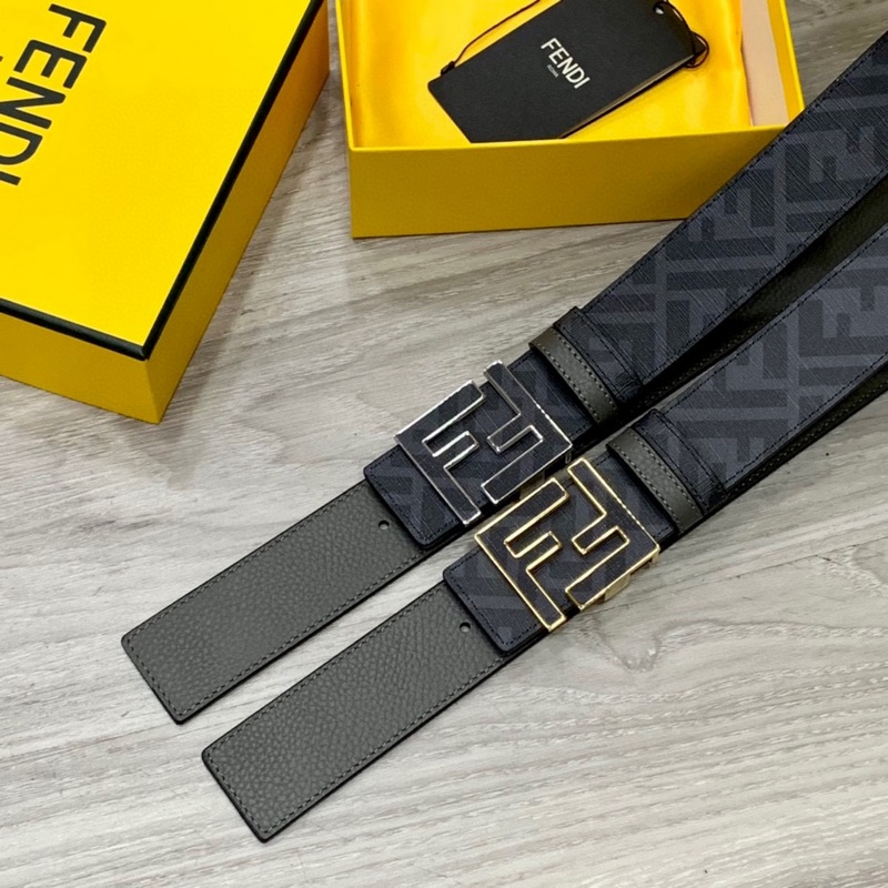 FENDI pult stílusú 4,0 cm széles dupla hurkos megfordítható öv FF pattintható csat Fekete Cuoio Romano bőr anyag Dohányszürke és fekete FF minta a hátoldalon Fekete zománcozott fém kivitel Divatos és klasszikus Sokoldalú stílus