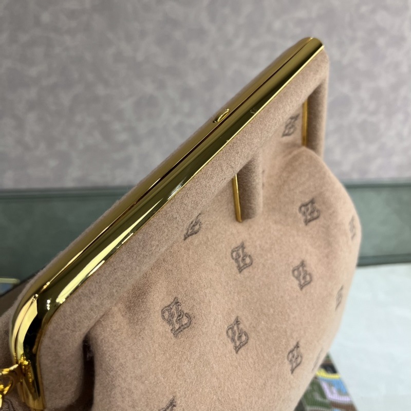 Flannelből készült, karligráfiai mintás hímzéssel díszített, azonos színű flanel túlméretezett fém F csattal, bőrrel bélelt belső rekeszekkel és arany vasalattal rögzítve, levehető flanel vállpánttal ellátva, kézben vagy keresztben hordható