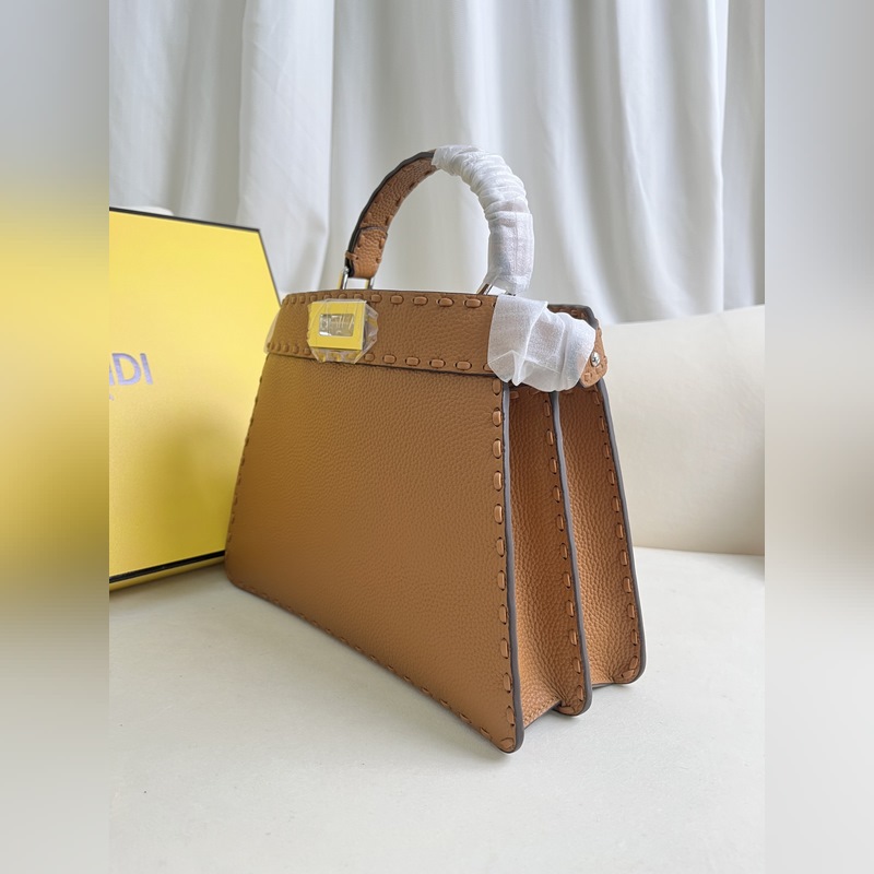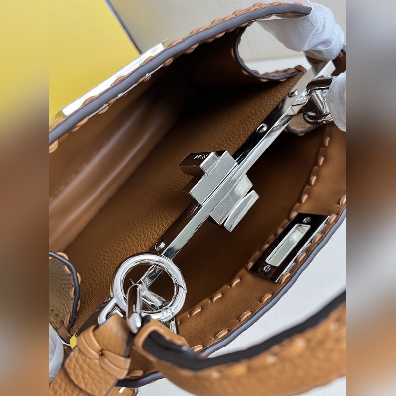 FEND1eekabooISeU közepes kézitáska, licsi borjúbőrből, mindkét oldalán klasszikus csavaros zárakkal, puha nappa bőr béléssel, két kemény válaszfallal elválasztott rekesszel, gombos belső zsebekkel, arany fém részekkel. A kézitáska fogantyúval és állítható és levehető vállpánttal van felszerelve, melyhez teknőspáncél csattal is kiegészíthető. Ez egy gyönyörű és tartós táska