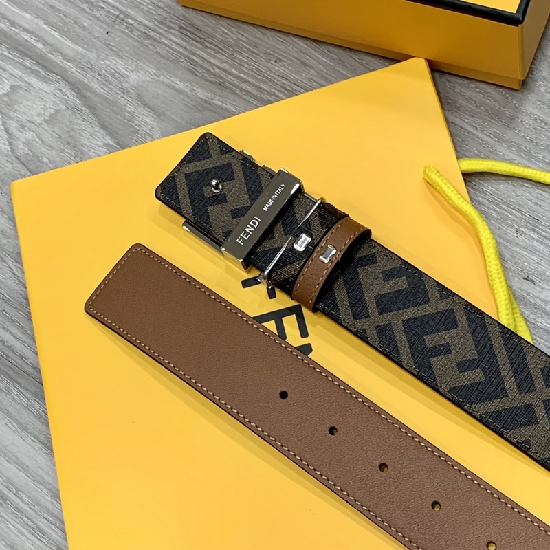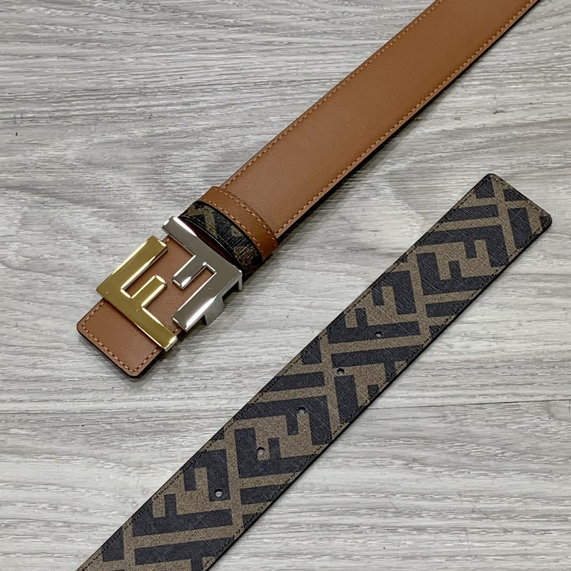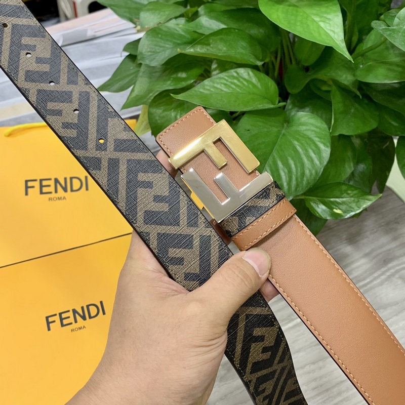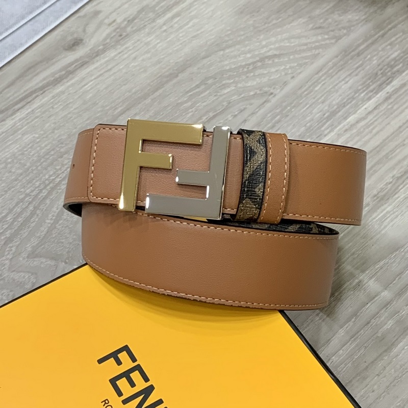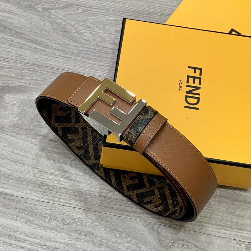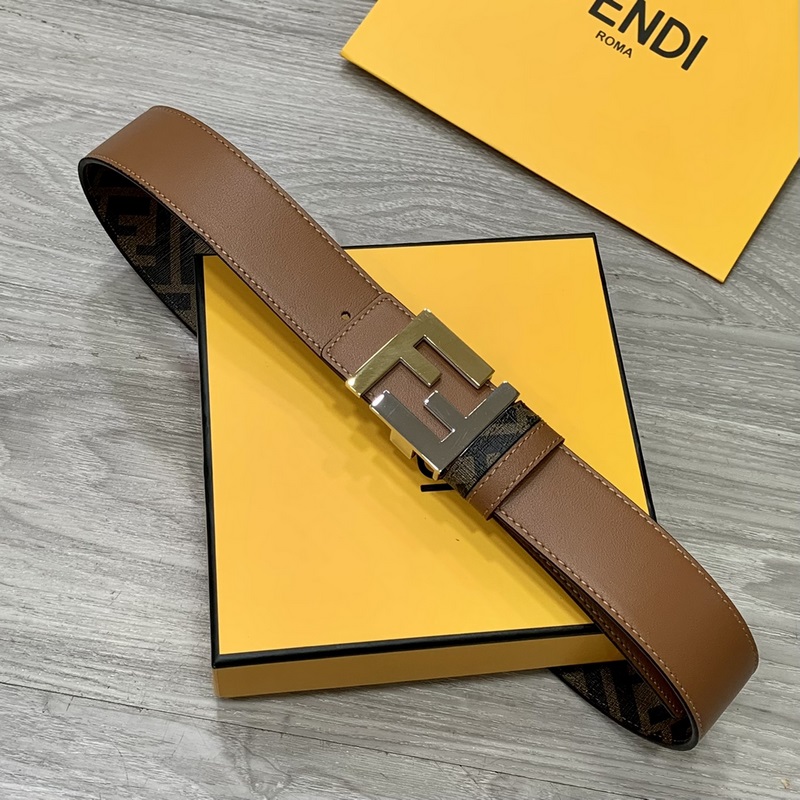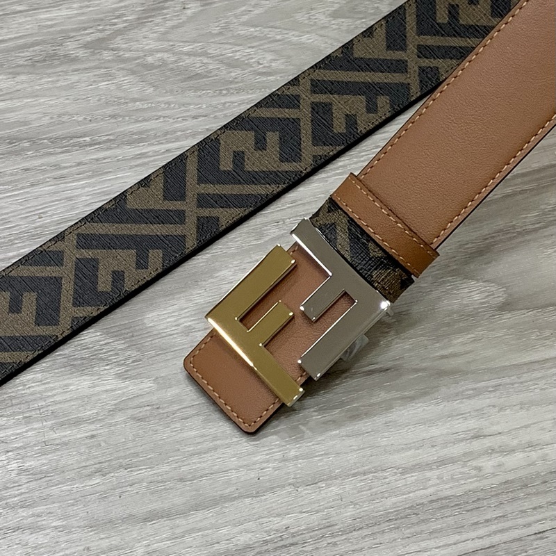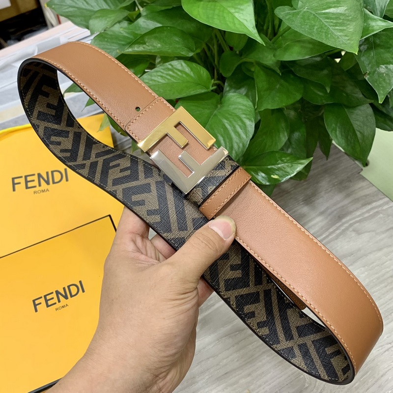FENDI pult stílusú 4,0 cm széles dupla hurkos megfordítható öv FF pattintható csat Khaki Cuoio Romano bőrből Hátlapi szövet dohánysárga és fekete FF mintával Fekete zománcozott fém kivitel Divatos és klasszikus All-match stílus