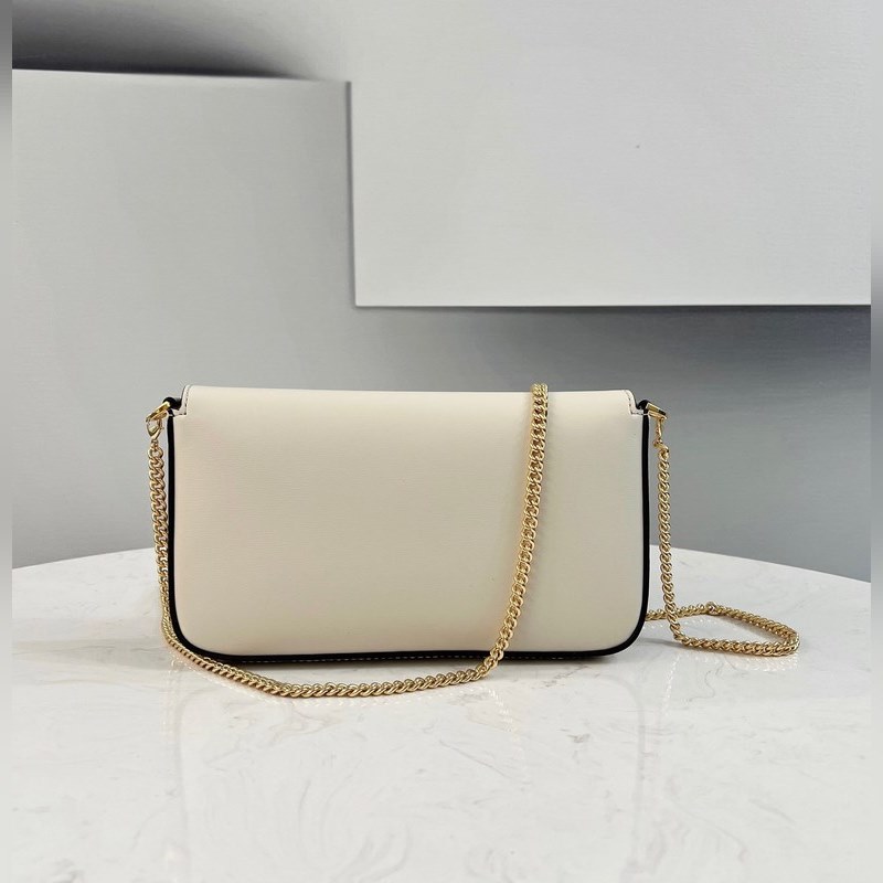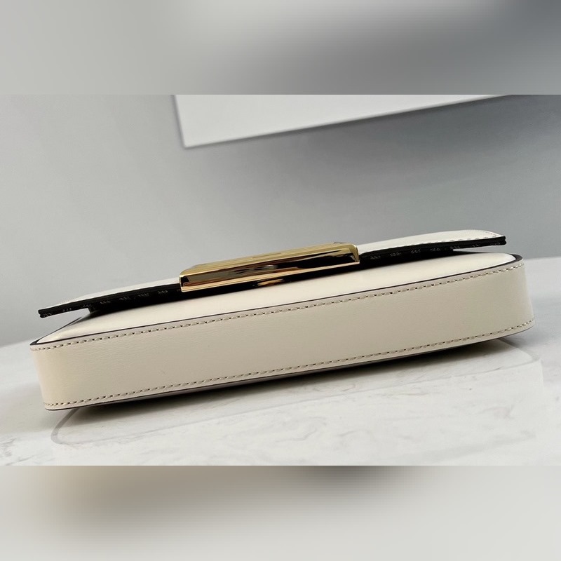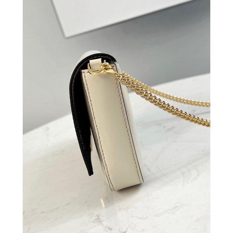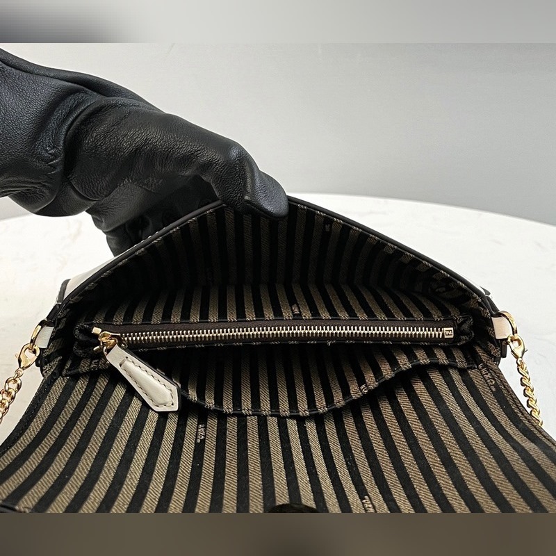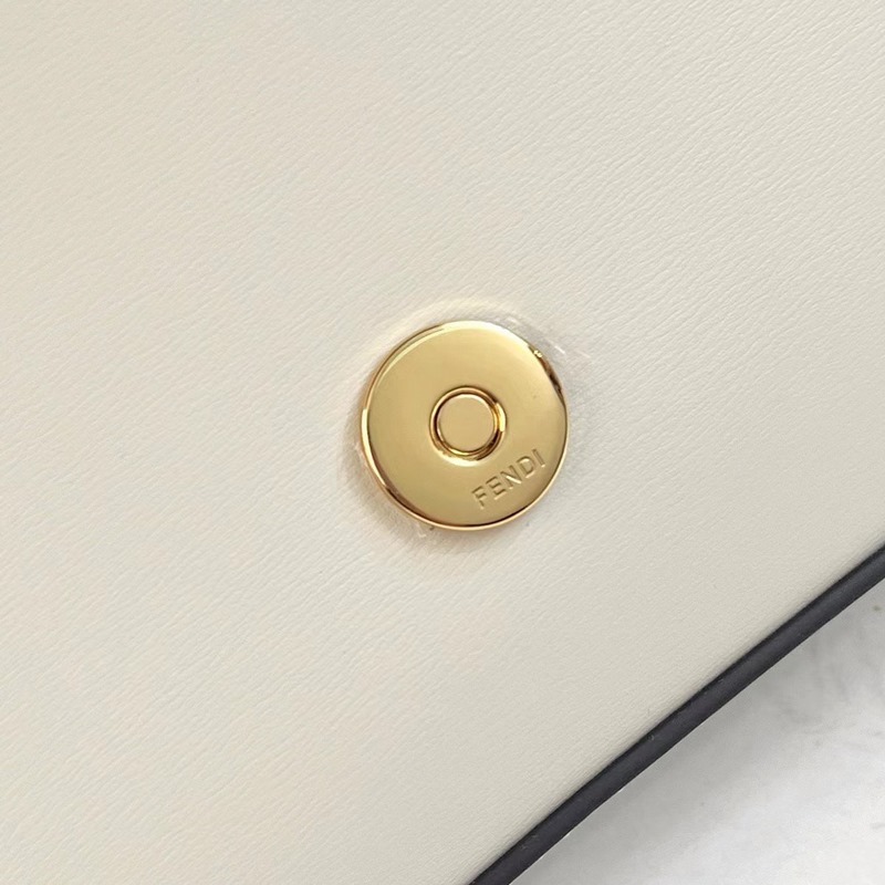 Türtfehér borjúbőrből készült, fém FF dekoratív füllel és patentos zárással díszítve, Pequin szövet hátlap és lapos zseb levehető cipzárral Pequin szövet belső zseb + arany bevonatú fém részek levehető láncos vállpánttal kéz/kereszttest/vállpánt kéz/kereszt/váll*53p*