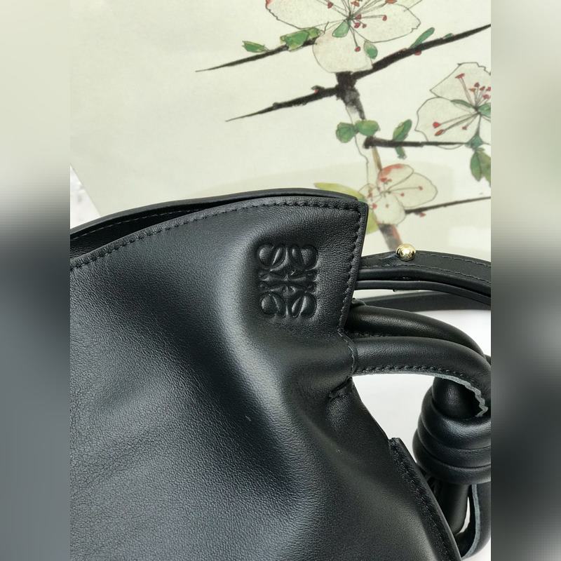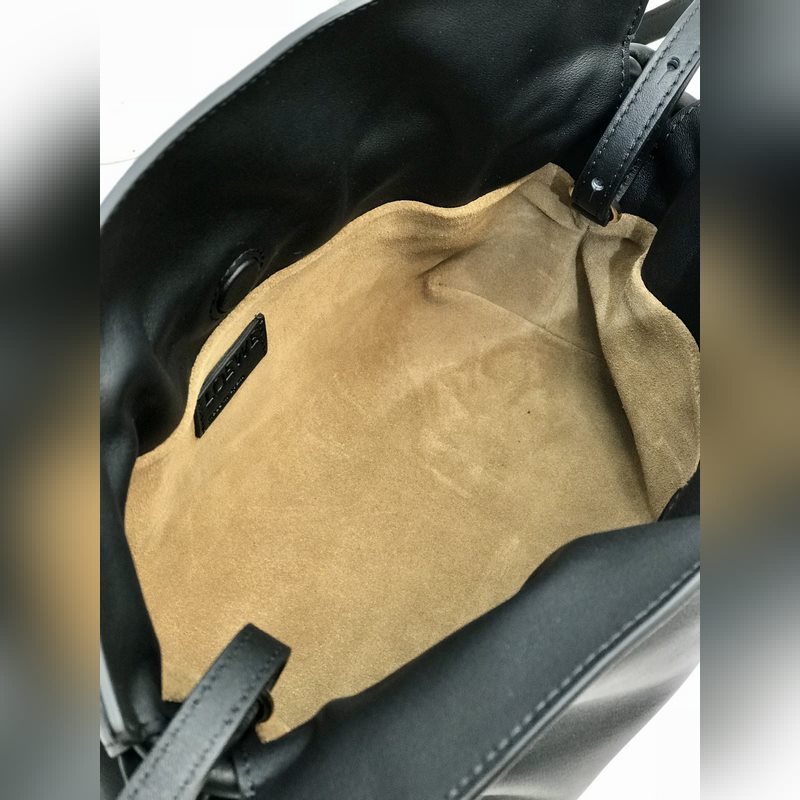 Flamenco mini szerencsetáska fekete színben puha és finom borjúbőrből készült, húzózsinórral és jellegzetes tekercses csomóval. Hordható vállon, keresztben vagy kézben. Levehető és állítható vállpánttal, mágneses csattal és velúr béléssel rendelkezik. Mini modellszám 10855, méret 22,5*18*9
