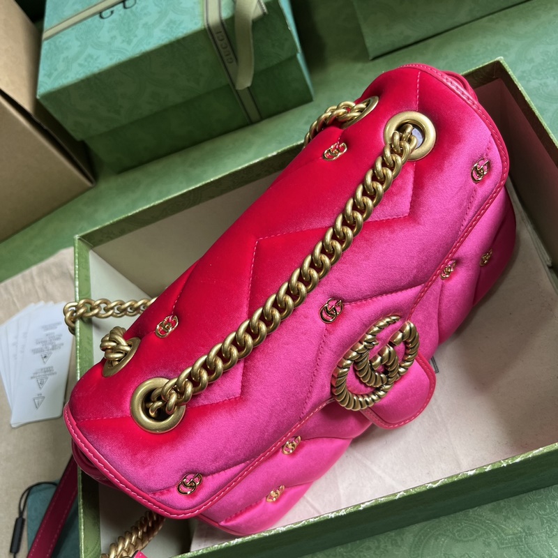 GG Marmont közepes válltáska. Klasszikus sziluettje puha foltvarrással frissítve, ez a GG Marmont Medium válltáska kis dupla G csappal rendelkezik a szemet gyönyörködtető megjelenés érdekében. A tónusos bőrborítások kiegészítik a fényűző rózsaszín árnyalatot, csillogóan indítva a szezont. Rózsaszín V-alakú steppelt bársony, rózsaszín bőrszegélyek, arany tónusú hardver, kizárólag a weboldalon, kis dupla G csapok, csúszólánc, amely 55 cm magas vállpánthoz vagy 30 cm magas felső fogantyúhoz igazodik. Crossbody táskaként is hordható. Rugós csattal, súly: kb. 0,6 kg.