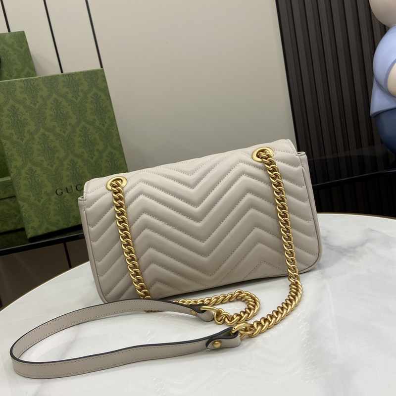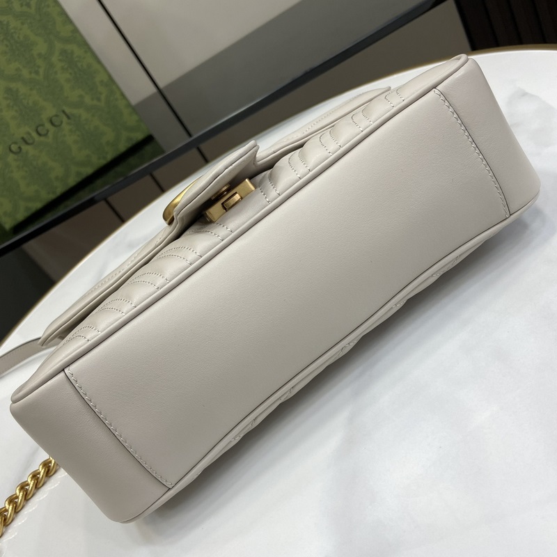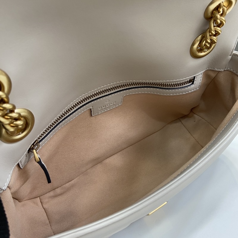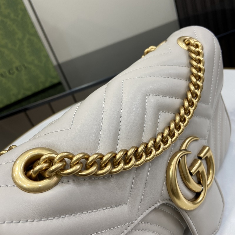 Új GG Marmont steppelt minitáska eredeti bőrből. Ez a GG Marmont minitáska jól felismerhető formával, semleges világos bézs steppelt V-alakú bőr anyaggal, enyhén merev testtel, füllel záródó kialakítással és dupla G hardverrel rendelkezik. Ezt a táskát többféle szállítási módra tervezték, és a fémlánc elcsúsztatásával könnyen váltható válltáska és kézitáska között. Világos bézs steppelt V-alakú bőr, antik arany tónusú vasalat, velúr mikroszálas dupla G bélés, elcsúsztatható láncos táskapánt vállpántként (55 cm magasság) vagy felső fogantyúként (30 cm magasság) használható. Crossbody táskaként is használható. Rugós csatos szárny, súlya: kb 0,6 kg.