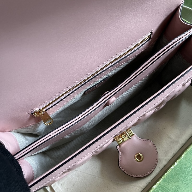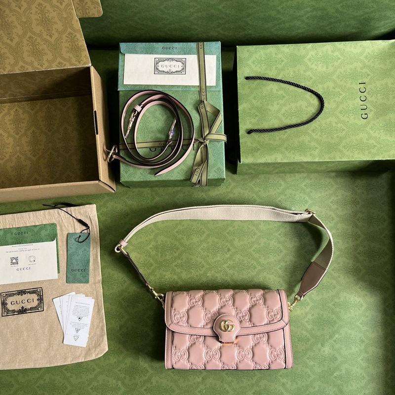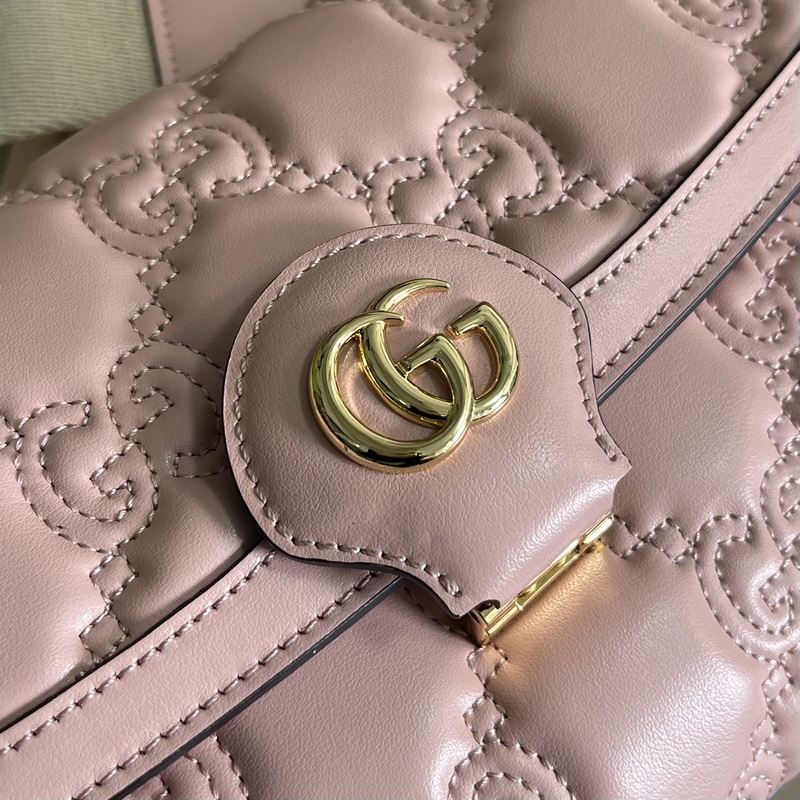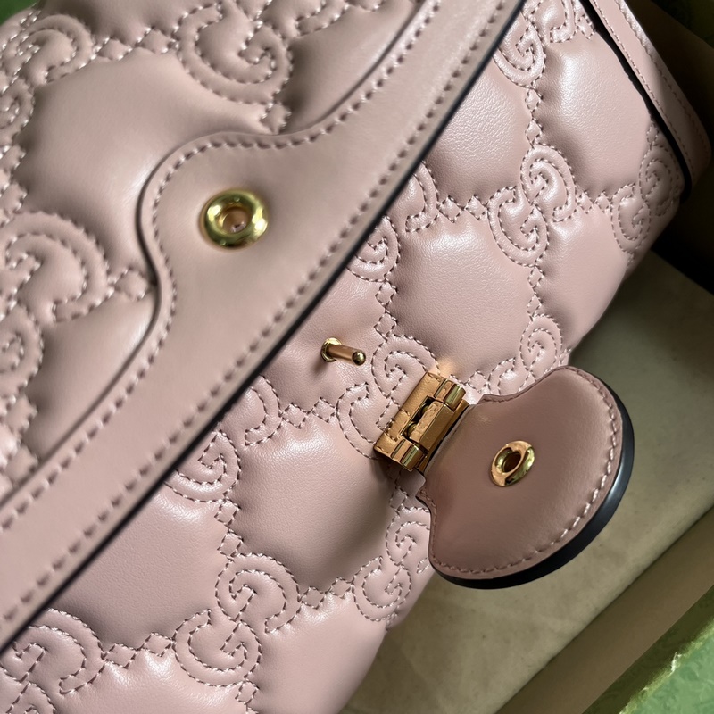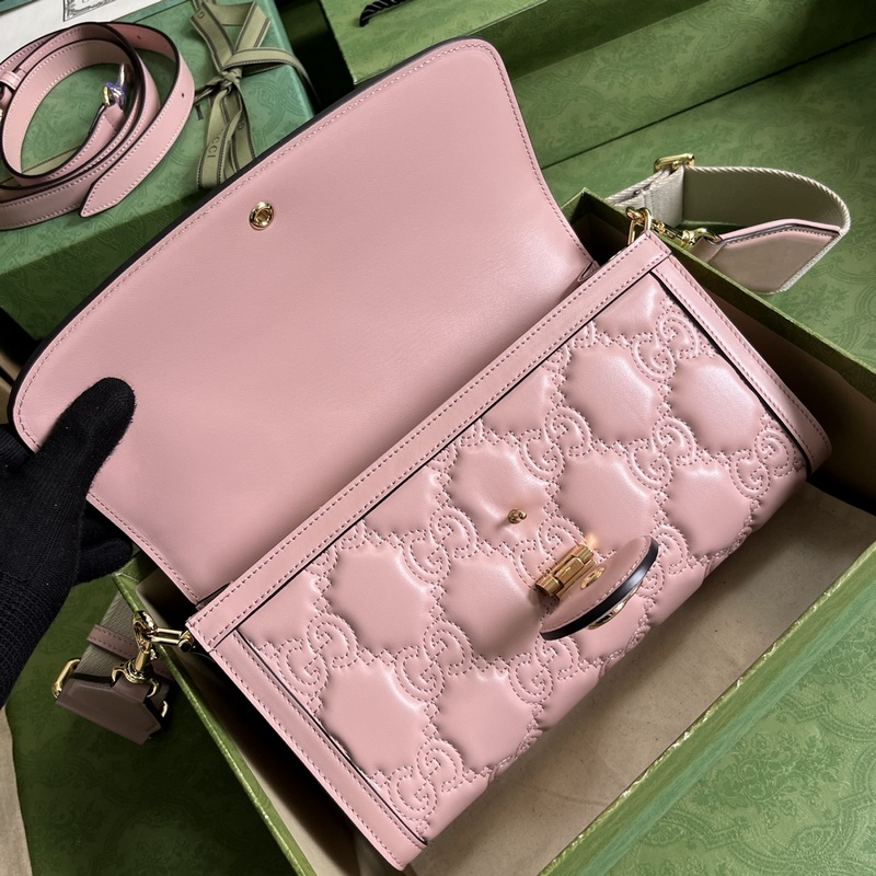 Kis táska GG Matelassé bőrből. A GG Matelassé bőrt minden évszakban újragondolják a Ház kreatív igazgatójának legmodernebb dizájnjában. Az ikonikus, extra puhává varázsolt anyag texturált geometrikus mintával kombinálva stílusos, meghatározó darabot alkot a Gucci legújabb kollekcióihoz. Ez a design a 90-es évek logótrendjének modern felfogása, amely gyakran megjelent a House legújabb kollekcióiban. Rózsaszín kis válltáska két cserélhető pánttal. Rózsaszín GG Matelassé bőr, arany tónusú hardver, két levehető vállpánt: elefántcsont nylon és rózsaszín bőr, Double G pamut és vászon bélés, dupla bevágás és belső nyitott zseb, állítható bőr vállpánt 55,5 cm-es lehajtással; levehető vászonszíj 55 cm-es eséssel.