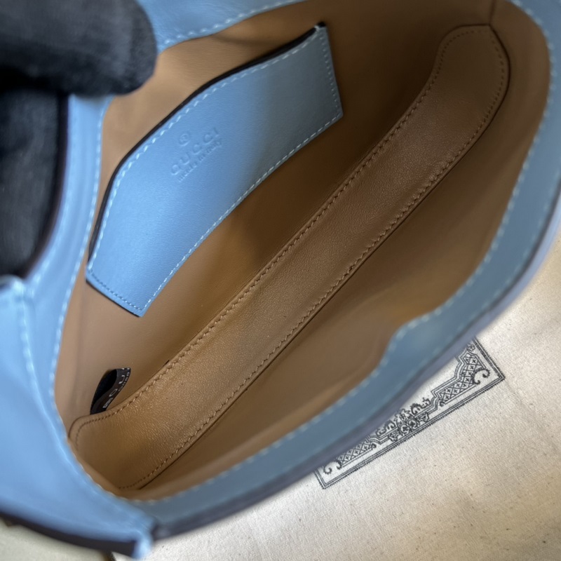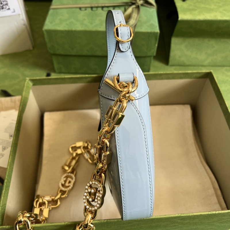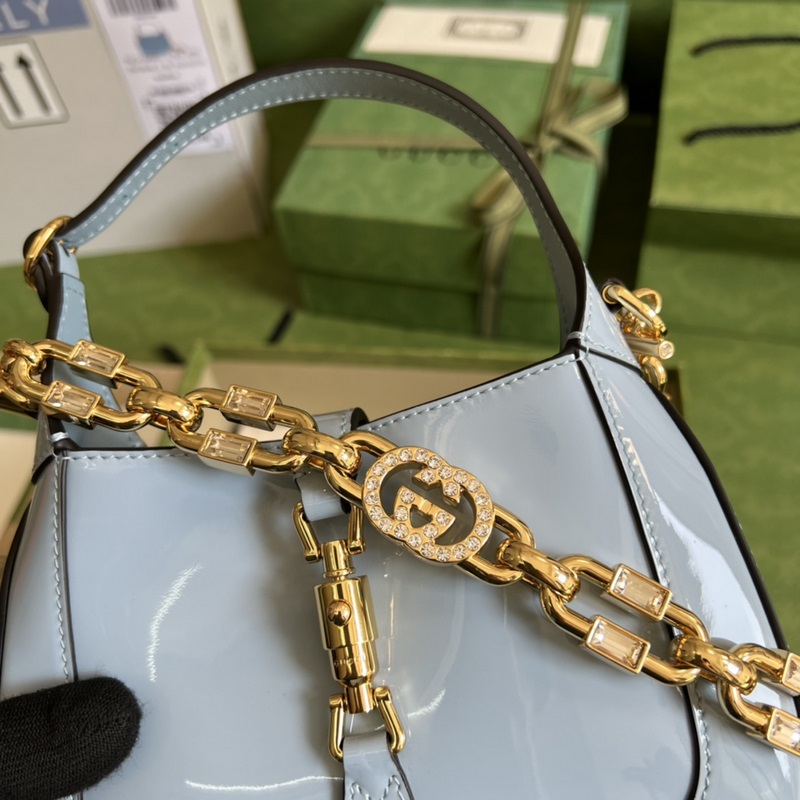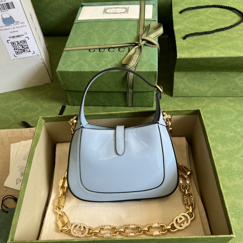 GUCCI Stílus: 699651 1961-es mini válltáska, ez a darab káprázatos lakkbőrből készült, játékos és kifinomult. Ez a Jackie 1961-es mini kézitáska ezt a fényes anyagot világoskék színben értelmezi, divatos remekművé téve a “Gucci Love March”-ot. A merész színvilág az önkifejezés koncepcióját tükrözi az idei szezon divatbemutatójában. Világoskék lakkbőr, arany tónusú vasalat, fogantyú magassága: 10 cm, levehető láncos vállpánt kristály reteszelő dupla G-vel (40 cm magas), nyomógombos csattal.