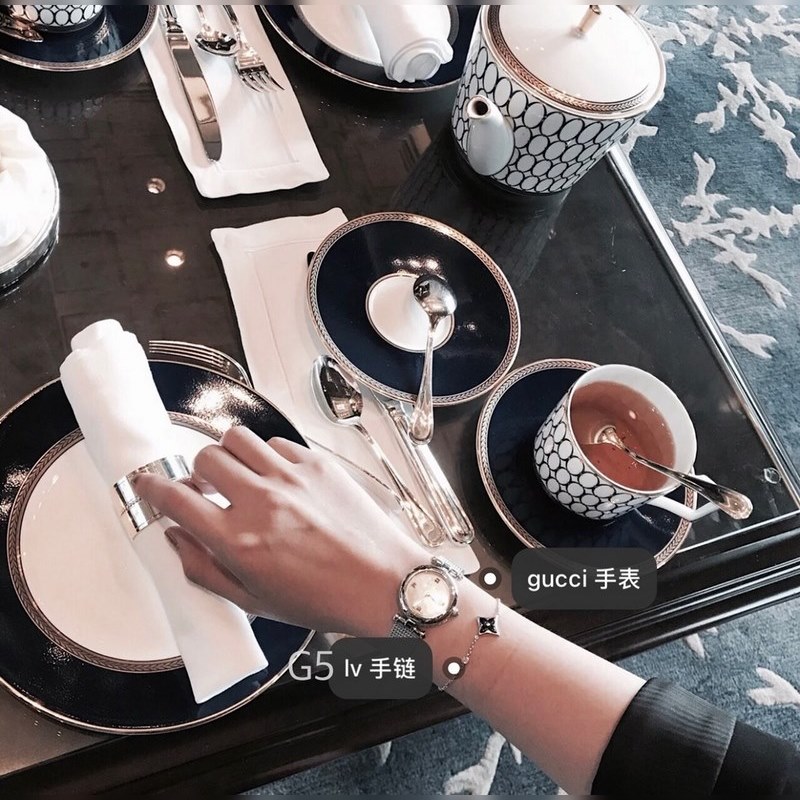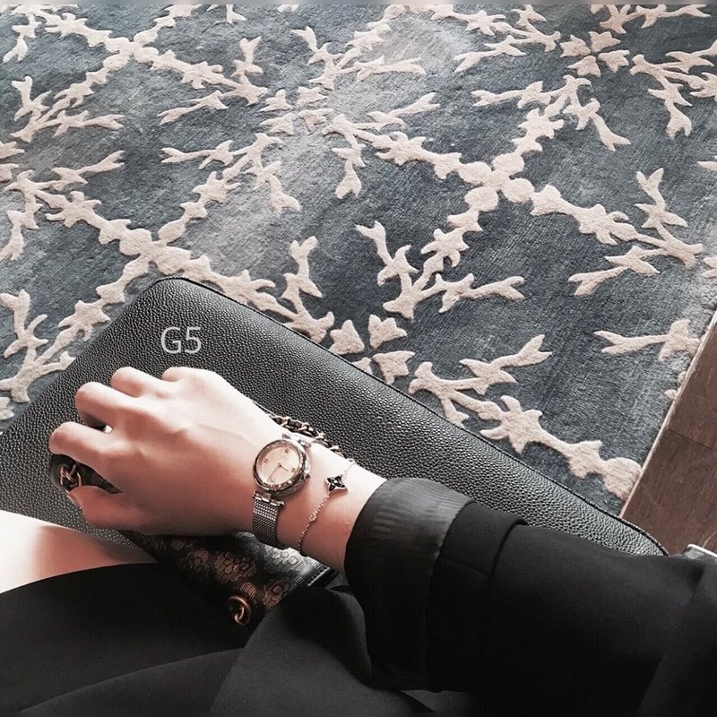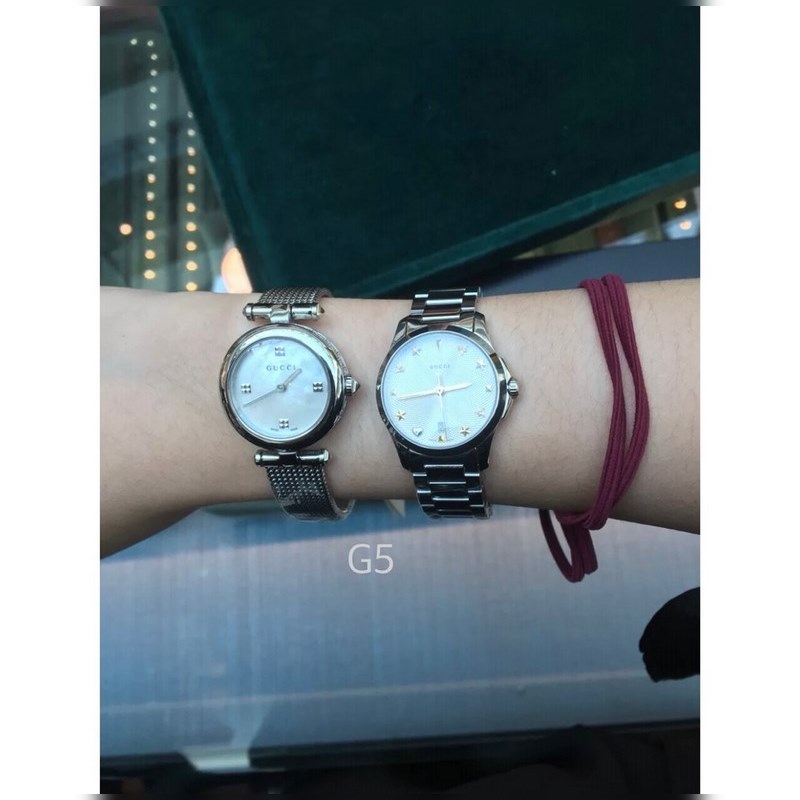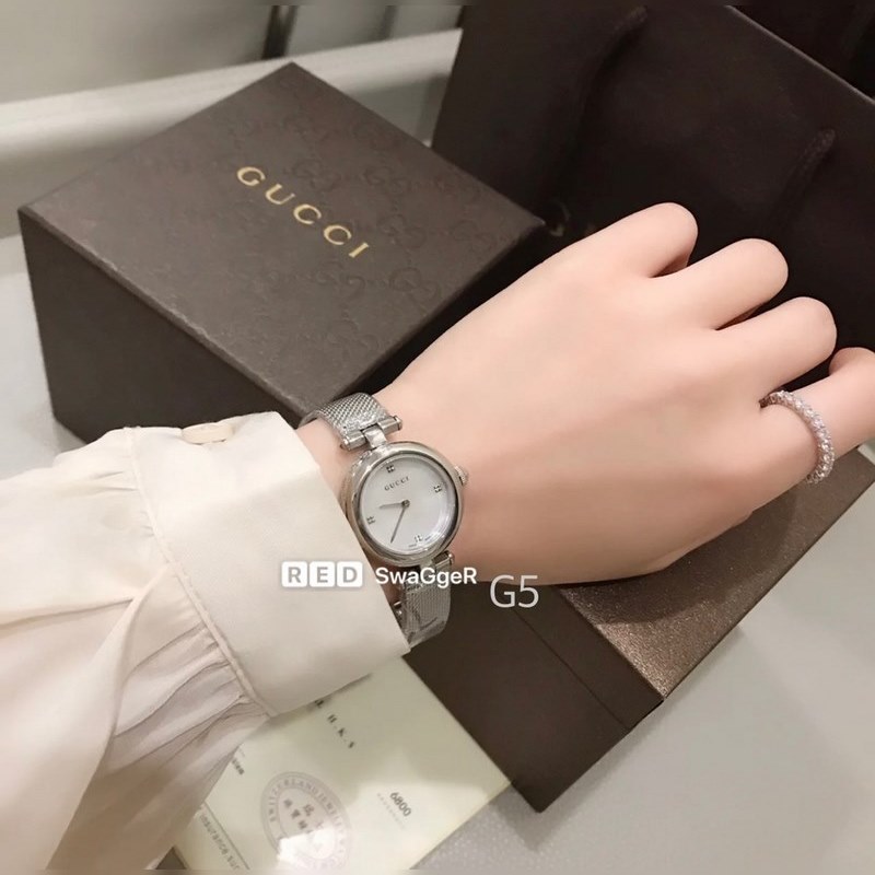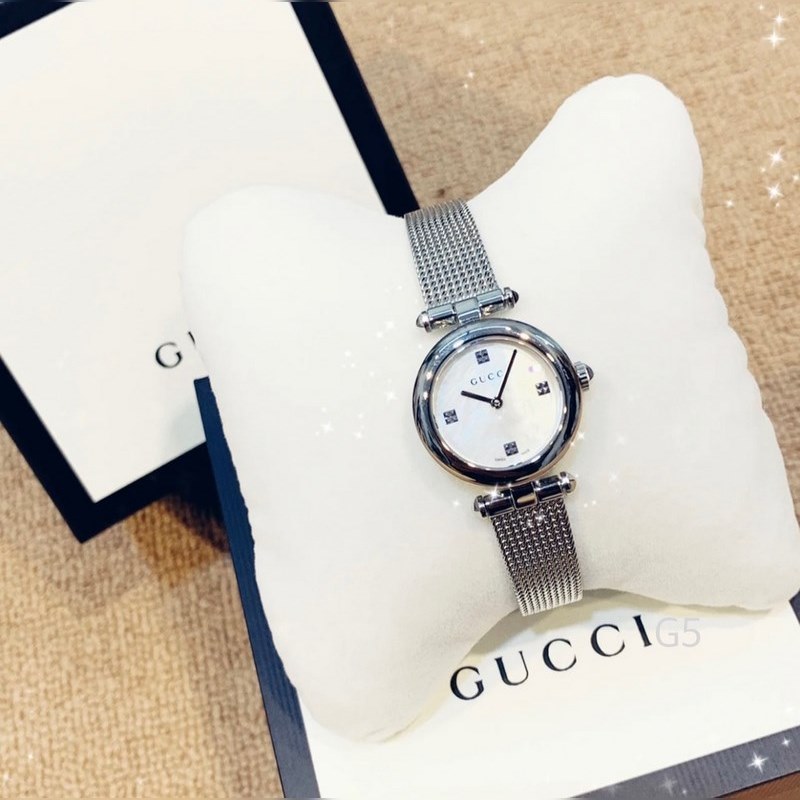 A héj sima és kerek. Tele van Gucci márkaelemekkel a dizájnban. Nagyszerű, egyszerű és nagyon sima vonalakkal rendelkezik. Retro elemeket és fém díszítéseket tartalmaz. A tok oldalán egy mintagravírozási eljárás található, ami nagyon háromdimenziós. A 316L-es rozsdamentes acél tok és szíj egy 10 részből álló, levehető pánttal párosul, amely minden csuklókörfogathoz alkalmas. Szuper A-osztályú mélytengeri gyöngyház számlap, svájci import kvarc szerkezet, zafír karcálló tükör, átmérő 27 mm