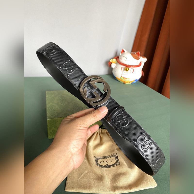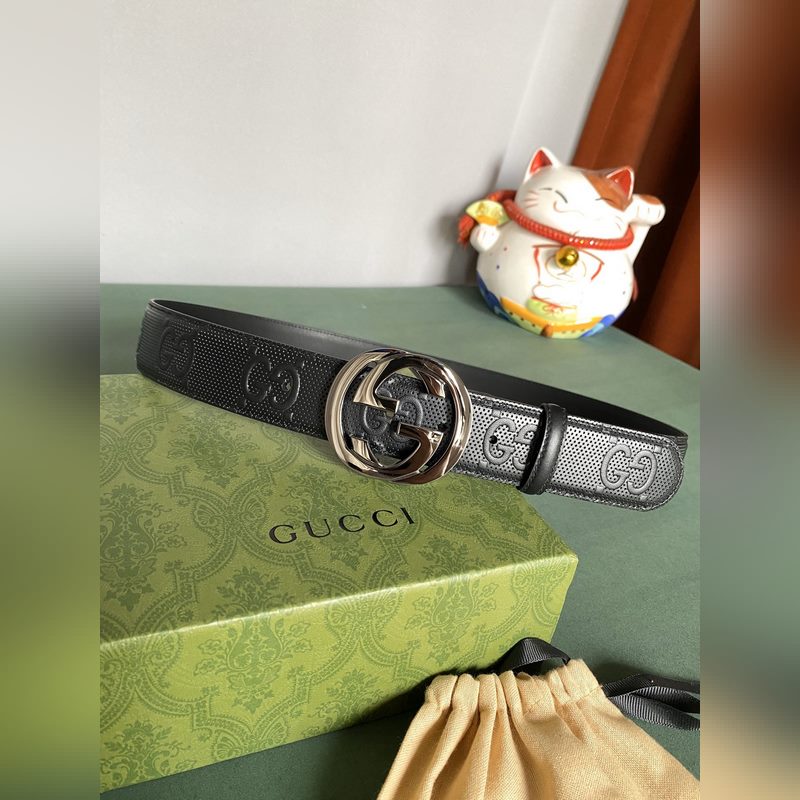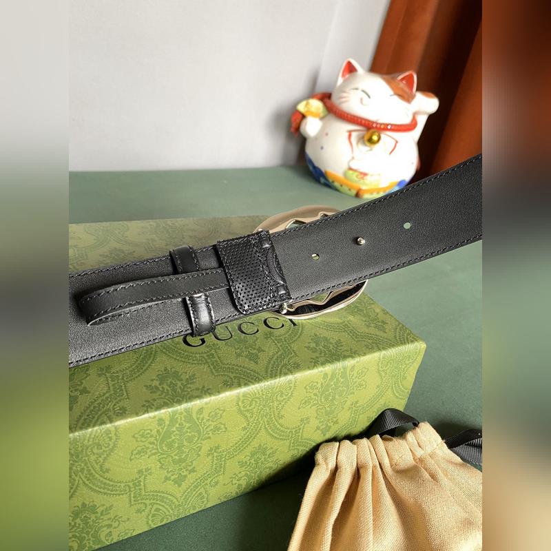 Gucci 4,0 széles Marmont sorozatú nyomott dombornyomott bőröv A Guccio Gucci monogram okosan integrálja a textúra és az anyag változásait, és ennek az övnek a fekete bőrén nyomtatott dombornyomással díszített. Az ikonikus dupla G alakú kiegészítők varázslatosabbá teszik az egész dizájnt.