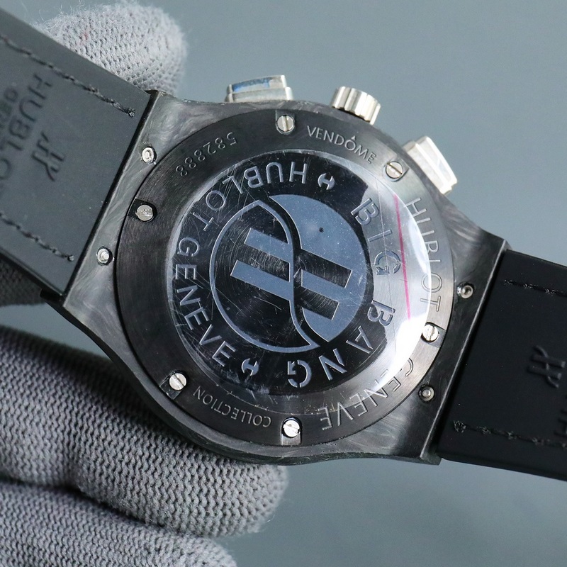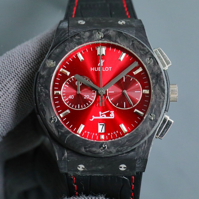 Hublot Classic Fusion 521 sorozatú férfi karóra, tokja szénszálas, finomra polírozott és eredeti, átmérője 42mm, 12,05mm. Japán importált kvarc 5 tűs kronográf energiatakarékos szerkezetet használ, és a szerkezet nulla javításra van állítva. Több mint 100 számlap opció áll rendelkezésre, különböző színekkel, különböző színű csíkokkal és különböző mintákkal, amelyek megegyeznek az eredetivel. A szíj import gumi fejrétegből készült marhabőrből, és az eredeti összecsukható csatból.