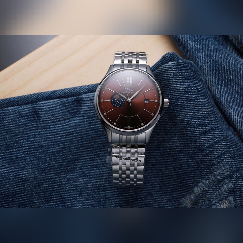 Az IWC Portofino sorozat egyszerű, nagy, háromkezes elrendezést alkalmaz, és a 9 órás pozíciót ügyesen úgy tervezték meg, mint egy kerek nap, hold és csillagok. A vizuális hatás élénkebbé tétele érdekében a holdfázis-korong sötétkék, kis csillagokkal díszítve, mint egy csillagos éjszakai égbolt…….