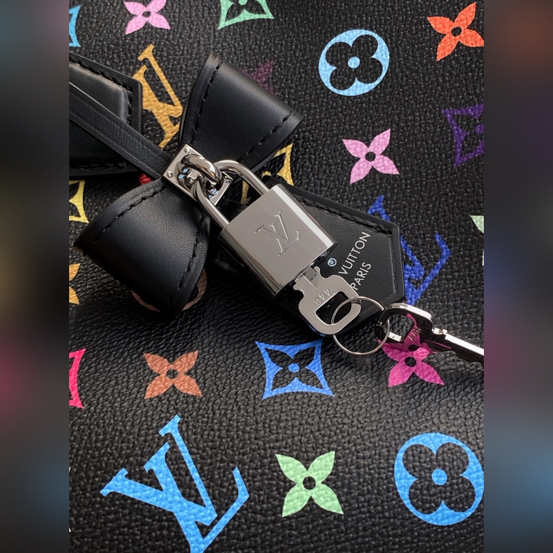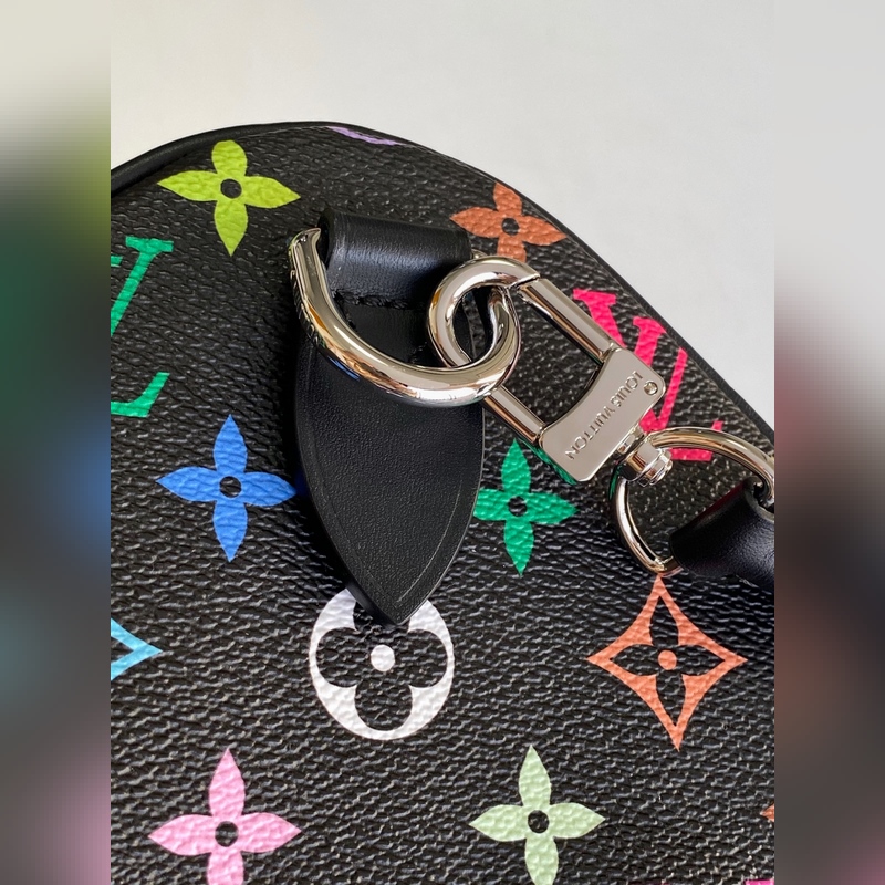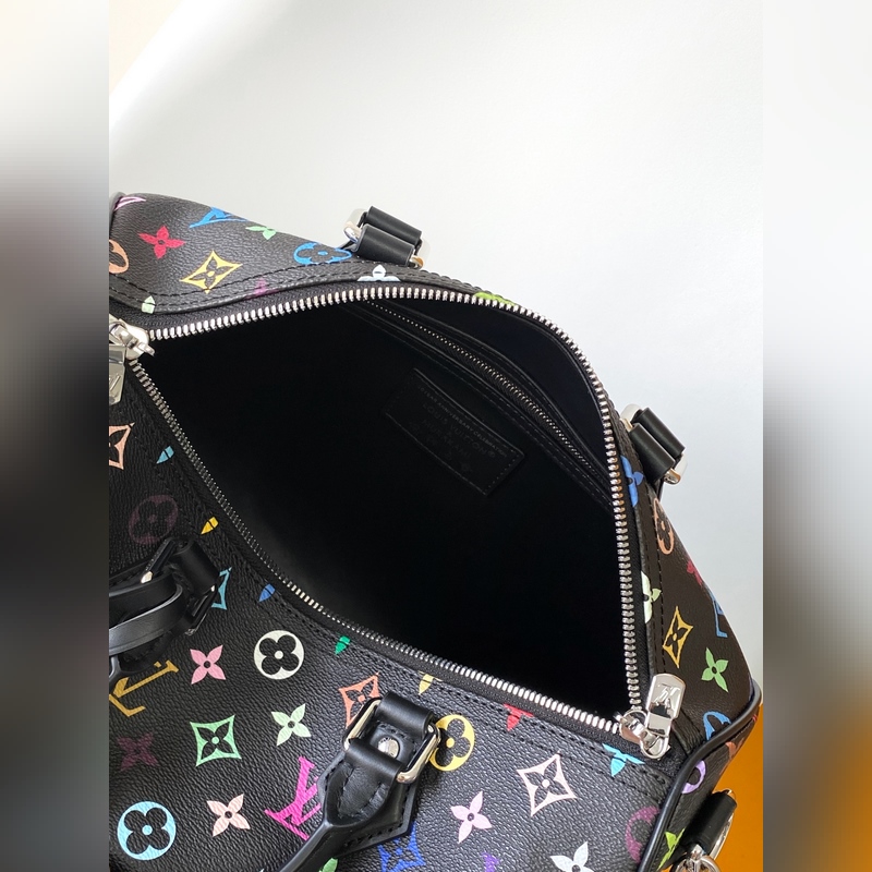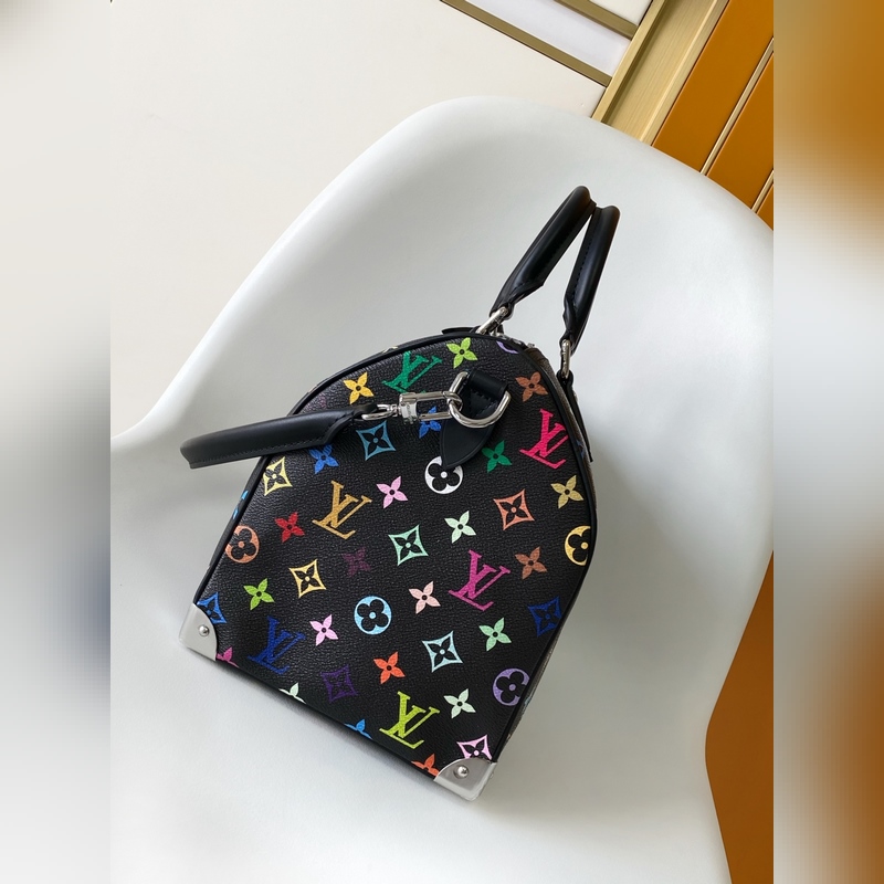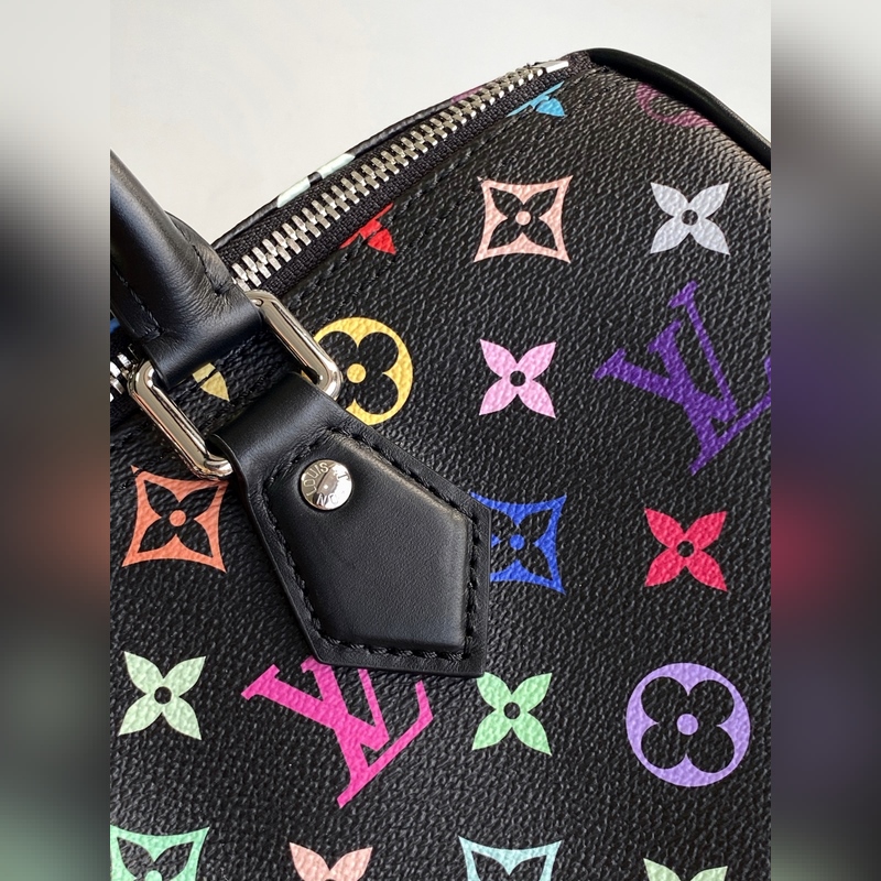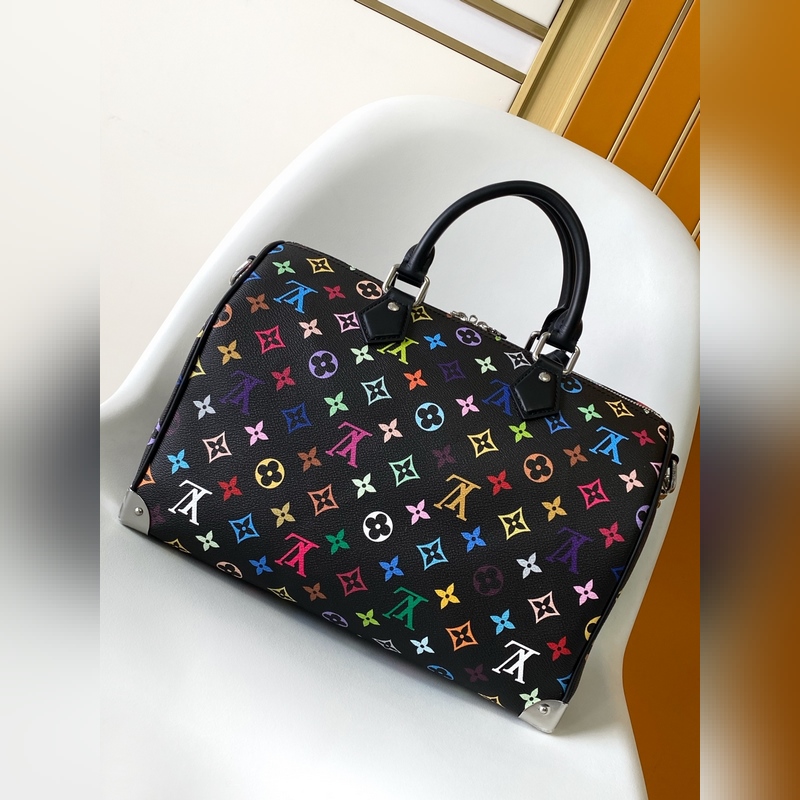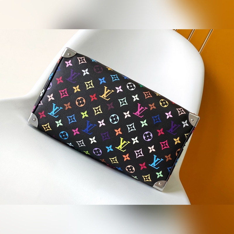 M13257 Top Original 163c01 Chip Ez a Speedy Soft 30 kézitáska puha bevonatú vászonból készült, színes szivárvány tónusú monogrammintával, amely kiemeli a Louis Vuitton x Takashi Murakami re-edition sorozat dinamikus stílusát. Marhabőrből készült Toron fogantyú és levehető vállpánt, a fém sarkok a klasszikus poggyászelemeket idézik, a masni alakú kulcstáska és lakat pedig márkajegyeket ad. 30,0 x 21,0 x 17,0 cm (H x Ma x Szé)