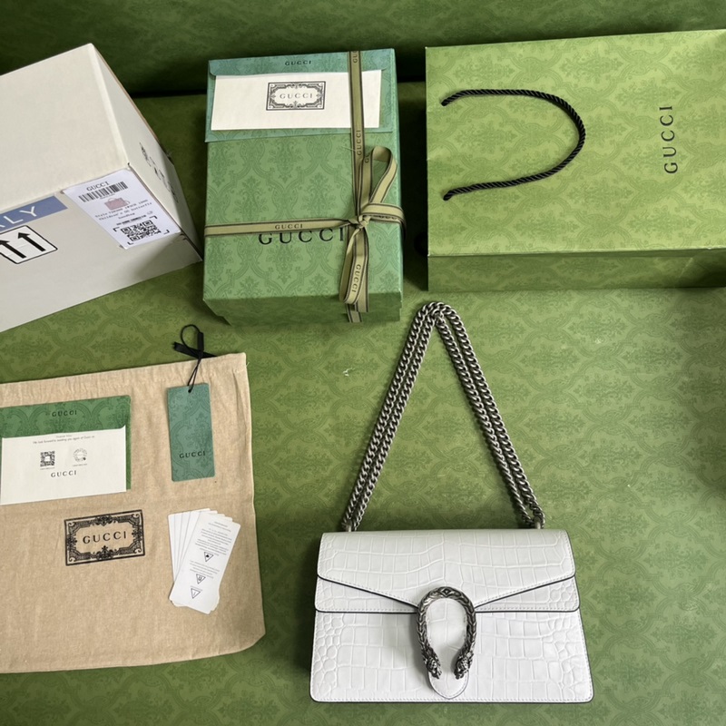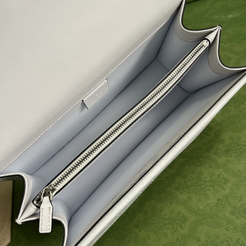 A texturált tigrisfej dizájn a sorozat klasszikus jellemzője, amely a klasszikus design szimbólumok emlékeit idézi. A macskák végigfutják a márka dizájnvilágát, közvetítve a márka elbűvölését a természet vad szépsége iránt. Ez a darab vintage ezüst tónusú hardver, fehér és elefántcsont GG fehér krokodilszemcsés marhabőr anyaggal párosítva.