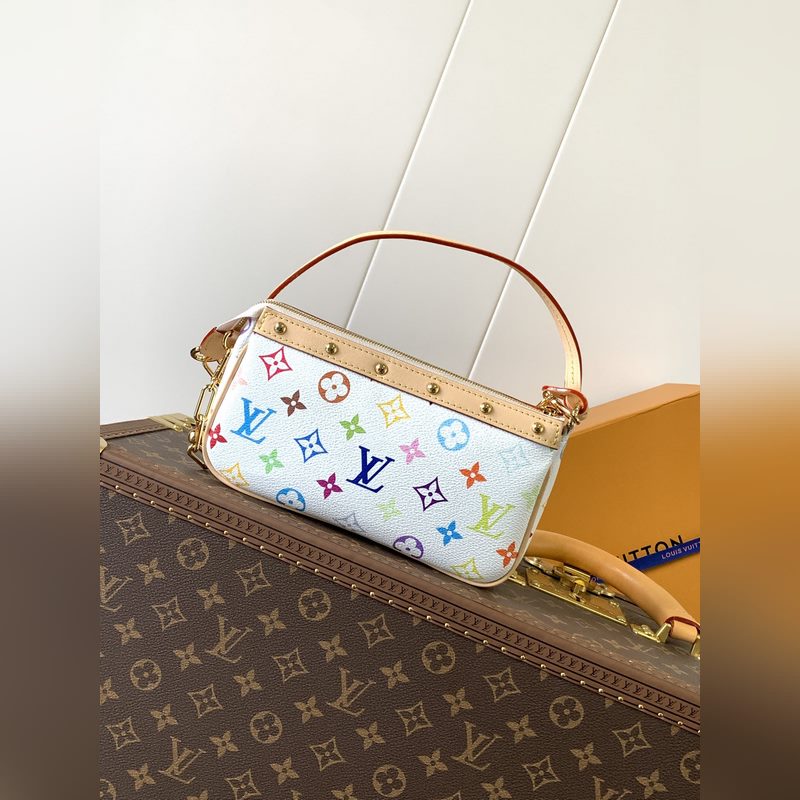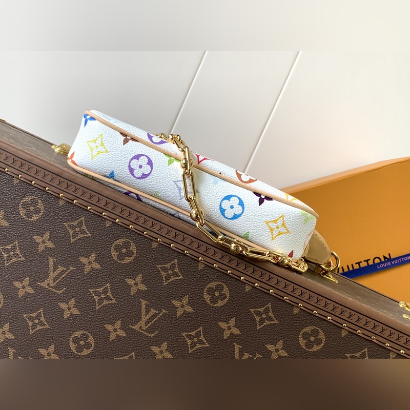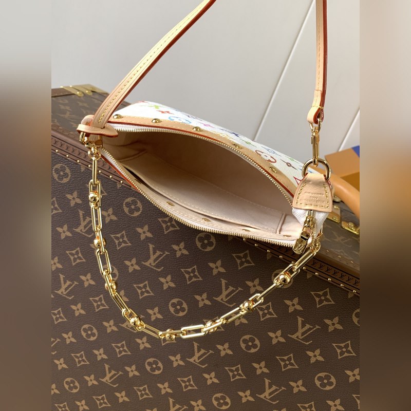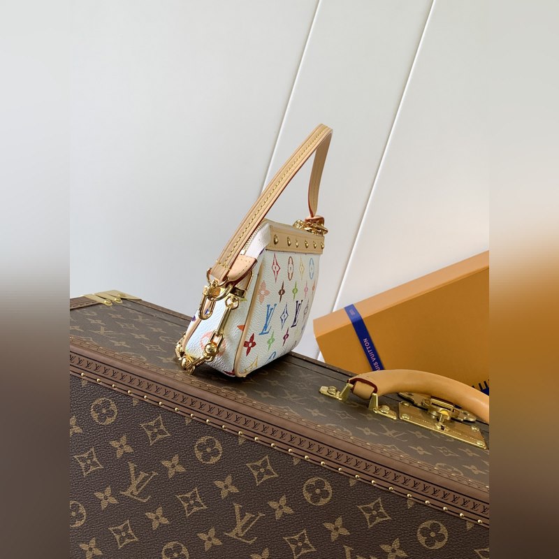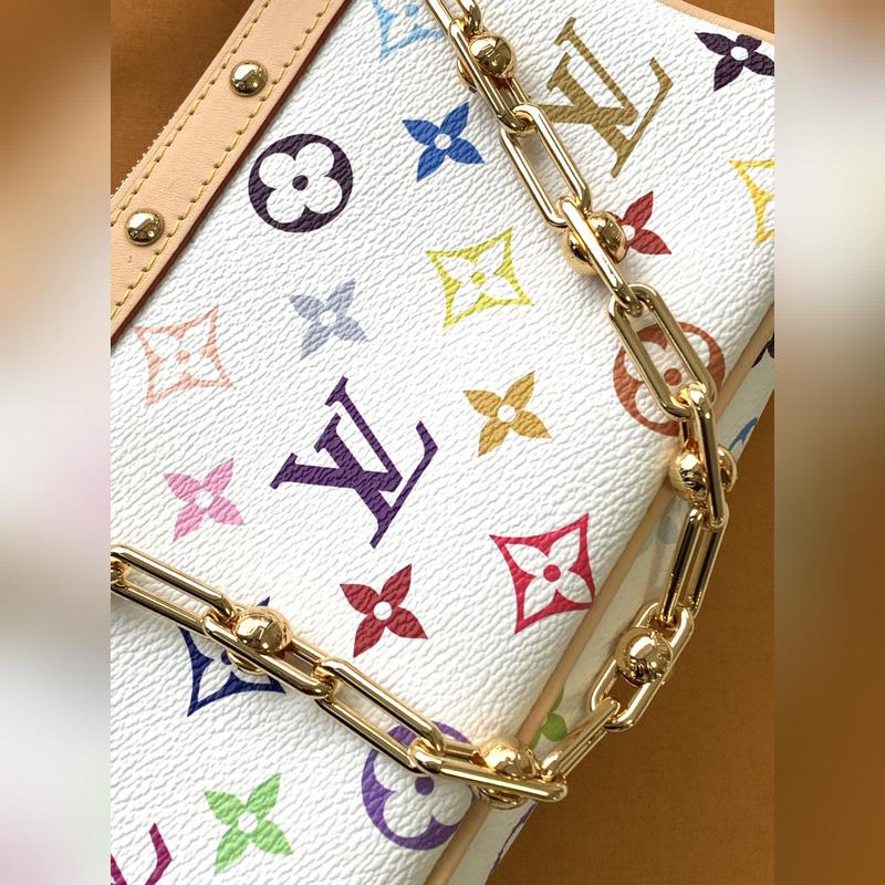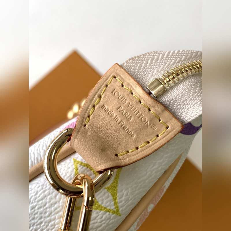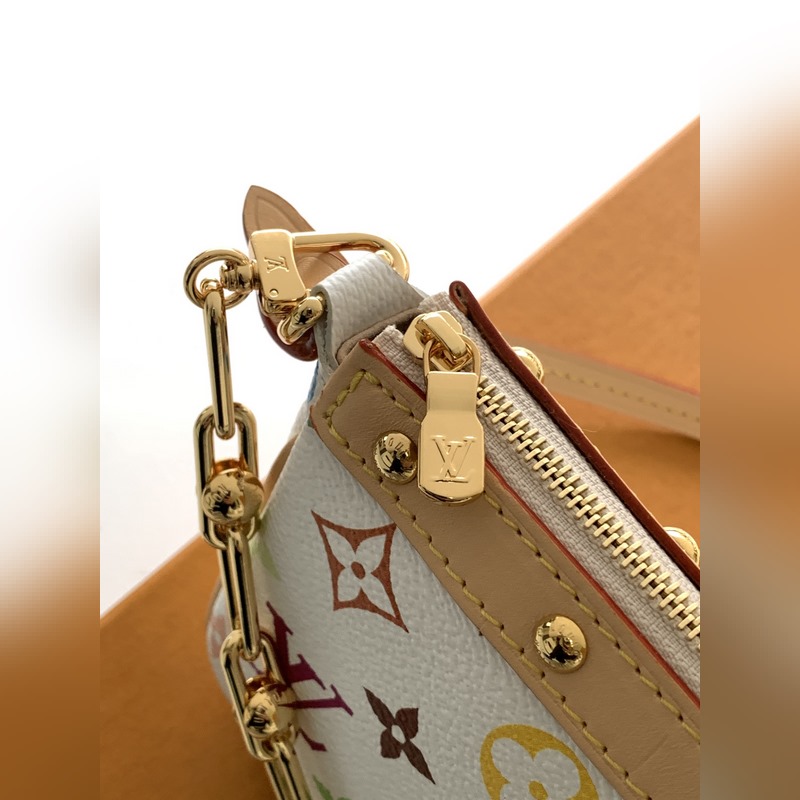 Ez a Pochette Accessoires kézitáska bevonatos vászonból készült, és a Louis Vuitton x Takashi Murakami határokon átnyúló együttműködési sorozat okos stílusát értelmezi színes Monogram mintákkal. A marhabőr borítás és a vakító fémrészek a kifinomult részletek simításai, a levehető vállpánt és lánc pedig rugalmas hordozást tesz lehetővé.