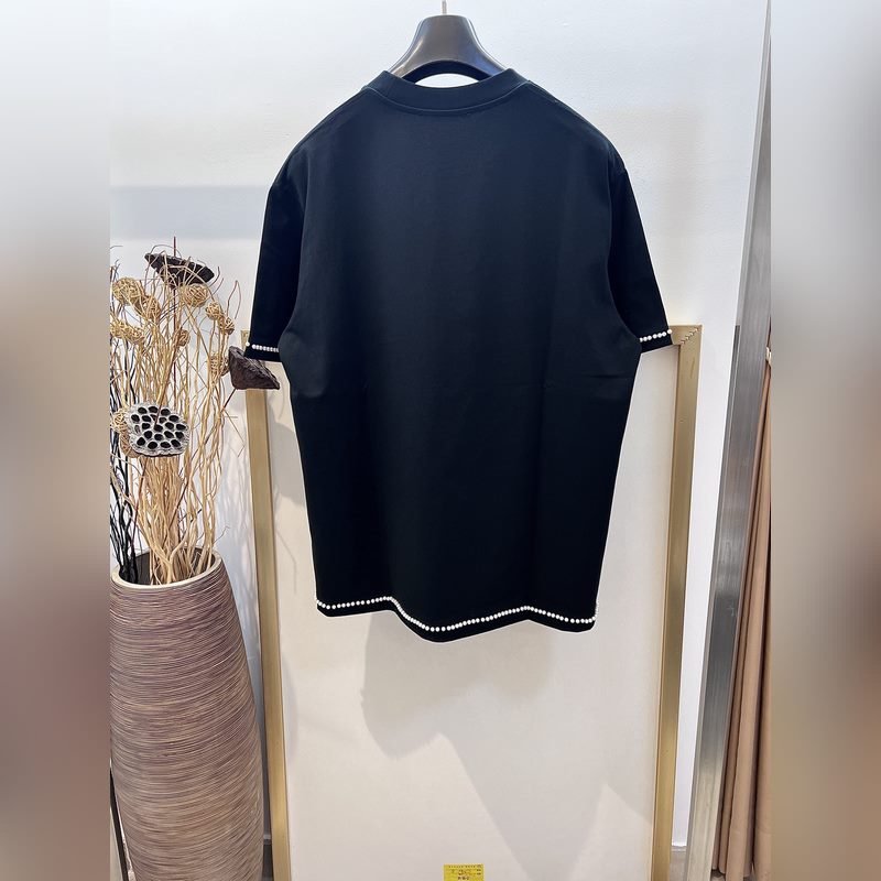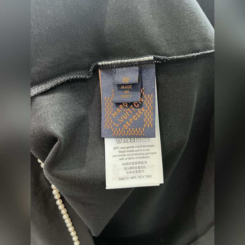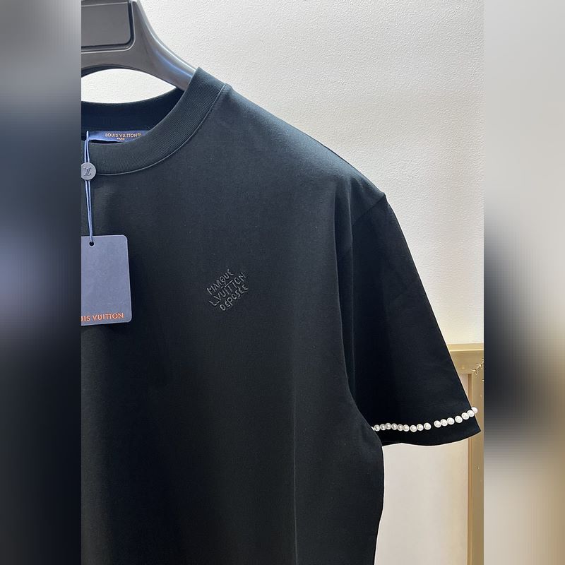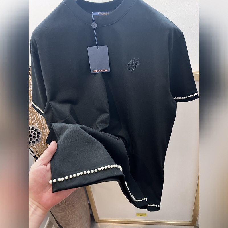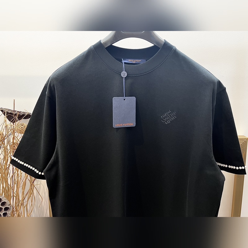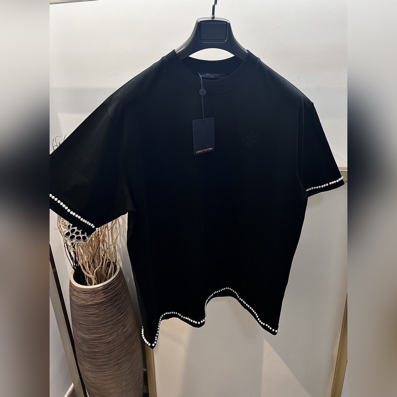 1V Louis House Gyöngy-díszítésű pamut rövid ujjú póló Ezt a pamut pólót gyöngyházhatású szegecsekkel díszítették az ujjakon és a szegélyen, amely Dandy stílusban élénkíti a klasszikus sziluettet. A fényes Marque L.Vuitton déposée 3D hímzés a mellkason egy kis kifinomultságot kölcsönöz.