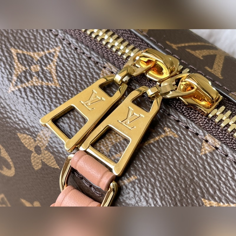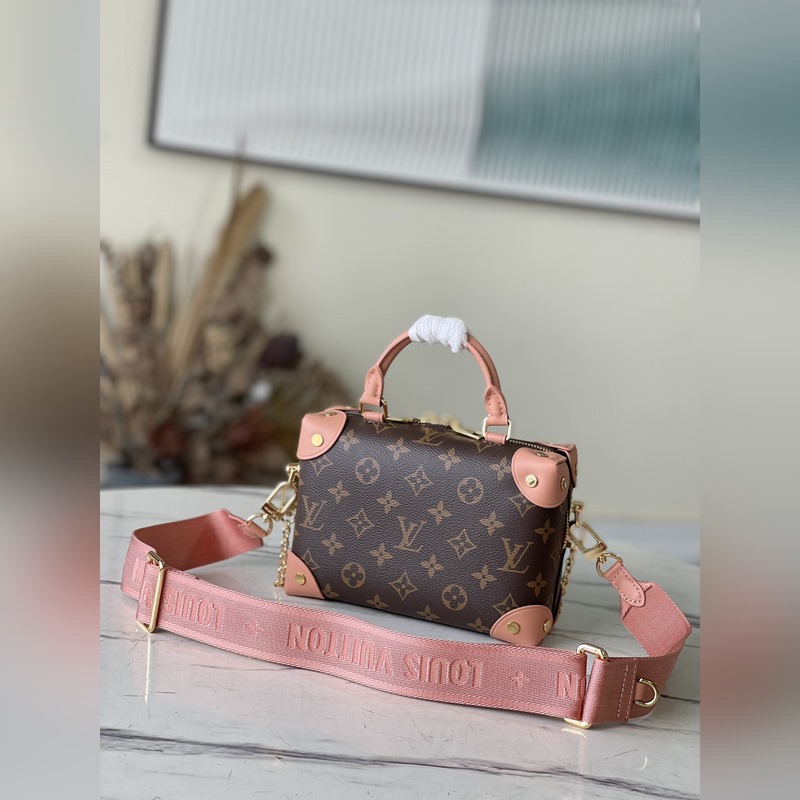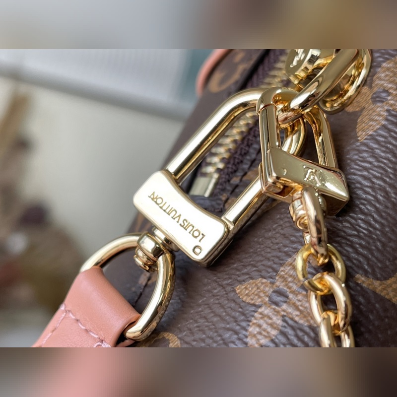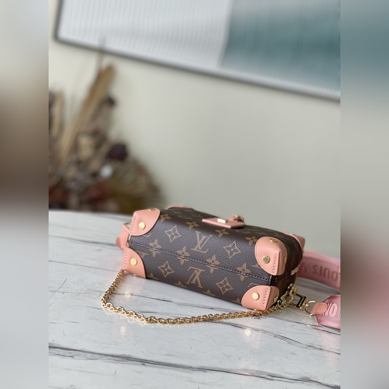 A Louis Vuitton csomagtartókészítési örökségét tükröző táska vászonból készült, bőrszegélyekkel és bőr névtáblával, hajózási ihletésű láncokkal, hímzéssel és széles, levehető vállpánttal. Méretek: 20,0 x 14,0 x 7,5 cm