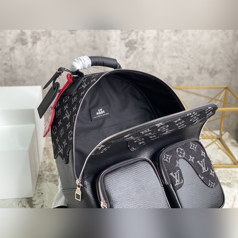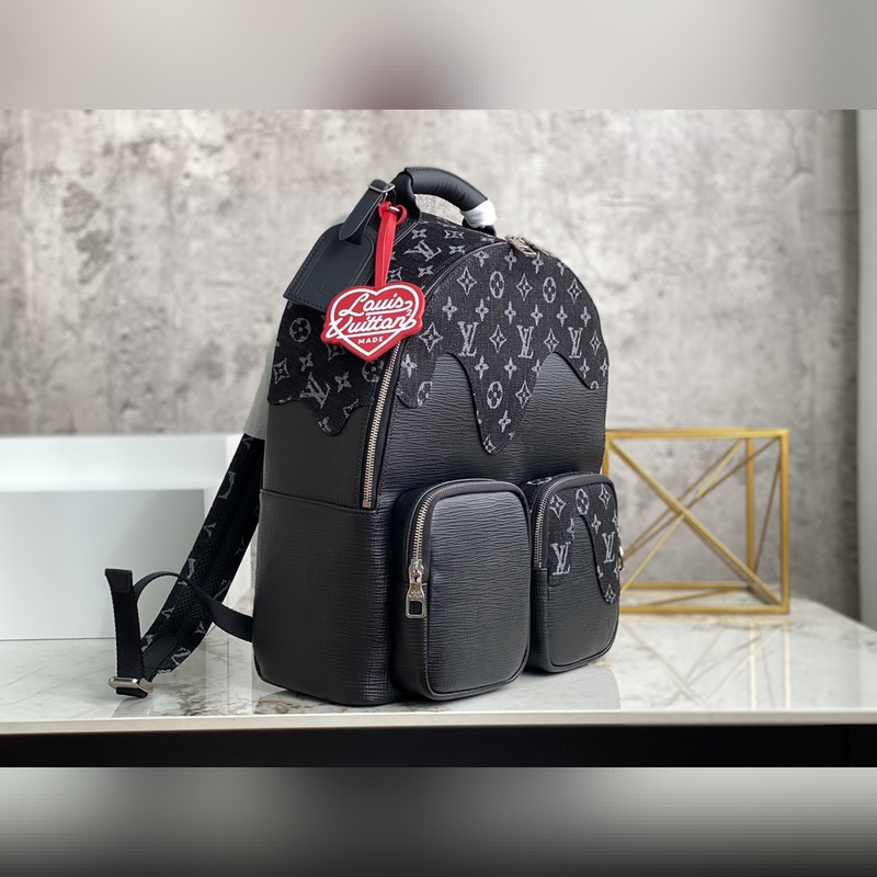 LV M45973 Grammy (farmer) hátizsák sorozat MULTI OCKET hátizsák Louis Vuitton és Nigo japán tervező ismét összefogott, hogy a Monogram Dri dizájnt beépítsék a Multi ocket hátizsákba. Az ikonikus Monogram farmer lebegő megjelenést kölcsönöz a finom szemcsés Taurillon marhabőrnek, a szív alakú címke pedig egy feltűnő sarkot emel ki, zsebekkel és egy laptop befogadására alkalmas fő rekesszel. Méretek: 30 x 40 x 15,5 cm.