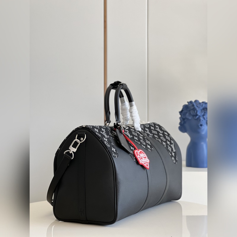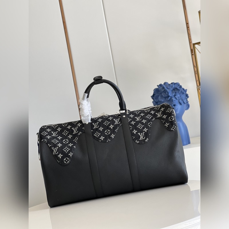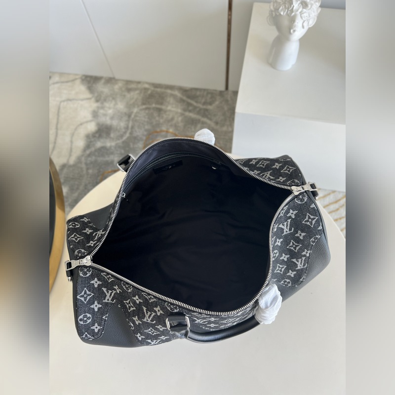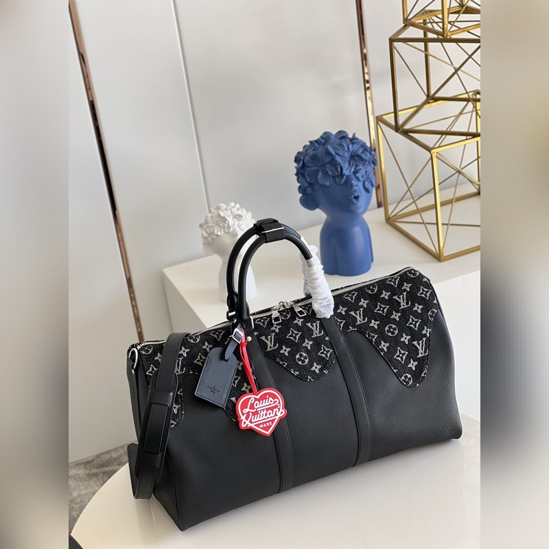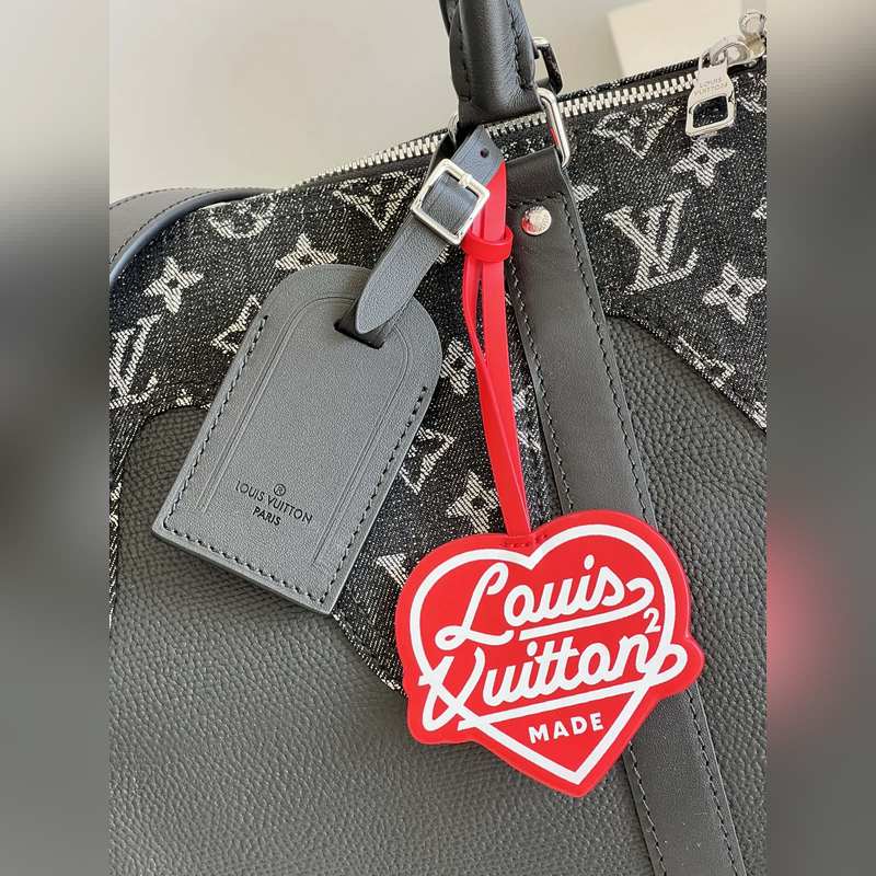 LV M45975 Black Denim Travel Bag Collection Cruise 2024 A Kee teljes farmer utazótáska a japán utcai ruhatervező, Nigo Monogram Dri dizájnjával frissült. A klasszikus mintás farmer a finom szemcsés Taurillon bőrön folyik át, míg a szív alakú címke színpompát kölcsönöz. Kézipoggyász méretei bőséges hellyel. Részletes jellemzők 50 x 29 x 23 cm (hosszúság x magasság x szélesség) (Ez a modell túl nagy, és nincs hozzá doboza)