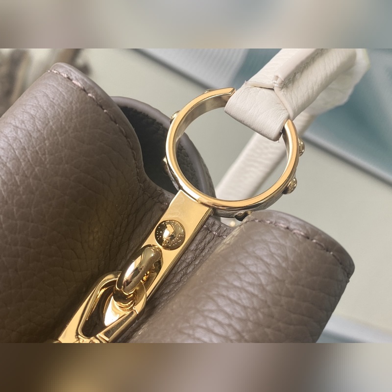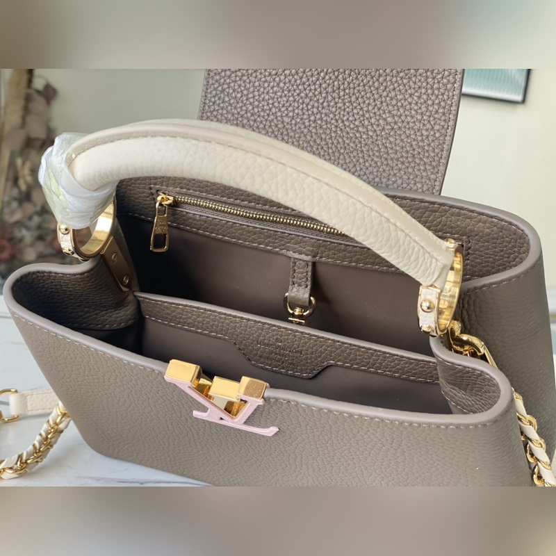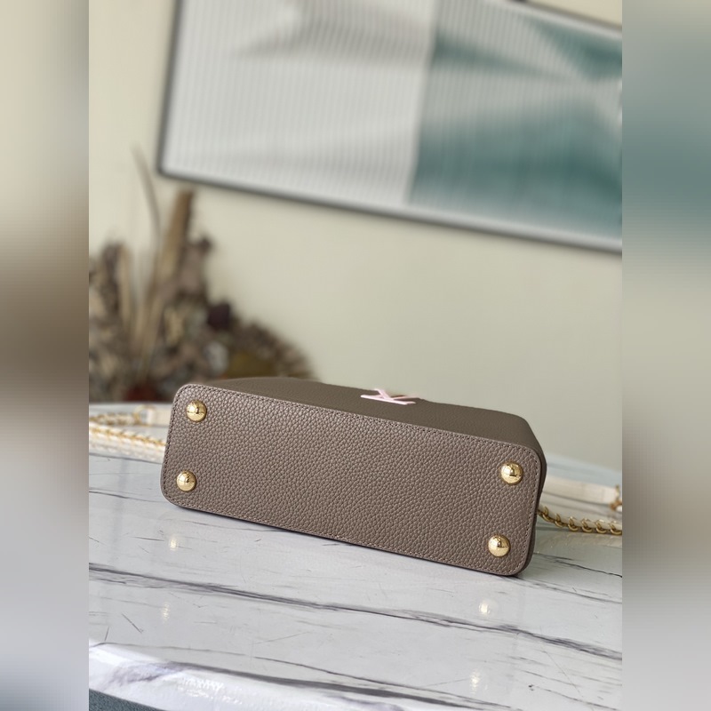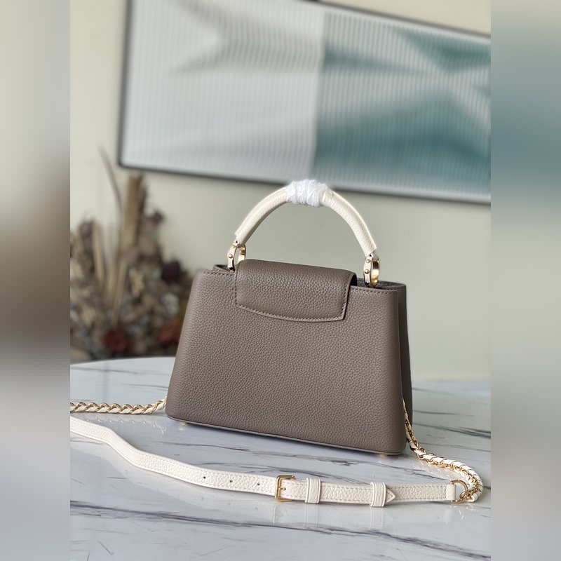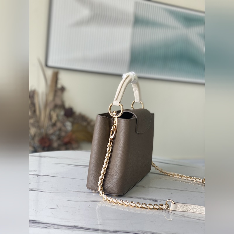 A kis kézitáska a bőr szezonális színében van visszaadva, a vállpánt pedig a puha bőrt és a fém láncfonást köti össze, így a márka kifinomult kivitelezését mutatja. Méretek: 27 x 18 x 9 cm
