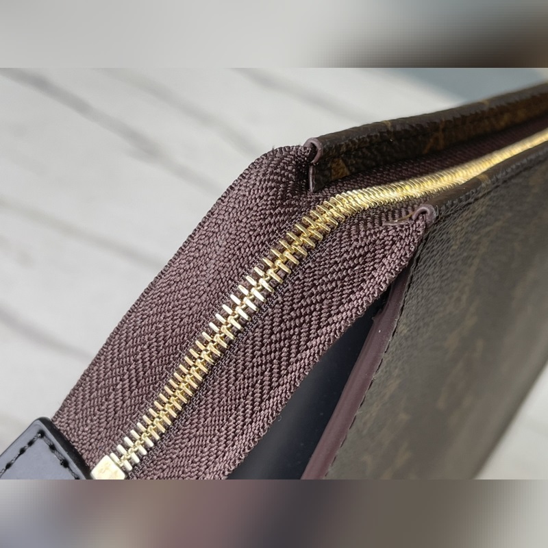 Stílusos módot kínál személyes tárgyai szállítására. A minőséget és a kifinomultságot idéző időtlen Louis Vuitton monogram vászonból és fekete marhabőrből készült, arany cipzárral. Több, mint egy egyszerű piperetáska, okos sziluettje van, amely négy kártyanyílást és egy foltos zsebet tartalmaz a dokumentumok számára. Méretek: 25 x 20 x 5,5 cm (H x Ma x Sz)