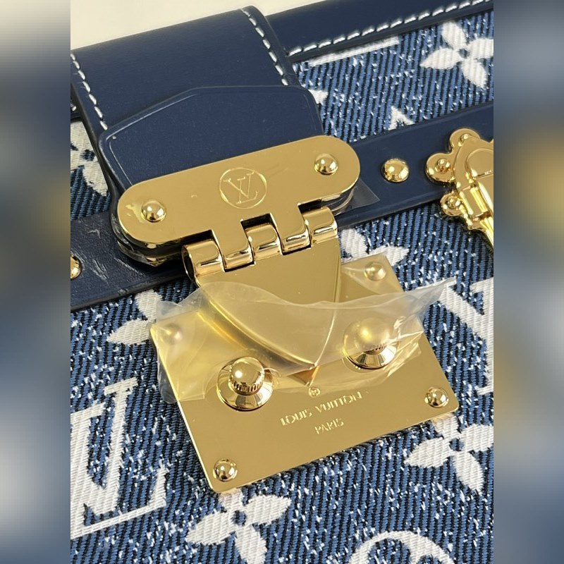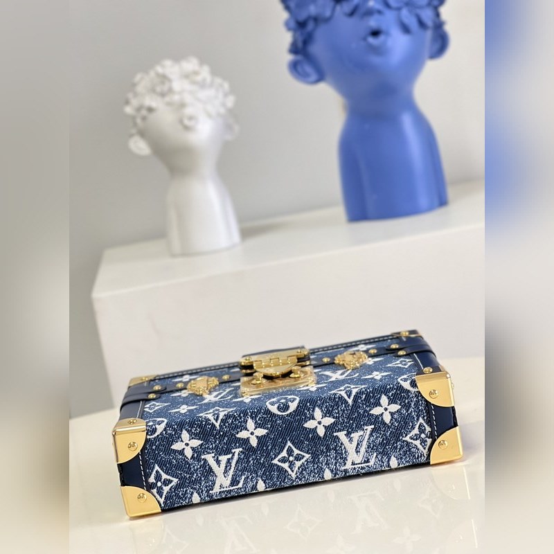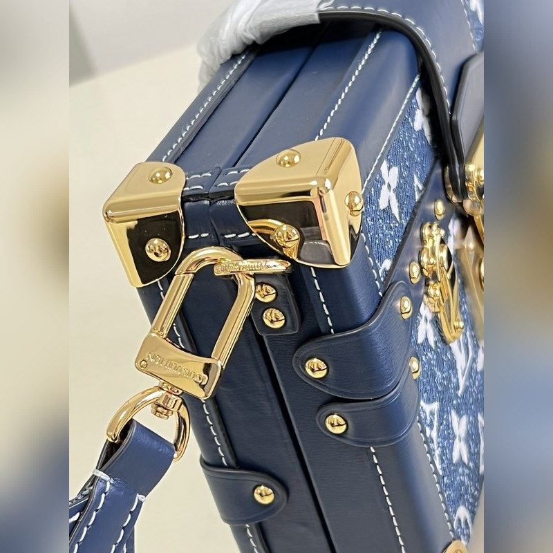 Nicloas Ghesquière kellemes hangulatot kölcsönöz a Petite Malle kézitáskának; a homokkal mosott farmer a Monogram jacquard mintát indítja el, az S-lock csat és a marhabőrből megerősített sarkok pedig a klasszikus kemény tok elemeket folytatják.