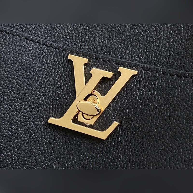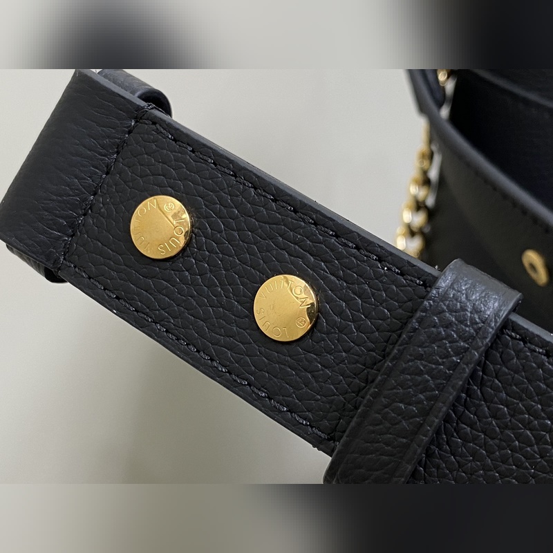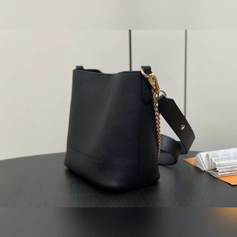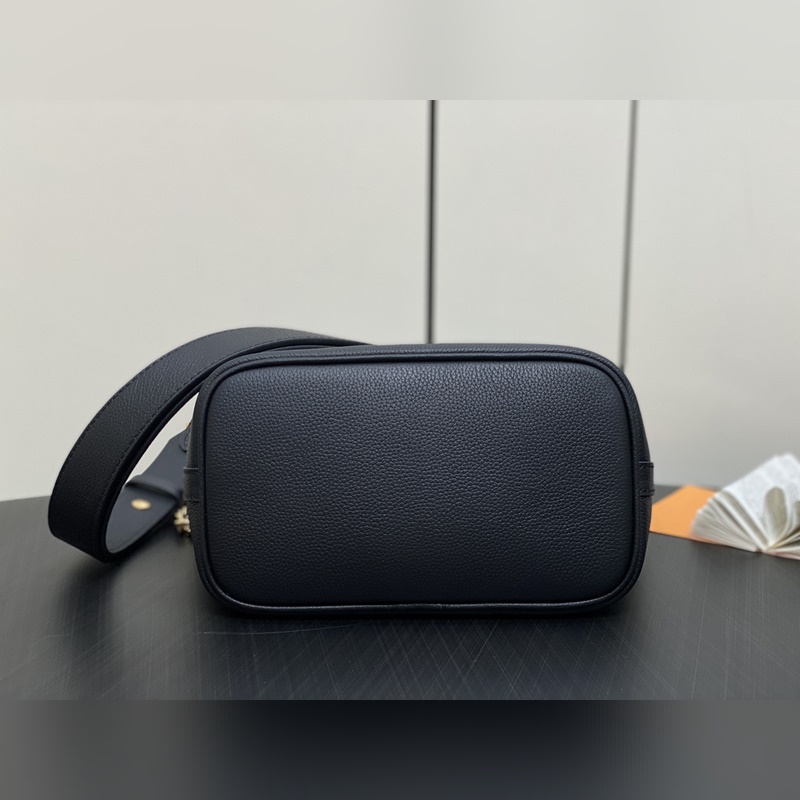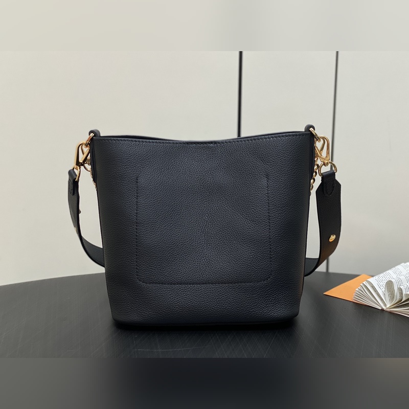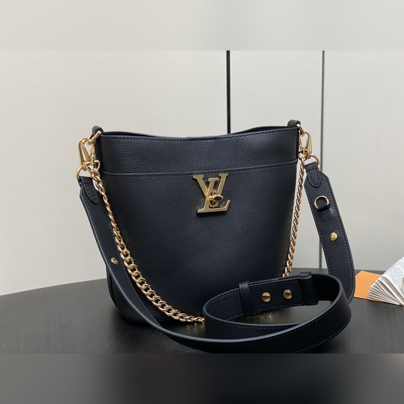 LVM24006 Fekete Full Leather Bucket Bag Chain Bag Collection Lock and Walk kézitáskák M24006 M24638 Sima vödörtáska szemcsés borjúbőrből. Könnyű és kényelmesen hordozható, ez a táska az alkalmi kényelmet párizsi stílussal ötvözi. Az LV kormányzárral rögzített nagy első rekesz lehetővé teszi a legfontosabb dolgok könnyű elérését. A levehető intelligens szíj és az arany láncfogantyúk különböző hordási stílusokat biztosítanak. Méretek 20 x 20,5 x 12 cm.