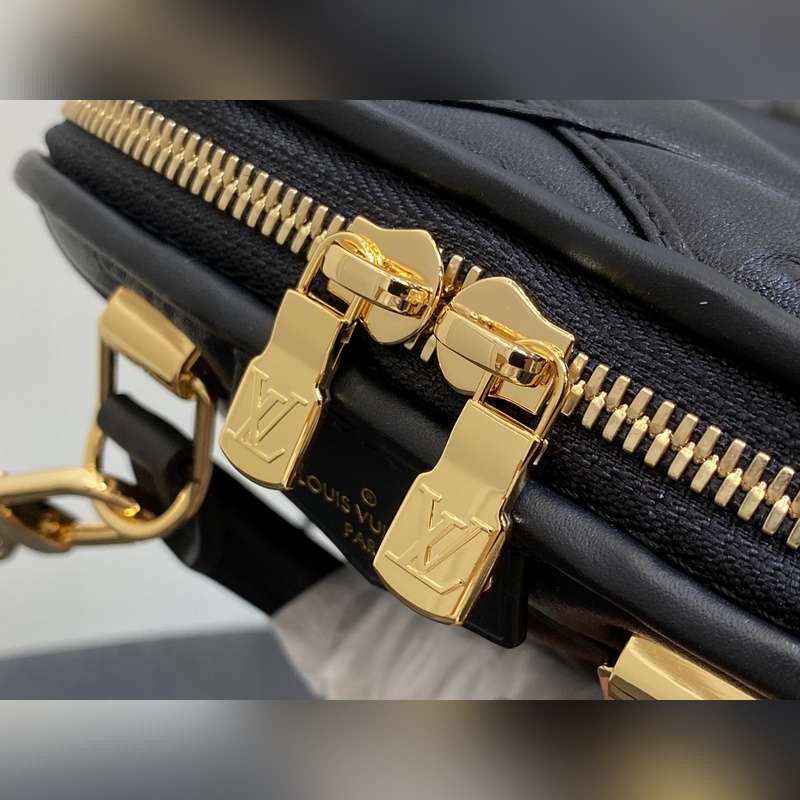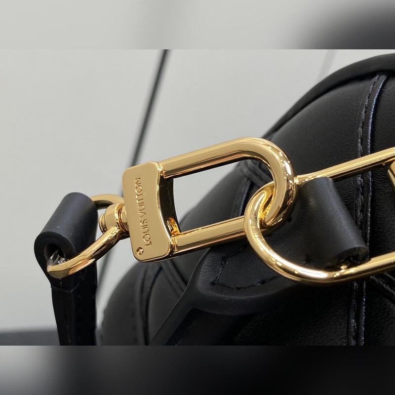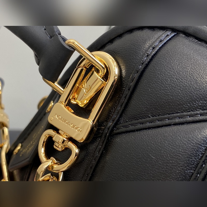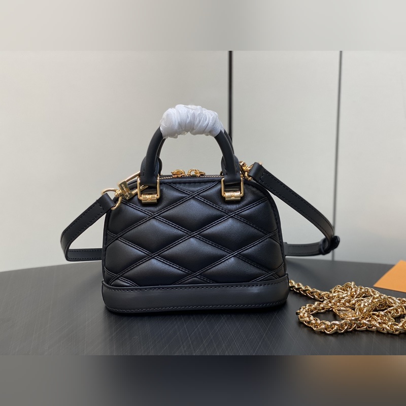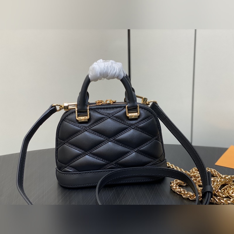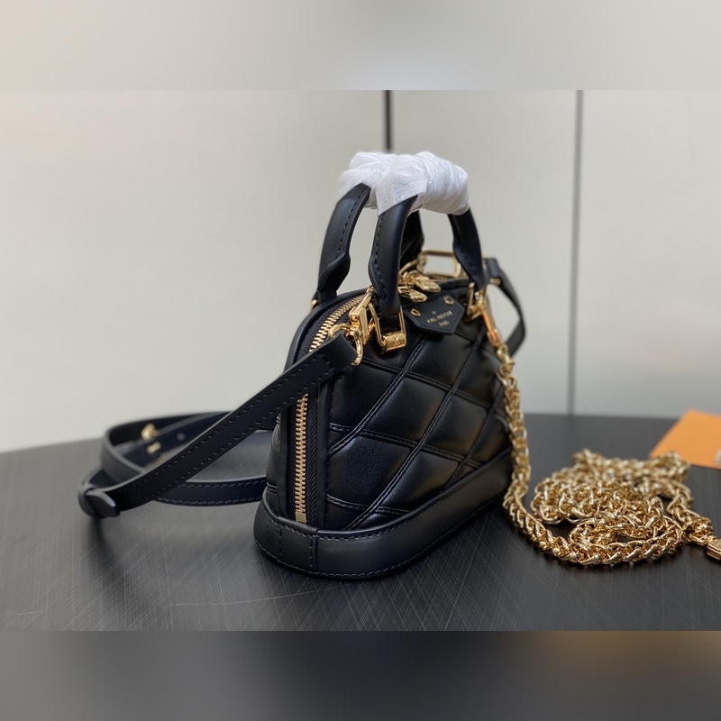 LVM83048 Fekete All Leather Shell Bag Collection NANO ALMA Handbag Nano Alma Handbag A Louis Vuitton klasszikus Alma kézitáskájának miniatűr mása. Ez a remek kézitáska puha báránybőrbőrből készült, a klasszikus Louis Vuitton utazóláda béléséből kölcsönzött steppelt Malletage mintával, két fogantyúval, lánccal és levehető és állítható bőr vállpánttal, változatos fazonnal és hordási móddal. 18 x 12 x 8 cm.