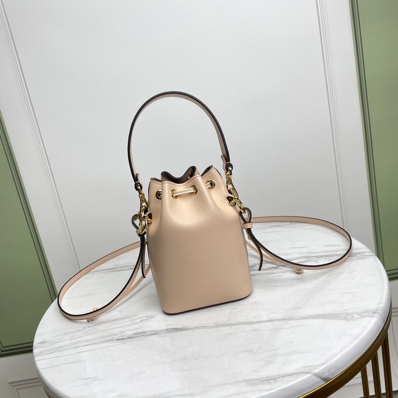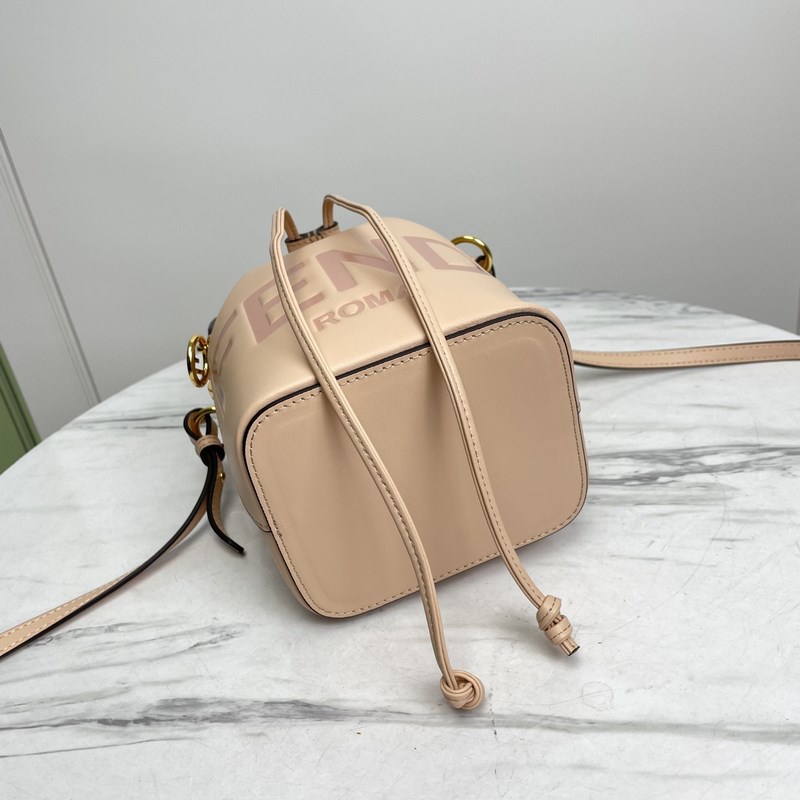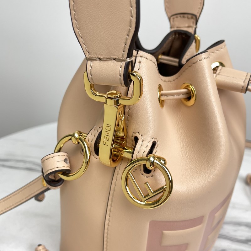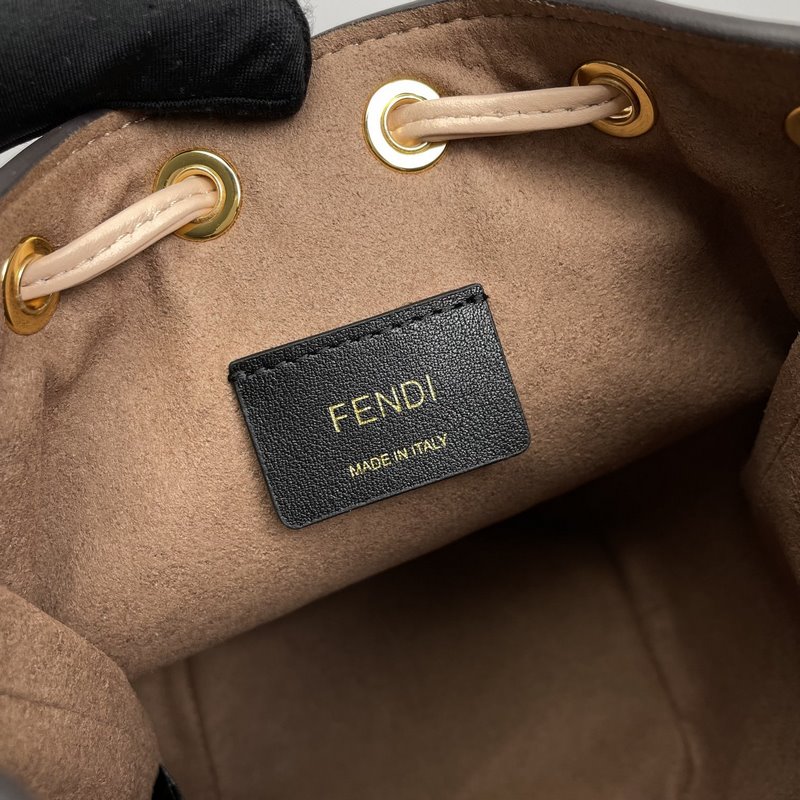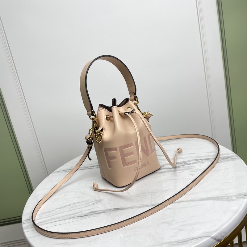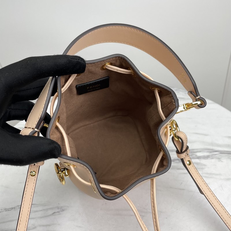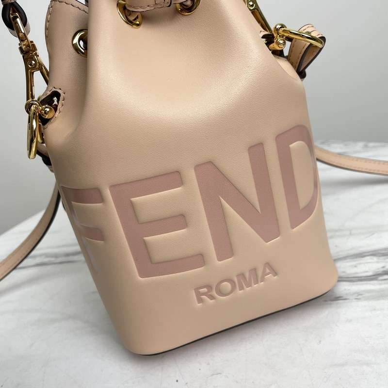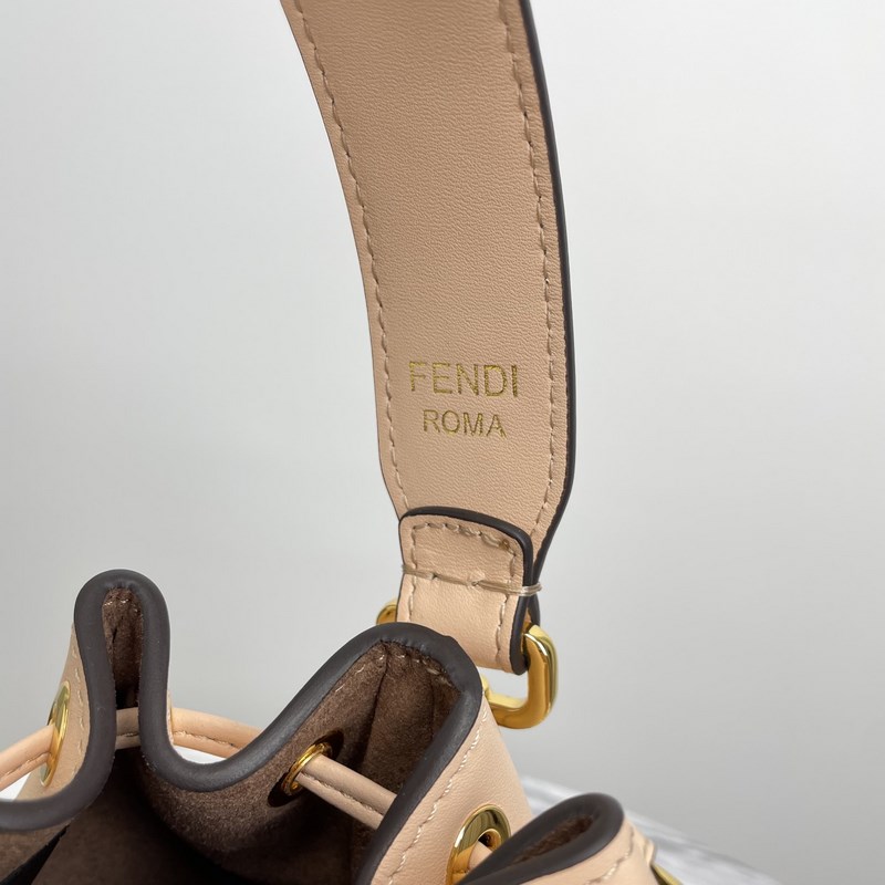 FEND1 A Mon Tresor kis vödörtáska húzózsinórral és Fend1 fém logóval díszített. Két levehető vállpántja van, egy hosszú és egy rövid, amely egy vállon vagy a testen át hordható. Melegbélyegzett FENDI ROMA díszíti.
