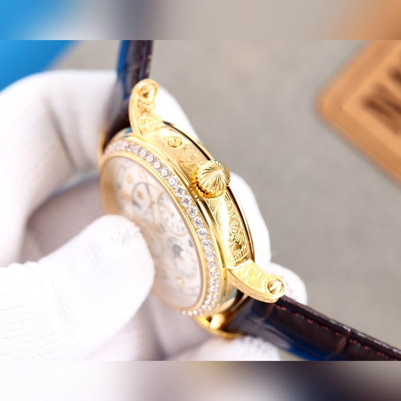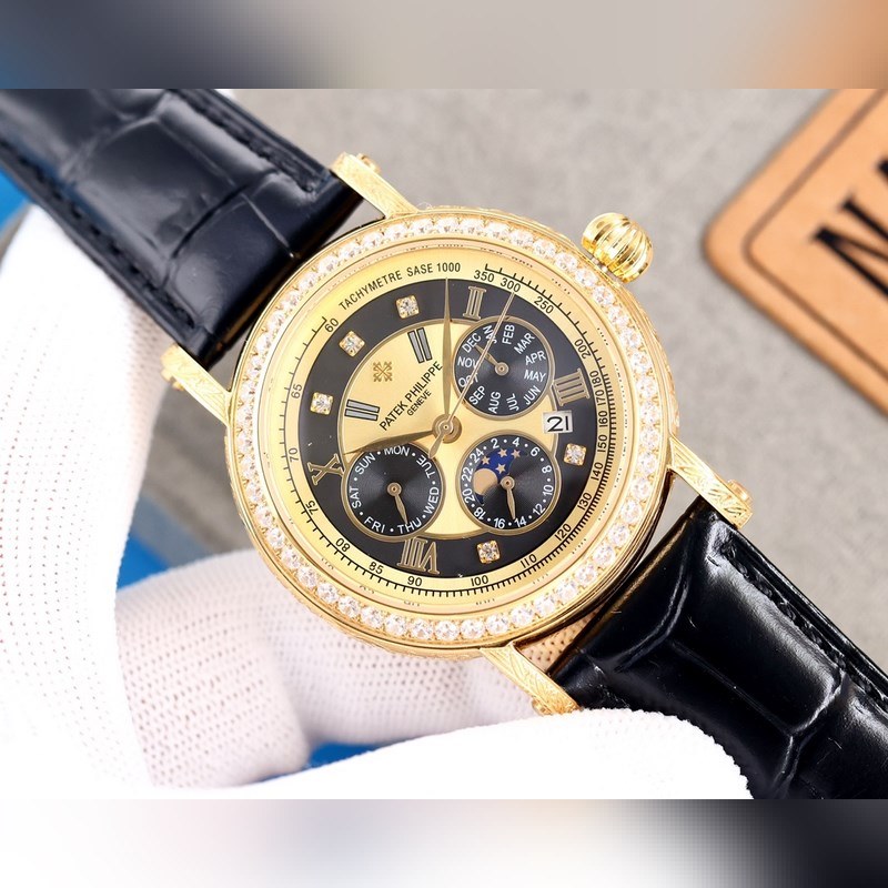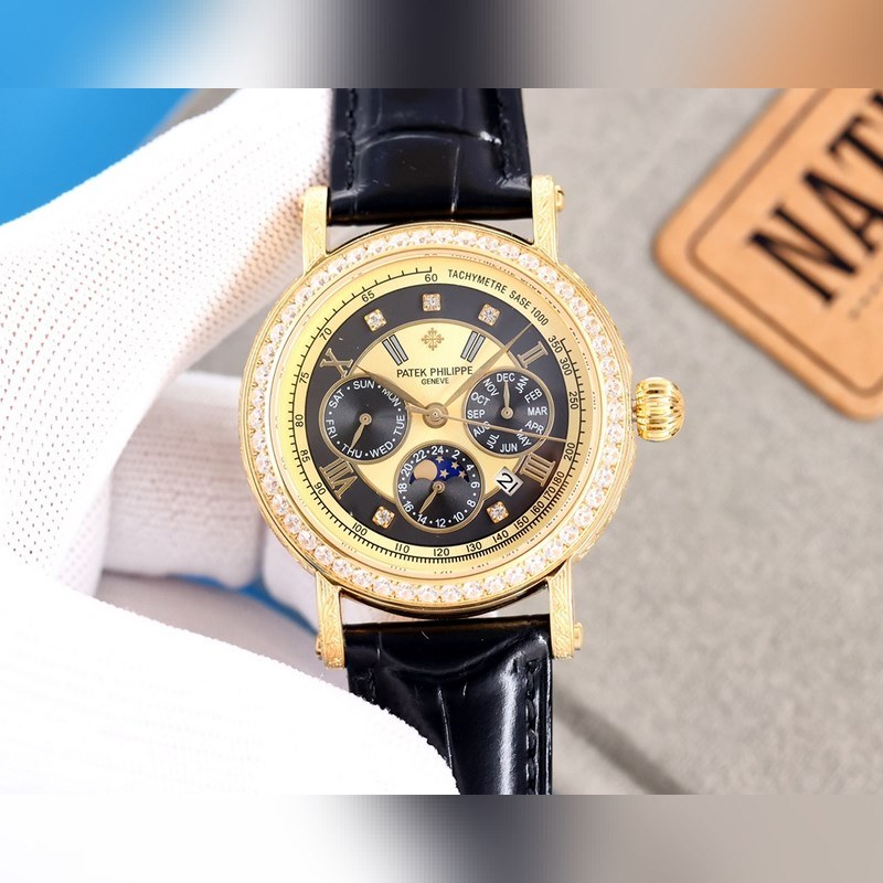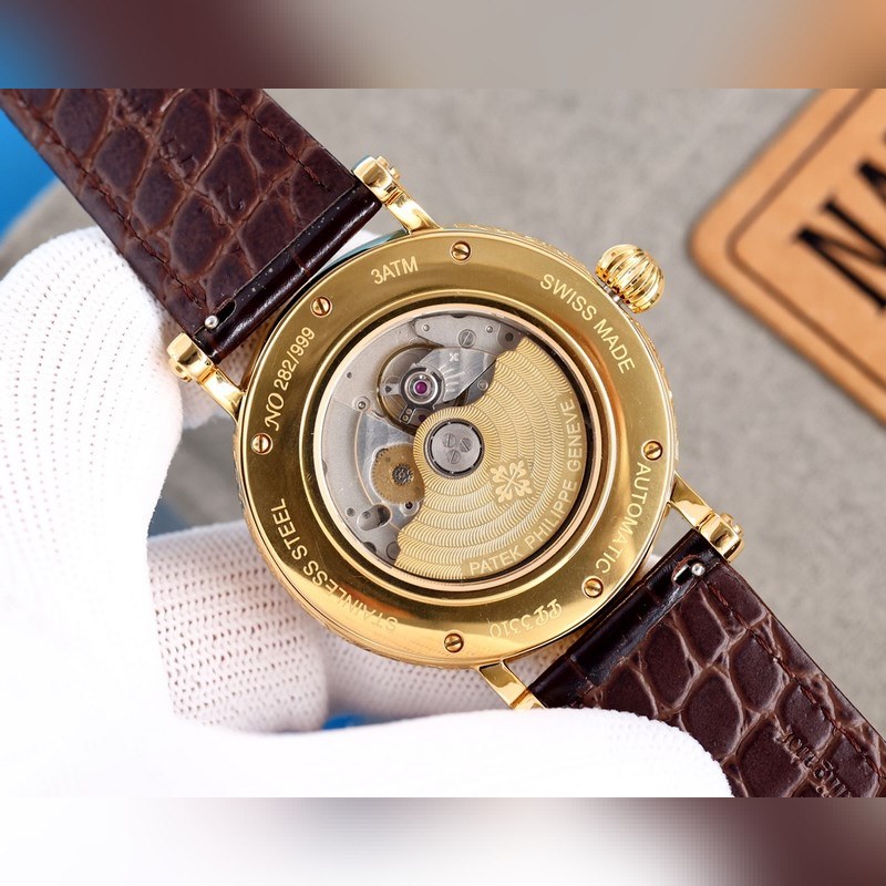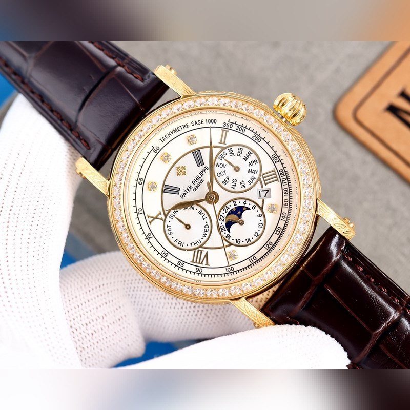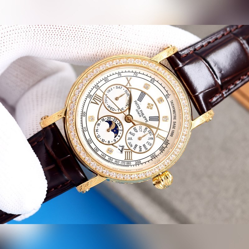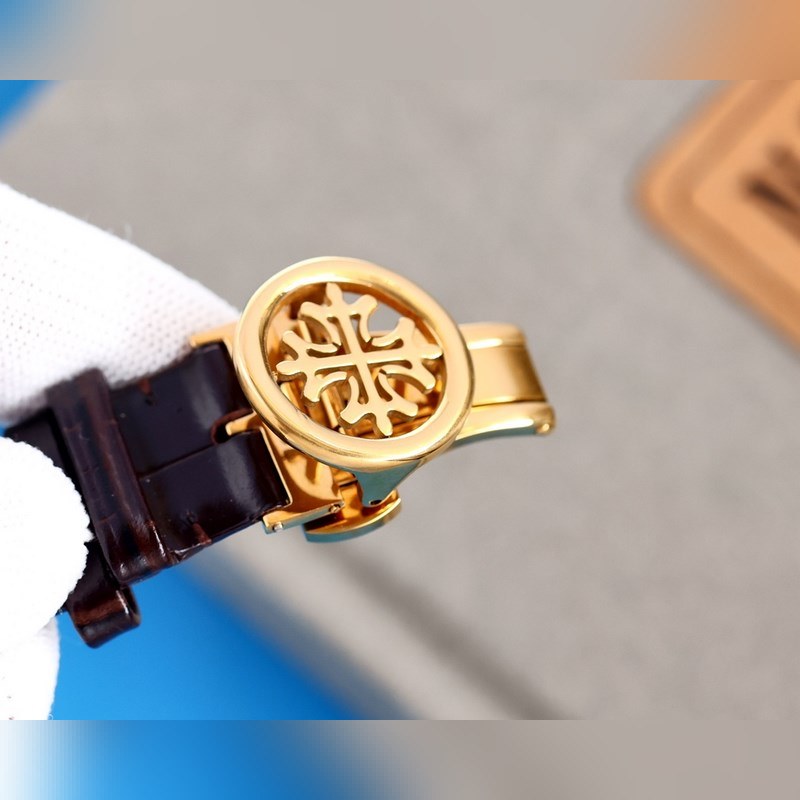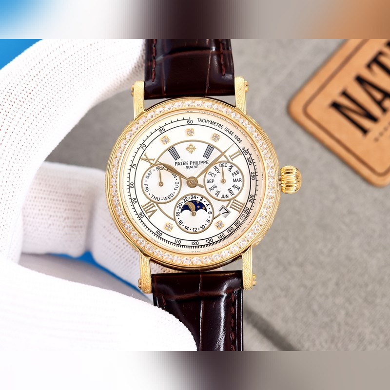 A 42 mm-es óra átmérője megfelel az átlagos férfi csuklóméretnek, ami nagyon üzleti és hétköznapi. Az egész óraház kézzel faragott mintákkal, ami erős vizuális hatást kelt és felejthetetlen, a tényleges textúra pedig szebb. 1 Importált 9100-as többfunkciós szerkezet (nulla javítás) funkcióval felszerelve (24 óra, hét/csillag/hónap) Ez az óra 38-48 órás teljesítménytartalékkal rendelkezik. 2 Importált 316L-es rozsdamentes acél, 18k minőségi kemencés vákuumbevonattal 3 Exkluzív testreszabott négyzet alakú bőrszíjjal 4 Kopásálló és karcálló zafírüveg tükör, napi 530 méter vízállósági besorolás. Patek Philippe (Patek Philippe) Egyszerű, de nem egyszerű