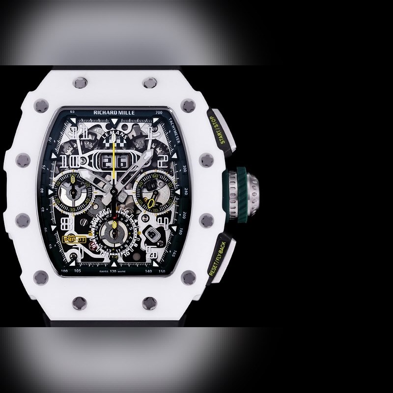Szénszálas anyag visszaadja az eredeti textúrát Kiváló minőségű eredeti fekete kerámia A fehér kerámia visszaadja az eredetit A tökéletes ergonomikus kialakítás egybeesik a márka tökéletességre való törekvésével. Az RM 011 minden alkatrésze funkciójának esztétikai kifejeződése. Az RM 11-FM óra megőrizte a legfelismerhetőbb ikonikus formát, de a felhasznált kivitelezés még messze túlmutat a múlton. A tokhoz a titán fazon látható a képen, de választhatunk rózsarany és titán változatok közül is, de mindegy melyik, mindegyik finoman kidolgozott szálcsiszolt felülettel rendelkezik, amihez csiszolt letörések párosulnak, ami éles kontrasztot mutat. A 7750-es kronográf mechanikus szerkezettel felszerelve, jól láthatóan funkcionális betűtípusokkal (Start/Stop és Reset/Fly-back) jelölve, kialakítását az F1-es versenyautók pedáljai ihlették. Mindezek az optimalizálási változtatások sportosabbá és divatosabbá teszik ezt az RM 11-FM flyback kronográf automata órát, mint a korábbi stílusok.