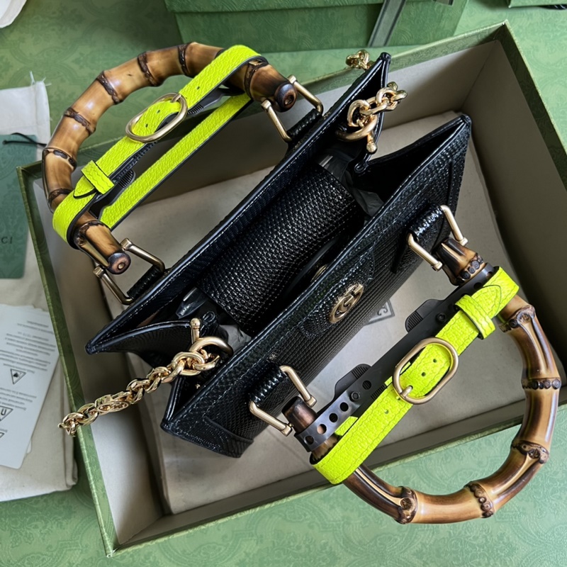 《Eredeti zöld dobozos csomagolás teljes készletével》 sorozat, szuper elegáns, bájos és fényes ritka fluoreszkáló fekete gyík mintás táska báránybőr béléssel, teljes réz lánccal (1 méter hosszú), natúr bambusz fogantyúval mini méret, de ez a négyzet alakú táskatest tulajdonképpen nagy kapacitású, ingázásra teljesen megfelelő. Szalmakalappal és napszemüveggel párosítva könnyen és elegánsan utaztatható, a fejek forgatásának sebessége pedig szuper magas