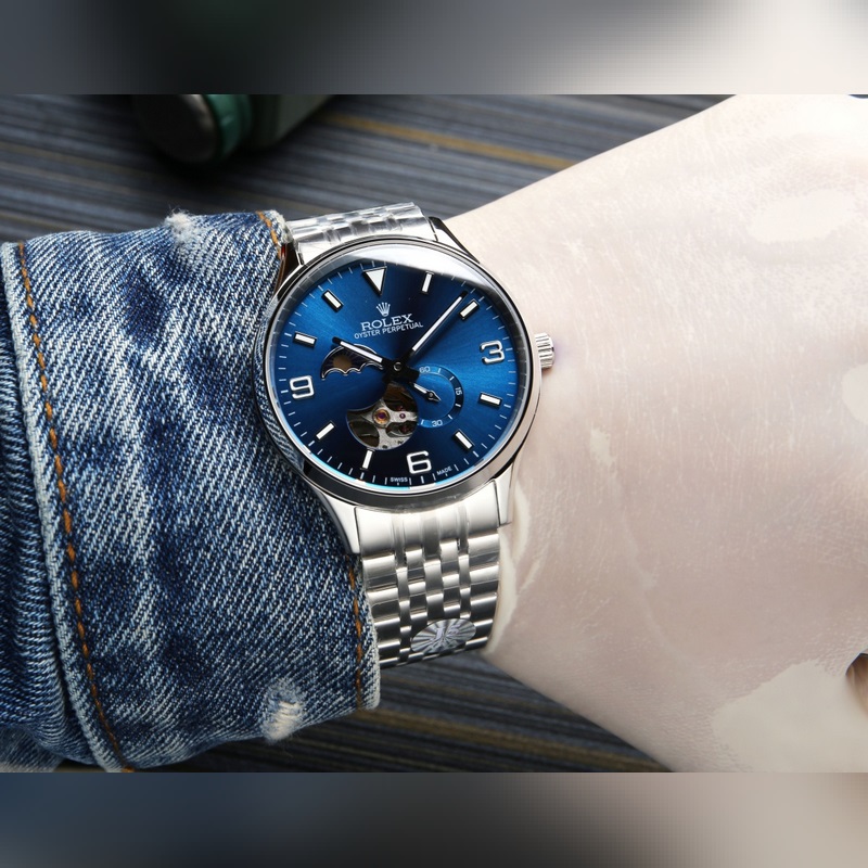 Rolex, Sun, Moon és Stars sorozat, az eredeti importált 82S7 szerkezettel (0 javítás és 0 vevőszolgálat), szuper-A rozsdamentes acél tokkal (finom kidolgozás, vízálló, 5 fokig vízálló) 5 fokig importált kannával. (finom kidolgozás és hibátlan, természetes fényben nagyon rétegzett, vakító.) 9 számjegyű személyre szabott 24 órás/valódi holdfázis kijelző, üreges kivitel, a mozgás működése akadálytalan, 5 számjegyű kis másodpercek. Dupla bo zafír üveg tükör, szuper fényhatású, olasz marhabőr, óraátmérő 40X11m. 5 fokos vízállóság