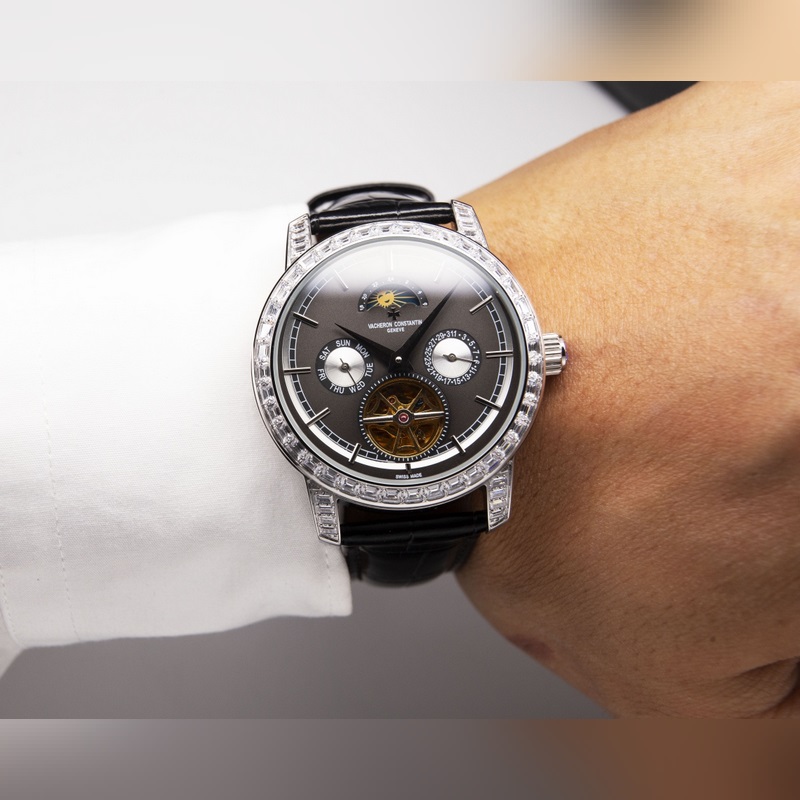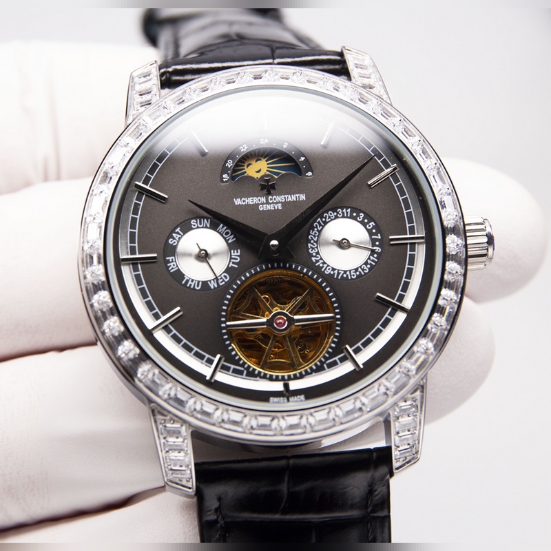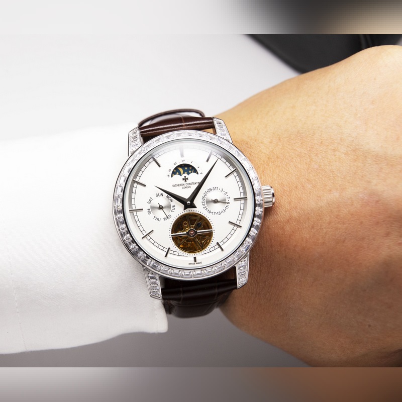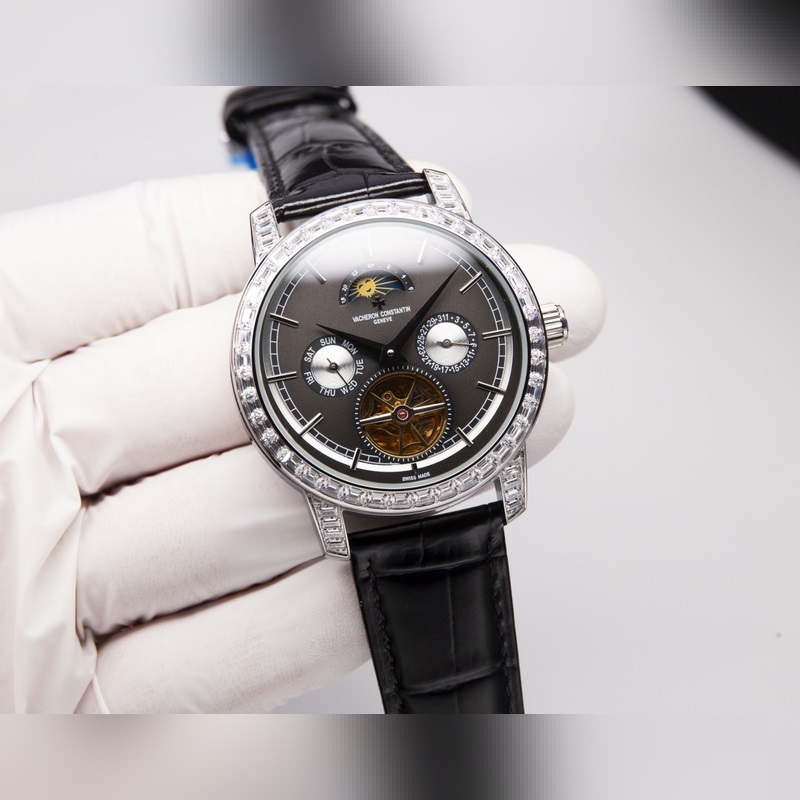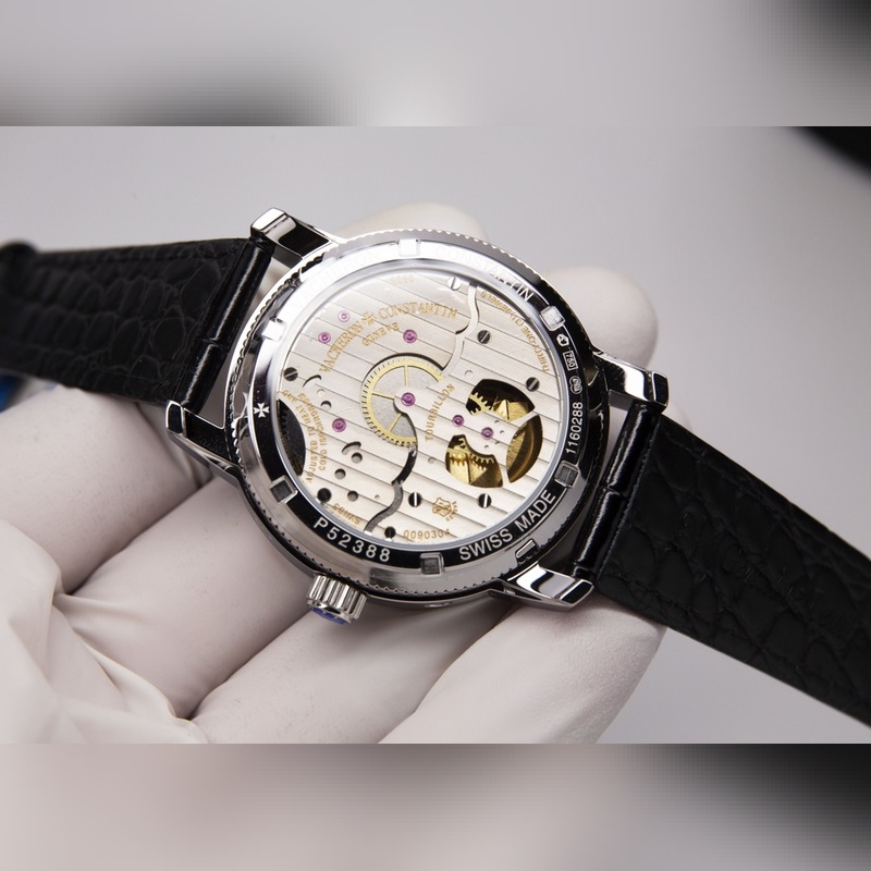 ③A tok importált 316-os rozsdamentes acélból készült. Importált borjúbőrrel párosítva. Eredeti Vacheron automata csat. Mérete 44 mm. Nagyon kemény ásványvizes üveg kristályüveg, szuper vízálló.