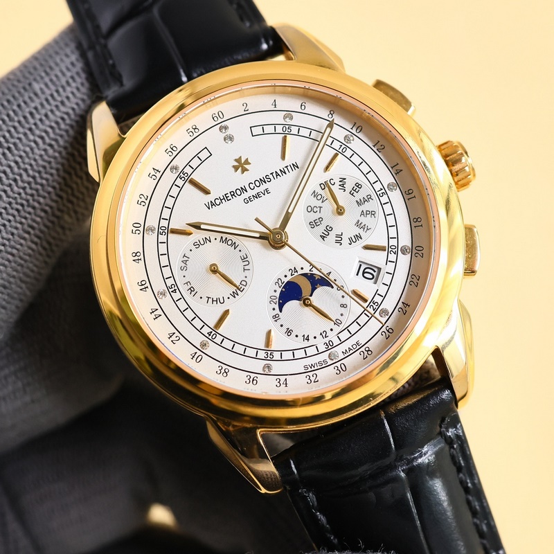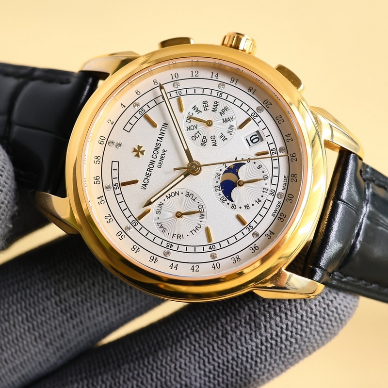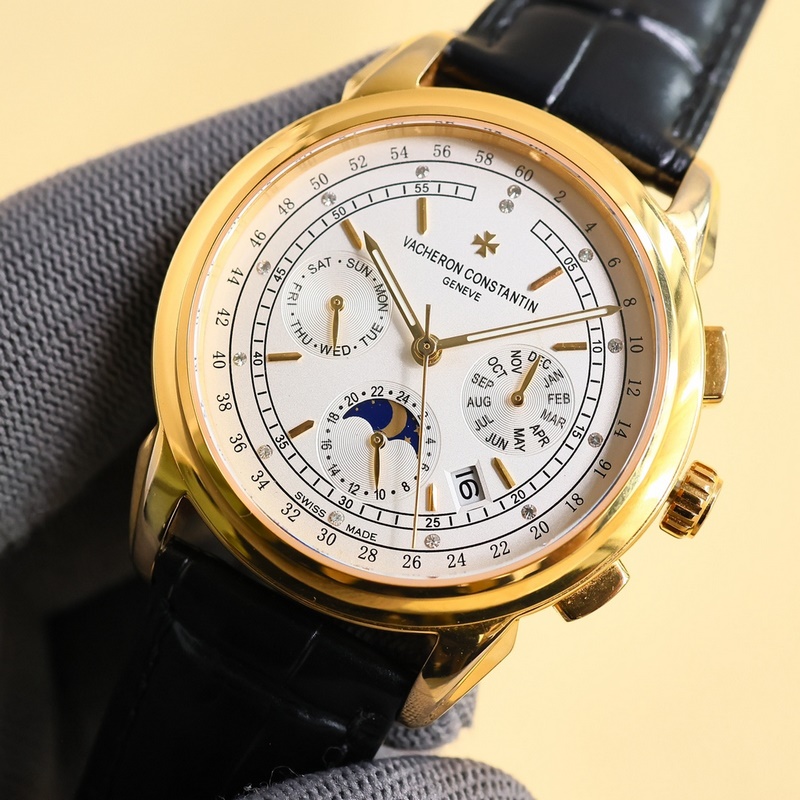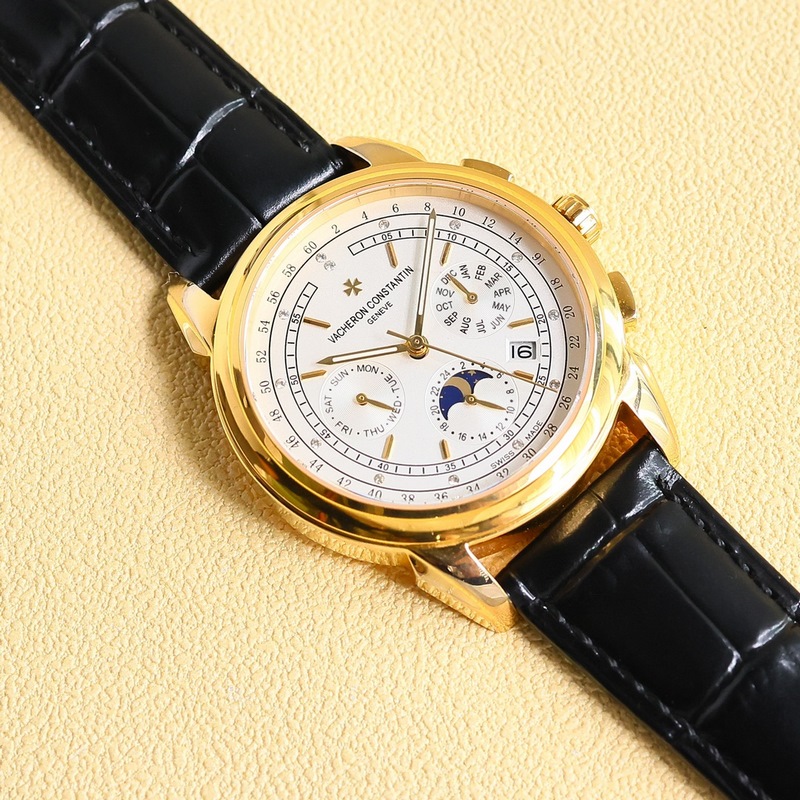 Vacheron Constantin öröknaptáros multifunkcionális karóra, egyedi kerek tok letisztult vonalaival és szépen kiegyensúlyozott arányaival, időtlen formai karóra. Minden funkció normálisan használható, az olasz marhabőrrel a csukló kényelmesebbé tétele érdekében, teljes mértékben megtestesíti a fejlett óragyártás legtisztább hagyományait, minden üzleti alkalomra alkalmas, egyszerű és kifinomult az elegancia elvesztése nélkül