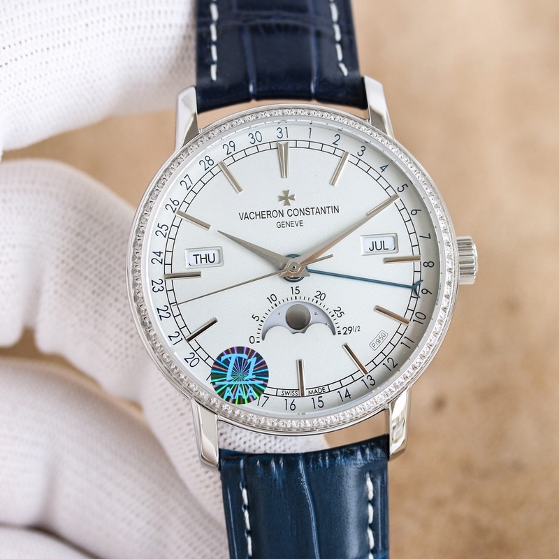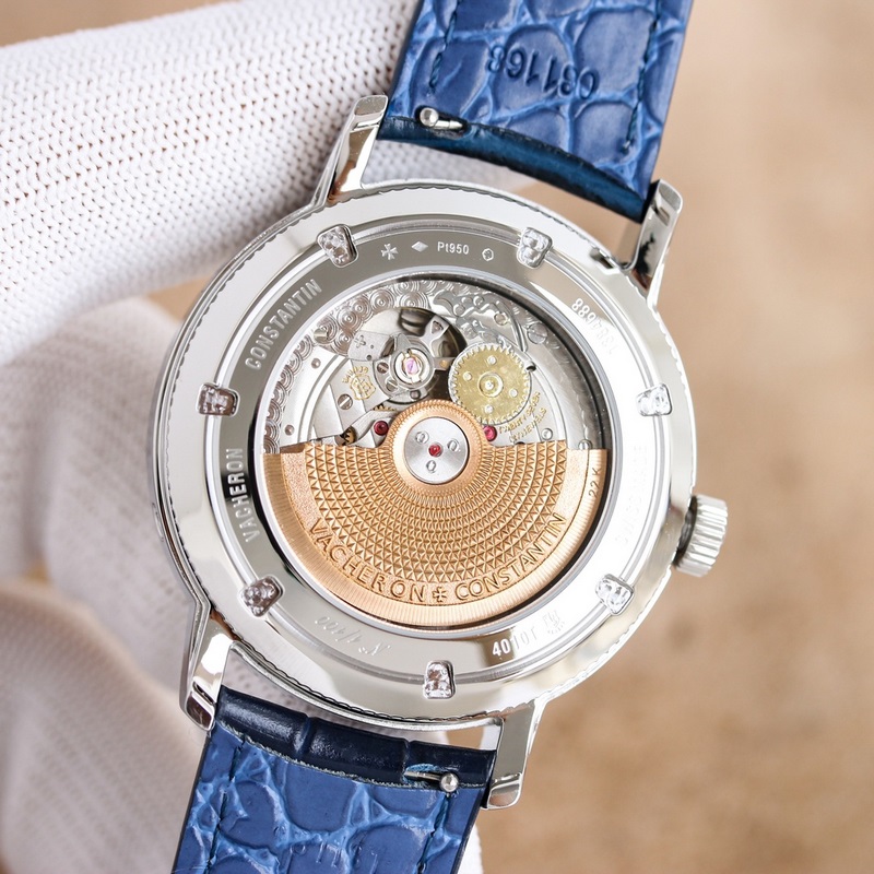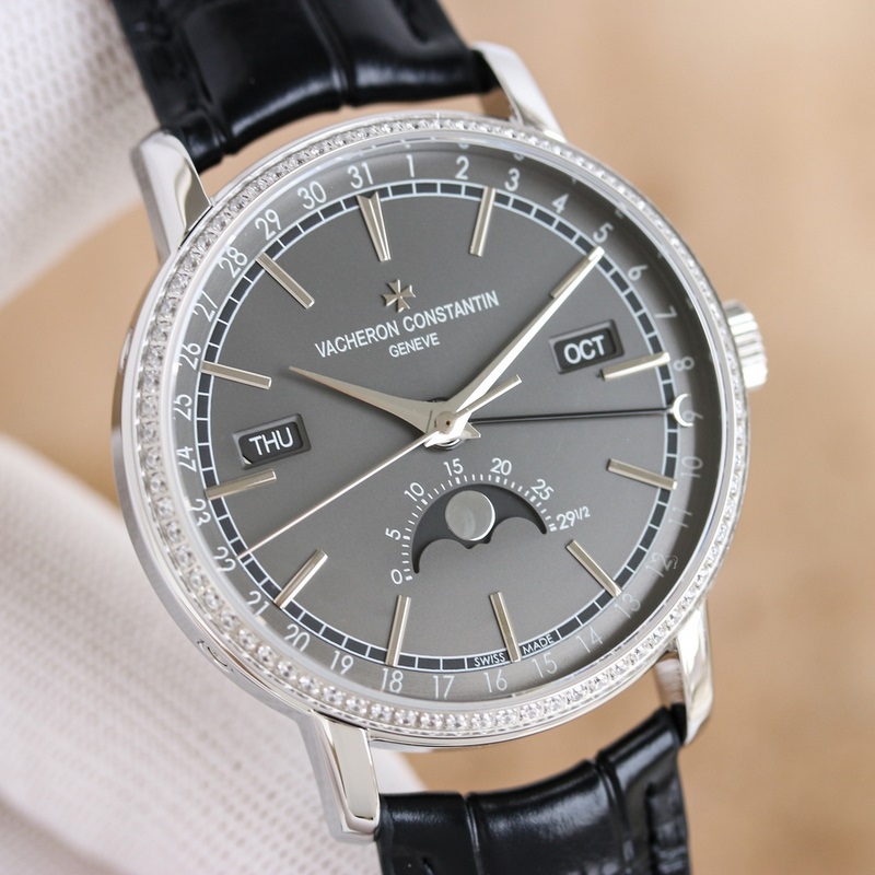 Tárcsa: A sávos percskála és a karamell stílusú óra- és percmutató megtartja az eredeti Vacheron Constantin ikonikus naptárkijelzőt. A nap és a hónap ablaka szimmetrikusan helyezkedik el a számlap két oldalán, a számlap külső szélén található digitális előlap pedig a naptárkijelző. Egy elegáns fekete félhold kéz finoman megemeli a könnyű olvashatóság érdekében. Az okos kialakítás megtöri a számlap tompaságát. Ez az elrendezés egyértelműen mutatja a holdfázis pontos kijelzését 6 órakor. Miközben megmutatja az intelligens varázsát, megmutatja az összetett gépezet egyedi szépségét is.